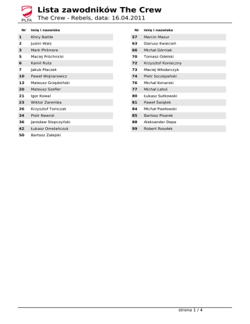 Lista zawodników The Crew The Crew - Rebels, data: 16.04.2011 Nr Imię i nazwisko Nr Imię i nazwisko 1 Khiry Battle 57 Marcin Mazur 2 Justin Walz 63 Dariusz Kwiecień 3 Mark Philmore 66 Michał Górniak 5 Maciej Próchnicki 70 Tomasz Odelski 6 Kamil Ruta 72 Krzysztof Konieczny 7 Jakub Płaczek 73 Maciej Włodarczyk 10 Paweł Wojnarowicz 74 Piotr Szczepański 13 Mateusz Grzędziński 76 Michał Konarski 20 Mateusz Szefler 77 Michał Latoś 21 Igor Kowal 80 Łukasz Sutkowski 23 Wiktor Zaremba 81 Paweł Świątek 26 Krzysztof Tomczak 84 Michał Pawłowski 34 Piotr Nawrot 85 Bartosz Pisarek 36 Jarosław Stopczyński 88 Aleksander Depa 42 Łukasz Omelańczuk 99 Robert Rosołek 50 Bartosz Zalejski strona 1 / 4 Lista zawodników The Crew The Crew - Rebels, data: 16.04.2011 Starterzy ATAK LT Starterzy OBRONA LE 50 Bartosz Zalejski LG 66 Michał Górniak DT 73 Maciej Włodarczyk C 76 Michał Konarski RE 99 Robert Rosołek RG 72 Krzysztof Konieczny LOLB 81 Paweł Świątek RT 77 Michał Latoś ILB 6 Kamil Ruta QB 2 Justin Walz ROLB 21 Igor Kowal WR 3 Mark Philmore CB 26 Krzysztof Tomczak RB 7 Jakub Płaczek CB 34 Piotr Nawrot WR 13 Mateusz Grzędziński S 1 Khiry Battle FB 42 Łukasz Omelańczuk DT 74 Piotr Szczepański TE 88 Aleksander Depa DT Pozycje SPECJALNE KR1 1 Khiry Battle KR2 3 Mark Philmore PR1 1 Khiry Battle PR2 3 Mark Philmore P K 6 Kamil Ruta H LS 76 Michał Konarski strona 2 / 4 Lista zawodników Rebels The Crew - Rebels, data: 16.04.2011 Nr Imię i nazwisko Nr Imię i nazwisko 1 Michał Kołek 48 Robert Płonka 2 Zbigniew Szrejber 50 Paweł Krzywdziak 5 Tomasz Grabas 51 MICHAŁ GŁOWALA 10 Patryk Stuchlik 52 Grzegorz Szklarz 11 Mateusz Iwan 54 Tomasz Konieczny 16 Łukasz Biedroń 58 Arkadiusz Kanicki 20 Piotr Miś 60 Jan Janota 21 Krzysztof Matejuk 65 Jonasz Długajczyk 22 Jakub Grabas 72 Piotr Kempny 24 Mateusz Bryła 75 Marek Białas 25 Łukasz Chrobok 81 Marcin Zapiór 31 Tomasz Tyczyński 82 Karol Skutela 33 Oskar Opitz 83 Brudka Symon 34 Mateusz Jasiński 85 Sebastian Botor 35 Grzegorz Suder 86 Maciej Pełczyński 37 Michał Czupryna 87 Paweł Szepiszczak 38 Lech Gluzicki 89 Kajetan Kamiński 40 Wojciech Wieczorek 90 Jarosław Jachułowski 41 Artur Loncierz 91 Maciej Wróbel 43 Piotr Nowak 93 Łukasz Gawenda 45 Michał Kozdrój 94 Radosław Baron 46 Piotr Saternus 95 Michał Króliczek 47 Marcin Gembala strona 3 / 4 Lista zawodników Rebels The Crew - Rebels, data: 16.04.2011 Starterzy ATAK Starterzy OBRONA LT 60 Jan Janota LE 94 Radosław Baron LG 65 Jonasz Długajczyk DT 91 Maciej Wróbel C 75 Marek Białas RE 93 Łukasz Gawenda RG 37 Michał Czupryna LOLB 22 Jakub Grabas RT 72 Piotr Kempny ILB 50 Paweł Krzywdziak QB 1 Michał Kołek ROLB 58 Arkadiusz Kanicki WR 2 Zbigniew Szrejber CB 41 Artur Loncierz RB 35 Grzegorz Suder CB 48 Robert Płonka TE 82 Karol Skutela S 5 Tomasz Grabas WR 87 Paweł Szepiszczak S 31 Tomasz Tyczyński TE 89 Kajetan Kamiński S 38 Lech Gluzicki Pozycje SPECJALNE KR1 2 Zbigniew Szrejber KR2 41 Artur Loncierz PR1 81 Marcin Zapiór PR2 2 Zbigniew Szrejber P 24 Mateusz Bryła K 83 Brudka Symon H 16 Łukasz Biedroń LS 65 Jonasz Długajczyk strona 4 / 4