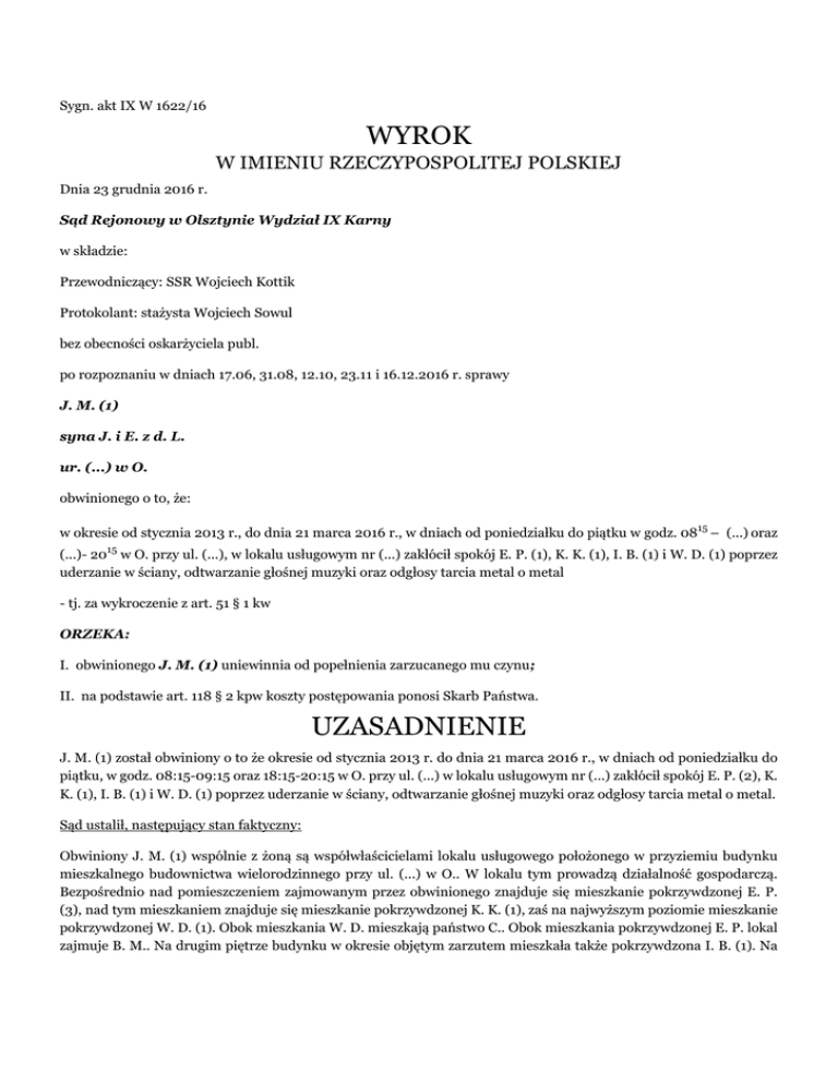 Sygn. akt IX W 1622/16 WYROK W IMIENIU RZECZYPOSPOLITEJ POLSKIEJ Dnia 23 grudnia 2016 r. Sąd Rejonowy w Olsztynie Wydział IX Karny w składzie: Przewodniczący: SSR Wojciech Kottik Protokolant: stażysta Wojciech Sowul bez obecności oskarżyciela publ. po rozpoznaniu w dniach 17.06, 31.08, 12.10, 23.11 i 16.12.2016 r. sprawy J. M. (1) syna J. i E. z d. L. ur. (...) w O. obwinionego o to, że: w okresie od stycznia 2013 r., do dnia 21 marca 2016 r., w dniach od poniedziałku do piątku w godz. 0815 – (...) oraz (...)- 2015 w O. przy ul. (...), w lokalu usługowym nr (...) zakłócił spokój E. P. (1), K. K. (1), I. B. (1) i W. D. (1) poprzez uderzanie w ściany, odtwarzanie głośnej muzyki oraz odgłosy tarcia metal o metal - tj. za wykroczenie z art. 51 § 1 kw ORZEKA: I. obwinionego J. M. (1) uniewinnia od popełnienia zarzucanego mu czynu; II. na podstawie art. 118 § 2 kpw koszty postępowania ponosi Skarb Państwa. UZASADNIENIE J. M. (1) został obwiniony o to że okresie od stycznia 2013 r. do dnia 21 marca 2016 r., w dniach od poniedziałku do piątku, w godz. 08:15-09:15 oraz 18:15-20:15 w O. przy ul. (...) w lokalu usługowym nr (...) zakłócił spokój E. P. (2), K. K. (1), I. B. (1) i W. D. (1) poprzez uderzanie w ściany, odtwarzanie głośnej muzyki oraz odgłosy tarcia metal o metal. Sąd ustalił, następujący stan faktyczny: Obwiniony J. M. (1) wspólnie z żoną są współwłaścicielami lokalu usługowego położonego w przyziemiu budynku mieszkalnego budownictwa wielorodzinnego przy ul. (...) w O.. W lokalu tym prowadzą działalność gospodarczą. Bezpośrednio nad pomieszczeniem zajmowanym przez obwinionego znajduje się mieszkanie pokrzywdzonej E. P. (3), nad tym mieszkaniem znajduje się mieszkanie pokrzywdzonej K. K. (1), zaś na najwyższym poziomie mieszkanie pokrzywdzonej W. D. (1). Obok mieszkania W. D. mieszkają państwo C.. Obok mieszkania pokrzywdzonej E. P. lokal zajmuje B. M.. Na drugim piętrze budynku w okresie objętym zarzutem mieszkała także pokrzywdzona I. B. (1). Na tym samym poziomie co lokal obwinionego znajduje się (...). T.. Naprzeciwko budynku w którym zlokalizowana jest m. in. (...) przy ul. (...) mieszkają A. G. (1) oraz L. D. (1). Na przełomie roku 2012 i 2013 obwiniony przeprowadził w lokalu prace remontowe aby przystosować go do prowadzenia ćwiczeń funkcjonalnych. Z powodu podjętych prac pokrzywdzona E. P. (2) w 2013 r. wniosła skargę do Państwowego Inspektora Nadzoru Budowlanego inicjując postępowanie administracyjne dotyczące prac remontowych przeprowadzonych przez obwinionego oraz montażu przez niego w stropie pomieszczenia haków niezbędnych do wykonywania ćwiczeń oraz rzekomego usunięcia podciągu wspierającego strop pomiędzy dwoma pomieszczeniami. Pokrzywdzona E. P. w dokumentach przekazanych do Nadzoru Budowlnego wskazywała, iż z powodu podjętych przez obwinionego prac w jej mieszkaniu powstały pęknięcia ścian. Postępowanie administracyjne w tym przedmiocie trwa do dnia dzisiejszego. Brak jest prawomocnego rozstrzygnięcia w tym zakresie. W postępowanie zaangażowane zostały różne instytucje państwowe – Straż Pożarna, Inspekcja Sanitarna, Inspekcja Pracy. W trakcie jego trwania Stacja Sanitarno – Epidemiologiczna w O. przeprowadziła w 2014 r. badanie celem ustalenia czy odgłosy zajęć prowadzonych w (...) dochodzą do mieszkań powyżej. Przeprowadzone badanie, wraz z symulacją ćwiczeń nie potwierdziły aby w mieszkaniu pokrzywdzonej E. P. słyszalne były jakiekolwiek dźwięki dochodzące z pomieszczeń(...). W czasie badań symulacja prowadzona była na wszystkich 10 pasach do ćwiczeń. Mimo to dźwięki w mieszkaniu pokrzywdzonej E. P. nie były słyszalne i badanie pomiaru ich głośności nie zostało przeprowadzone (sprawozdanie z pomiarów poziomu dźwięku k. 76-79). Obwiniony J. M. (1) w pomieszczeniach przy ul. (...) w O. prowadzi zajęcia sportowe – trening funkcjonalny, trening ogólnorozwojowy i trening przy zastosowaniu systemu (...) ćwiczenia prowadzone na specjalnych pasach mocowanych do sufitu. Ćwiczenia prowadzone są bezpośrednio z klientami, obwiniony jako trener na bieżąco udziela porad i instrukcji odnośnie wykonywanych ćwiczeń. Zajęcia odbywają się przy muzyce, której głośność jest tak ustawiona aby nie zakłócała przebiegu treningu i udzielanych instrukcji. W okresie od stycznia 2013 r. do 21 marca 2016 r. obwiniony prowadził zajęcia sportowe w godzinach od około 08:50-09:15 oraz po południu w godzinach 18:15-20:15. Treningi prowadzone były w dni powszednie. W dniu 16 marca 2016 r., o godz. 20:55 pokrzywdzona E. P. poinformowała dyżurnego K. o awanturze sąsiedzkiej. Przybyli na miejsce Policjanci zastali pokrzywdzoną E. P. oraz pokrzywdzoną K. K., które poinformowały, iż obwiniony od 2013 prowadzi w lokalu na najniższym poziomie (...). W czasie prowadzenia przez niego zajęć do mieszkań pokrzywdzonych dochodzą odgłosy muzyki, huki oraz drżą ściany. Pokrzywdzone wskazały, że obwiniony opuścił lokal przez przybiciem funkcjonariuszy i hałasy ustały. W dniu 18 marca 2016 r. około godz. 19:45 pokrzywdzone E. P., W. D. oraz K. K. zawiadomiły dyżurnego K. w O. o notorycznym zakłócaniu spokoju w czasie prowadzenia zajęć w (...) przez obwinionego J. M. (1) poprzez odtwarzanie głośnej muzyki, uderzenia w ściany ciężarkami, stukot, wrzaski i krzyki, przez które powstają wstrząsy budynku. Dodatkowo E. P. twierdziła, iż w jej kierunku padły obelżywe słowa, gdy zwróciła obwinionemu uwagę. Funkcjonariusze nie zastali obwinionego.(...) była zamknięta, nikogo nie było wewnątrz lokalu. (dowody: notatka urzędowa k. 2, k. 11, k. 17, k. 27, zawiadomienie o popełnieniu wykroczenia k. 15-16, k. 35-36, zdjęcia urządzeń do ćwiczeń k. 69-73, wydruk internetowy k. 74-75, kopia sprawozdania z pomiarów poziomu dźwięku i kopia pomiarów hałasu k. 76-79, skarga L. D. k. 83, pismo z Urzędu Mias