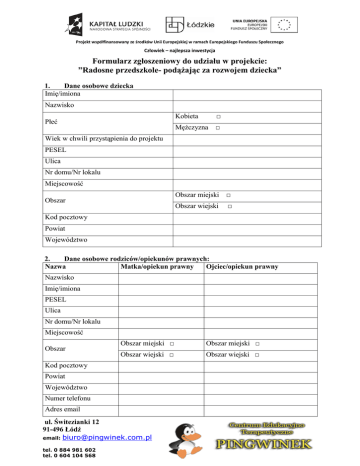 Projekt współfinansowany ze środków Unii Europejskiej w ramach Europejskiego Funduszu Społecznego Człowiek – najlepsza inwestycja Formularz zgłoszeniowy do udziału w projekcie: ”Radosne przedszkole- podążając za rozwojem dziecka” 1. Dane osobowe dziecka Imię/imiona Nazwisko Płeć Kobieta □ Mężczyzna □ Wiek w chwili przystąpienia do projektu PESEL Ulica Nr domu/Nr lokalu Miejscowość Obszar Obszar miejski □ Obszar wiejski □ Kod pocztowy Powiat Województwo 2. Dane osobowe rodziców/opiekunów prawnych: Nazwa Matka/opiekun prawny Ojciec/opiekun prawny Nazwisko Imię/imiona PESEL Ulica Nr domu/Nr lokalu Miejscowość Obszar Obszar miejski □ Obszar miejski □ Obszar wiejski □ Obszar wiejski □ Kod pocztowy Powiat Województwo Numer telefonu Adres email ul. Świtezianki 12 91-496 Łódź email: [email protected] tel. 0 884 981 602 tel. 0 604 104 568 Projekt współfinansowany ze środków Unii Europejskiej w ramach Europejskiego Funduszu Społecznego Człowiek – najlepsza inwestycja 3. Inne informacje o dziecku: Kryteria podstawowe (przy każdym pytaniu proszę zaznaczyć właściwy kwadrat) Czy dziecko zamieszkuje na terenie miasta Łódź lub powiatu zgierskiego? Tak □ Nie □ Czy dziecko korzystało z edukacji przedszkolnej? Tak □ Nie □ Czy dziecko posiada orzeczenie o PPP (o Tak □ Nie □ potrzebie kształcenia specjalnego) Jeśli tak prosimy o dołączenie kopii zaświadczenia do dokumentów rekrutacyjnych. Czy dziecko posiada orzeczenie o Tak □ Nie □ niepełnosprawności. Jeśli tak prosimy o dołączenie kopii zaświadczenie do dokumentów rekrutacyjnych. Czy rodzic/opiekun prawny samotnie wychowuje dziecko? 4. 5. Tak □ Nie □ Informacje dodatkowe o dziecku (stałe choroby, wady rozwojowe, alergie), które mogą wpłynąć na funkcjonowanie dziecka w przedszkolu: ………………………………………………………………………………………… ………………………………………………………………………………………… ………………………………………………………………………………………… ………………………………………………………………………………………… ………………………………………………………………………………………… Inne informacje, które mogą wskazywać na nieharmonijny rozwój dziecka (np. mowa, koncentracja, sprawność ruchowa) …................................................................................................................................... …................................................................................................................................... ….................................................................................................................................... ........................................................................................................................................ …..................................................................................................................................... …………………………………….. Miejscowość i data ………………………………………………. ……. ………………………………….… Czytelny podpis rodziców/opiekunów prawnych dziecka ul. Świtezianki 12 91-496 Łódź email: [email protected] tel. 0 884 981 602 tel. 0 604 104 568 Projekt współfinansowany ze środków Unii Europejskiej w ramach Europejskiego Funduszu Społecznego Człowiek – najlepsza inwestycja OŚWIADCZENIE 1. Oświadczam, że zapoznałem/am się z Regulaminem udziału w Projekcie „Radosne przedszkole podążając za rozwojem dziecka” i spełniam wymogi określone w ww. regulaminie (Kryteria uczestnictwa). 2. Oświadczam, że zostałem/am poinformowany/na, iż Projekt „Radosne przedszkole – podążając za rozwojem dziecka” jest współfinansowany przez Unię Europejską w ramach Europejskiego Funduszu Społecznego. 3. Zostałem/am uprzedzony/na o odpowiedzialności karnej z art.233 Kodeksu Karnego za złożenie nieprawdziwego oświadczenia lub zatajenia prawdy, niniejszym oświadczam, ze dane zawarte w niniejszym Formularzu zgłoszeniowym są zgodne z prawdą. …………………………………….. Miejscowość i data ………………………………………………. ……. ………………………………….… Czytelny podpis rodziców/opiekunów prawnych dziecka ul. Świtezianki 12 91-496 Łódź email: [email protected] tel. 0 884 981 602 tel. 0 604 104 568 Projekt współfinansowany ze środków Unii Europejskiej w ramach Europejskiego Funduszu Społecznego Człowiek – najlepsza inwestycja OŚWIADCZENIE UCZESTNIKA PROJEKTU W związku z przystąpieniem do projektu „Radosne przedszkole – podążając za rozwojem dziecka” oświadczam, że przyjmuję do wiadomości, iż: 1) administratorem moich danych osobowych jest Minister Rozwoju Regionalnego pełniący funkcję Instytucji Zarządzającej dla Programu Operacyjnego Kapitał Ludzki, mający siedzibę przy ul. Wspólnej 2/4, 00-926 Warszawa. 2) podstawę prawną przetwarzania moich danych osobowych stanowi art. 23 ust. 1 pkt 2 lub art. 27 ust. 2 pkt 2 ustawy z dnia 29 sierpnia 1997 r. o ochronie danych osobowych (tekst jednolity: Dz.U. z 2002 r. Nr 101 poz. 926, ze zm.) – dane osobowe są niezbędne dla realizacji Programu Operacyjnego Kapitał Ludzki 3) moje dane osobowe i mojego dziecka będą przetwarzane wyłącznie w celu udzielenia wsparcia, realizacji projektu „Radosne przedszkole –podążając za rozwojem dziecka”; ewaluacji, kontroli, monitoringu i sprawozdawczości w ramach Programu Operacyjnego Kapitał Ludzki (POKL); 4) moje dane osobowe i mojego dziecka zostały powierzone do przetwarzania Instytucji Pośredniczącej – Urząd Marszałkowski w Łodzi ul. Piłsudzkiego 8; 90-051 Łódź i beneficjentowi reali