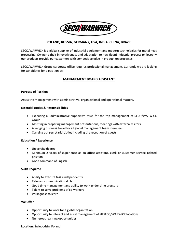 POLAND, RUSSIA, GERMANY, USA, INDIA, CHINA, BRAZIL SECO/WARWICK is a global supplier of industrial equipment and modern technologies for metal heat processing. Owing to their innovativeness and adaptation to new (lean) industrial process philosophy our products provide our customers with competitive edge in production processes. SECO/WARWICK Group corporate office requires professional management. Currently we are looking for candidates for a position of: MANAGEMENT BOARD ASSISTANT Purpose of Position Assist the Management with administrative, organizational and operational matters. Essential Duties & Responsibilities Executing all administrative supportive tasks for the top management of SECO/WARWICK Group Assisting in preparing management presentations, meetings with external visitors Arranging business travel for all global management team members Carrying out secretarial duties including the reception of guests Education / Experience University degree Minimum 2 years of experience as an office assistant, clerk or customer service related position Good command of English Skills Required Ability to execute tasks independently Relevant communication skills Good time management and ability to work under time pressure Talent to solve problems of co-workers Willingness to learn We Offer Opportunity to work for a global organization Opportunity to interact and assist management of all SECO/WARWICK locations Numerous learning opportunities Location: Świebodzin, Poland Please send resume to: [email protected] Please note we shall reply to selected offers only. Please enclose the following clause: „Wyrażam zgodę na przetwarzanie moich danych osobowych zawartych w mojej ofercie pracy, przez SECO/WARWICK S.A dla potrzeb niezbędnych do realizacji procesu rekrutacji (zgodnie z ustawą z dn. 29.08.1997 o Ochronie Danych Osobowych Dz.U. z 2002 r. Nr 101, poz. 926 z późn. zm.).” http://www.secowarwick.com/