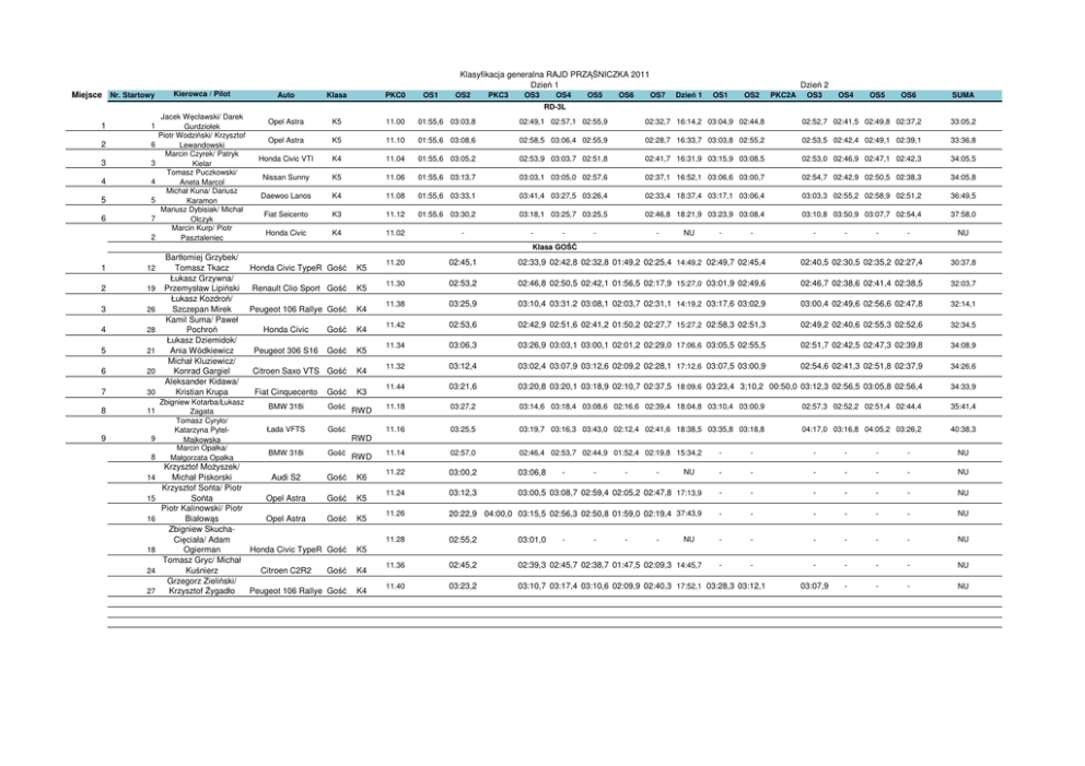 Klasyfikacja generalna RAJD PRZĄŚNICZKA 2011 Dzień 1 Miejsce Nr. Startowy Kierowca / Pilot Auto Klasa PKC0 OS1 OS2 PKC3 OS3 OS4 OS5 OS6 Dzień 2 OS7 Dzień 1 OS1 OS2 PKC2A OS3 OS4 OS5 OS6 SUMA RD-3L 1 1 2 6 3 3 4 4 5 5 6 7 2 Jacek Węcławski/ Darek Gurdziołek Piotr Wodziński/ Krzysztof Lewandowski Marcin Czyrek/ Patryk Kielar Tomasz Puczkowski/ Aneta Marcol Michał Kuna/ Dariusz Karamon Mariusz Dybisiak/ Michał Olczyk Marcin Kurp/ Piotr Pasztaleniec Opel Astra K5 11.00 01:55,6 03:03,8 02:49,1 02:57,1 02:55,9 02:32,7 16:14,2 03:04,9 02:44,8 02:52,7 02:41,5 02:49,8 02:37,2 33:05,2 Opel Astra K5 11.10 01:55,6 03:08,6 02:58,5 03:06,4 02:55,9 02:28,7 16:33,7 03:03,8 02:55,2 02:53,5 02:42,4 02:49,1 02:39,1 33:36,8 Honda Civic VTI K4 11.04 01:55,6 03:05,2 02:53,9 03:03,7 02:51,8 02:41,7 16:31,9 03:15,9 03:08,5 02:53,0 02:46,9 02:47,1 02:42,3 34:05,5 Nissan Sunny K5 11.06 01:55,6 03:13,7 03:03,1 03:05,0 02:57,6 02:37,1 16:52,1 03:06,6 03:00,7 02:54,7 02:42,9 02:50,5 02:38,3 34:05,8 Daewoo Lanos K4 11.08 01:55,6 03:33,1 03:41,4 03:27,5 03:26,4 02:33,4 18:37,4 03:17,1 03:06,4 03:03,3 02:55,2 02:58,9 02:51,2 36:49,5 Fiat Seicento K3 11.12 01:55,6 03:30,2 03:18,1 03:25,7 03:25,5 02:46,8 18:21,9 03:23,9 03:08,4 03:10,8 03:50,9 03:07,7 02:54,4 37:58,0 Honda Civic K4 11.02 - - - - - NU - - - - - - NU Klasa GOŚĆ 1 12 2 19 3 26 4 28 5 21 6 20 7 30 8 9 Bartłomiej Grzybek/ Tomasz Tkacz Łukasz Grzywna/ Przemysław Lipiński Łukasz Kozdroń/ Szczepan Mirek Kamil Suma/ Paweł Pochroń Łukasz Dziemidok/ Ania Wódkiewicz Michał Kluziewicz/ Konrad Gargiel Aleksander Kidawa/ Kristian Krupa Zbigniew Kotarba/Łukasz 11 Zagata Tomasz Cyryło/ Katarzyna Pytel9 Majkowska Marcin Opałka/ 8 Małgorzata Opałka 14 15 16 18 24 27 Honda Civic TypeR Gość K5 Renault Clio Sport Gość K5 Peugeot 106 Rallye Gość K4 Honda Civic Gość K4 Peugeot 306 S16 Gość K5 Citroen Saxo VTS Gość K4 Fiat Cinquecento Gość K3 BMW 318i Gość RWD Łada VFTS Gość 11.20 02:45,1 02:33,9 02:42,8 02:32,8 01:49,2 02:25,4 14:49,2 02:49,7 02:45,4 02:40,5 02:30,5 02:35,2 02:27,4 30:37,8 11.30 02:53,2 02:46,8 02:50,5 02:42,1 01:56,5 02:17,9 15:27,0 03:01,9 02:49,6 02:46,7 02:38,6 02:41,4 02:38,5 32:03,7 11.38 03:25,9 03:10,4 03:31.2 03:08,1 02:03,7 02:31,1 14:19,2 03:17,6 03:02,9 03:00,4 02:49,6 02:56,6 02:47,8 32:14,1 11.42 02:53,6 02:42,9 02:51,6 02:41,2 01:50,2 02:27,7 15:27,2 02:58,3 02:51,3 02:49,2 02:40,6 02:55,3 02:52,6 32:34,5 11.34 03:06,3 03:26,9 03:03,1 03:00,1 02:01,2 02:29,0 17:06,6 03:05,5 02:55,5 02:51,7 02:42,5 02:47,3 02:39,8 34:08,9 11.32 03:12,4 03:02,4 03:07,9 03:12,6 02:09,2 02:28,1 17:12,6 03:07,5 03:00,9 02:54,6 02:41,3 02:51,8 02:37,9 34:26,6 11.44 03:21,6 03:20,8 03:20,1 03:18,9 02:10,7 02:37,5 18:09,6 03:23,4 3;10,2 00:50,0 03:12,3 02:56,5 03:05,8 02:56,4 34:33,9 11.18 03:27,2 03:14,6 03:18,4 03:08,6 02:16,6 02:39,4 18:04,8 03:10,4 03:00,9 02:57,3 02:52,2 02:51,4 02:44,4 35:41,4 11.16 03:25,5 03:19,7 03:16,3 03:43,0 02:12,4 02:41,6 18:38,5 03:35,8 03:18,8 04:17,0 03:16,8 04:05,2 03:26,2 40:38,3 11.14 02:57,0 02:46,4 02:53,7 02:44,9 01:52,4 02:19,8 15:34,2 - - - - - - NU 11.22 03:00,2 03:06,8 - - - - - - NU 11.24 03:12,3 03:00,5 03:08,7 02:59,4 02:05,2 02:47,8 17:13,9 - - - - - - NU 11.26 20:22,9 04:00,0 03:15,5 02:56,3 02:50,8 01:59,0 02:19,4 37:43,9 - - - - - - NU 11.28 02:55,2 03:01,0 - - - - - - NU 11.36 02:45,2 02:39,3 02:45,7 02:38,7 01:47,5 02:09,3 14:45,7 - - - - - - NU 11.40 03:23,2 03:10,7 03:17,4 03:10,6 02:09,9 02:40,3 17:52,1 03:28,3 03:12,1 03:07,9 - - - NU RWD BMW 318i Krzysztof Możyszek/ Michał Piskorski Audi S2 Krzysztof Sońta/ Piotr Sońta Opel Astra Piotr Kalinowski/ Piotr Białowąs Opel Astra Zbigniew SkuchaCięciała/ Adam Ogierman Honda Civic TypeR Tomasz Gryc/ Michał Kuśnierz Citroen C2R2 Grzegorz Zieliński/ Krzysztof Żygadło Peugeot 106 Rallye Gość RWD Gość K6 Gość K5 Gość K5 Gość K5 Gość K4 Gość K4 - - - - - - - - NU NU