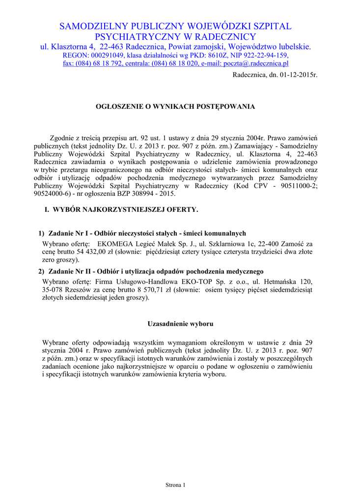 SAMODZIELNY PUBLICZNY WOJEWÓDZKI SZPITAL PSYCHIATRYCZNY W RADECZNICY ul. Klasztorna 4, 22-463 Radecznica, Powiat zamojski, Województwo lubelskie. REGON: 000291049, klasa działalności wg PKD: 8610Z, NIP 922-22-94-159, fax: (084) 68 18 792, centrala: (084) 68 18 020, e-mail: [email protected] Radecznica, dn. 01-12-2015r. OGŁOSZENIE O WYNIKACH POSTĘPOWANIA Zgodnie z treścią przepisu art. 92 ust. 1 ustawy z dnia 29 stycznia 2004r. Prawo zamówień publicznych (tekst jednolity Dz. U. z 2013 r. poz. 907 z późn. zm.) Zamawiający - Samodzielny Publiczny Wojewódzki Szpital Psychiatryczny w Radecznicy, ul. Klasztorna 4, 22-463 Radecznica zawiadamia o wynikach postępowania o udzielenie zamówienia prowadzonego w trybie przetargu nieograniczonego na odbiór nieczystości stałych- śmieci komunalnych oraz odbiór i utylizację odpadów pochodzenia medycznego wytwarzanych przez Samodzielny Publiczny Wojewódzki Szpital Psychiatryczny w Radecznicy (Kod CPV - 90511000-2; 90524000-6) - nr ogłoszenia BZP 308994 - 2015. I. WYBÓR NAJKORZYSTNIEJSZEJ OFERTY. 1) Zadanie Nr I - Odbiór nieczystości stałych - śmieci komunalnych Wybrano ofertę: EKOMEGA Legieć Małek Sp. J., ul. Szklarniowa 1c, 22-400 Zamość za cenę brutto 54 432,00 zł (słownie: pięćdziesiąt cztery tysiące czterysta trzydzieści dwa złote zero groszy). 2) Zadanie Nr II - Odbiór i utylizacja odpadów pochodzenia medycznego Wybrano ofertę: Firma Usługowo-Handlowa EKO-TOP Sp. z o.o., ul. Hetmańska 120, 35-078 Rzeszów za cenę brutto 8 570,71 zł (słownie: osiem tysięcy pięćset siedemdziesiąt złotych siedemdziesiąt jeden groszy). Uzasadnienie wyboru Wybrane oferty odpowiadają wszystkim wymaganiom określonym w ustawie z dnia 29 stycznia 2004 r. Prawo zamówień publicznych (tekst jednolity Dz. U. z 2013 r. poz. 907 z późn. zm.) oraz w specyfikacji istotnych warunków zamówienia i zostały w poszczególnych zadaniach ocenione jako najkorzystniejsze w oparciu o podane w ogłoszeniu o zamówieniu i specyfikacji istotnych warunków zamówienia kryteria wyboru. Strona 1 II. NAZWY (FIRMY), SIEDZIBY I ADRESY WYKONAWCÓW, KTÓRZY ZŁOŻYLI OFERTY. Nr oferty 1 Firma (nazwa) lub imię i nazwisko oraz adres siedziby lub miejsce zamieszkania Firma Usługowo-Handlowa EKO-TOP Sp. z o.o., 35-078 Rzeszów, ul. Hetmańska 120 2 EKOMEGA Legieć Małek Sp. J., 22-400 Zamość, ul. Szklarniowa 1c 3 ECO-ABC Sp. z o.o., 97-400 Bełchatów, ul. Przemysłowa 7 III. STRESZCZENIE OCENY I PORÓWNANIA ZŁOŻONYCH OFERT. Ceny złożonych ważnych ofert oraz kolejność ważnych ofert wg kryterium ceny (Zadanie Nr I) oraz punkty przyznane ważnym ofertom w poszczególnych kryteriach oraz łączna punktacja (Zadanie Nr II). 1) Zadanie Nr I - Odbiór nieczystości stałych - śmieci komunalnych Lp. 1. Nr Firma (nazwa) lub imię i nazwisko oraz adres siedziby lub miejsce oferty zamieszkania 2 EKOMEGA Legieć Małek Sp. J., 22-400 Zamość, ul. Szklarniowa 1c Kryterium Cena brutto 54 432,00 zł 2) Zadanie Nr II - Odbiór i utylizacja odpadów pochodzenia medycznego Kryterium Cena brutto Kryterium Zasada bliskości Łączna ilość punktów Nr oferty Firma (nazwa) lub imię i nazwisko oraz adres siedziby lub miejsce zamieszkania 1. 1 Firma Usługowo-Handlowa EKO-TOP Sp. z o.o., 35-078 Rzeszów, ul. Hetmańska 120 95,00 4,10 99,10 2. 3 ECO-ABC Sp. z o.o., 97-400 Bełchatów, ul. Przemysłowa 7 63,49 5,00 68,49 Lp. IV. TERMIN, OKREŚLONY ZGODNIE Z ART. 94 UST. 1 LUB 2 USTAWY PRAWO ZAMÓWIEŃ PUBLICZNYCH, PO KTÓREGO UPŁYWIE UMOWA W SPRAWIE ZAMÓWIENIA PUBLICZNEGO MOŻE BYĆ ZAWARTA. Umowa w sprawie zamówienia publicznego może być zawarta w terminie od dnia 07 grudnia 2015 roku. Strona 2