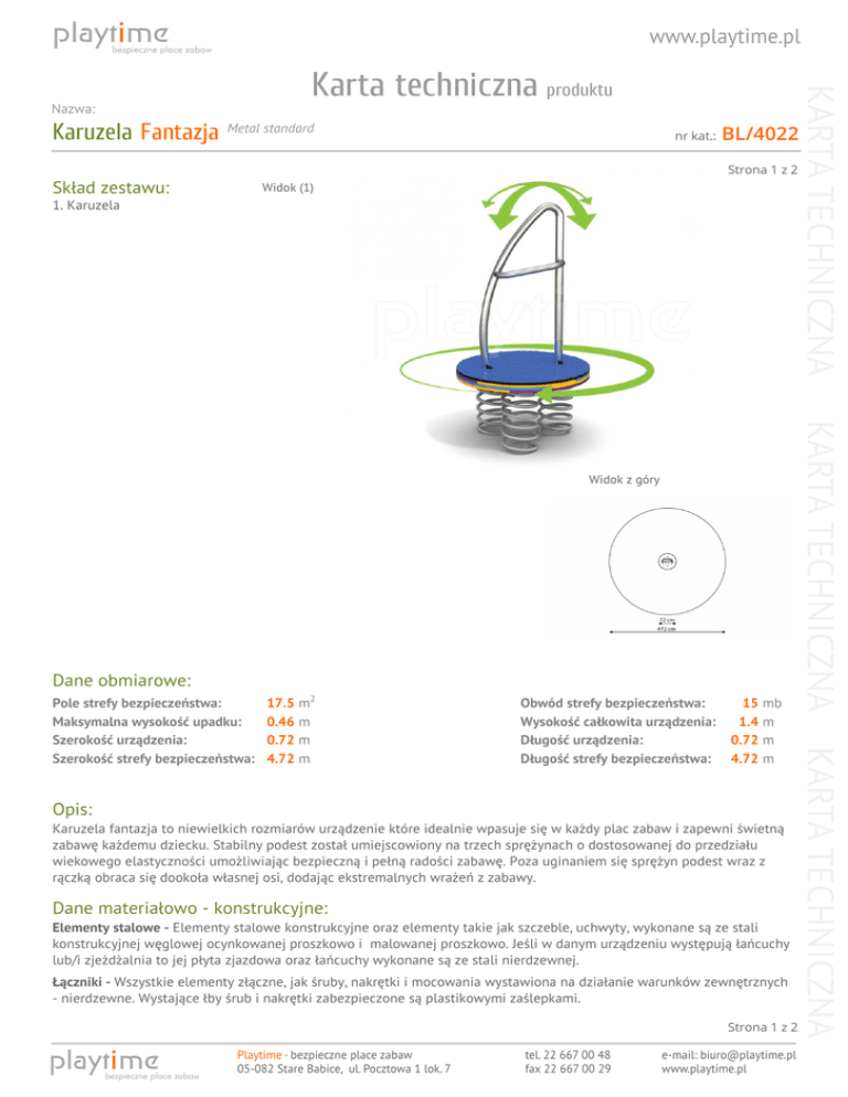 playtime www.playtime.pl bezpieczne place zabaw Karuzela Fantazja Metal standard nr kat.: BL/4022 Strona 1 z 2 Skład zestawu: Widok (1) 1. Karuzela Dane obmiarowe: 17.5 m2 0.46 m 0.72 m 4.72 m Obwód strefy bezpieczeństwa: Wysokość całkowita urządzenia: Długość urządzenia: Długość strefy bezpieczeństwa: 15 mb 1.4 m 0.72 m 4.72 m Opis: Karuzela fantazja to niewielkich rozmiarów urządzenie które idealnie wpasuje się w każdy plac zabaw i zapewni świetną zabawę każdemu dziecku. Stabilny podest został umiejscowiony na trzech sprężynach o dostosowanej do przedziału wiekowego elastyczności umożliwiając bezpieczną i pełną radości zabawę. Poza uginaniem się sprężyn podest wraz z rączką obraca się dookoła własnej osi, dodając ekstremalnych wrażeń z zabawy. Dane materiałowo - konstrukcyjne: Elementy stalowe - Elementy stalowe konstrukcyjne oraz elementy takie jak szczeble, uchwyty, wykonane są ze stali konstrukcyjnej węglowej ocynkowanej proszkowo i malowanej proszkowo. Jeśli w danym urządzeniu występują łańcuchy lub/i zjeżdżalnia to jej płyta zjazdowa oraz łańcuchy wykonane są ze stali nierdzewnej. Łączniki - Wszystkie elementy złączne, jak śruby, nakrętki i mocowania wystawiona na działanie warunków zewnętrznych - nierdzewne. Wystające łby śrub i nakrętki zabezpieczone są plastikowymi zaślepkami. Strona 1 z 2 playtime bezpieczne place zabaw Playtime - bezpieczne place zabaw 05-082 Stare Babice, ul. Pocztowa 1 lok. 7 tel. 22 667 00 48 fax 22 667 00 29 e-mail: [email protected] www.playtime.pl KARTA TECHNICZNA Pole strefy bezpieczeństwa: Maksymalna wysokość upadku: Szerokość urządzenia: Szerokość strefy bezpieczeństwa: KARTA TECHNICZNA Widok z góry KARTA TECHNICZNA Karta techniczna produktu Nazwa: playtime www.playtime.pl bezpieczne place zabaw Karuzela Fantazja Metal standard nr kat.: BL/4022 Strona 2 z 2 Dachy, siedziska, zabezpieczenia - Daszki, siedziska oraz zabezpieczenia wykonane są z kolorowych płyt polietylenowych HDPE całkowicie odpornych na działanie warunków atmosferycznych. Płyty nie wymagają konserwacji, nie pękają, ulegają rozwarstwieniu, oraz długo zachowują żywe kolory. Podesty - Podesty występujące w zestawach i urządzeniach typu domki, pojazdy, ... wykonane są z płyt antypoślizgowych. W niektórych urządzeniach zastosowane zostały także elementy gumowe. Podesty występujące w karuzelach - płyta ryflowana, aluminiowa. KARTA TECHNICZNA Karta techniczna produktu Nazwa: KARTA TECHNICZNA playtime bezpieczne place zabaw Powered by TCPDF (www.tcpdf.org) Playtime - bezpieczne place zabaw 05-082 Stare Babice, ul. Pocztowa 1 lok. 7 tel. 22 667 00 48 fax 22 667 00 29 e-mail: [email protected] www.playtime.pl KARTA TECHNICZNA Strona 2 z 2