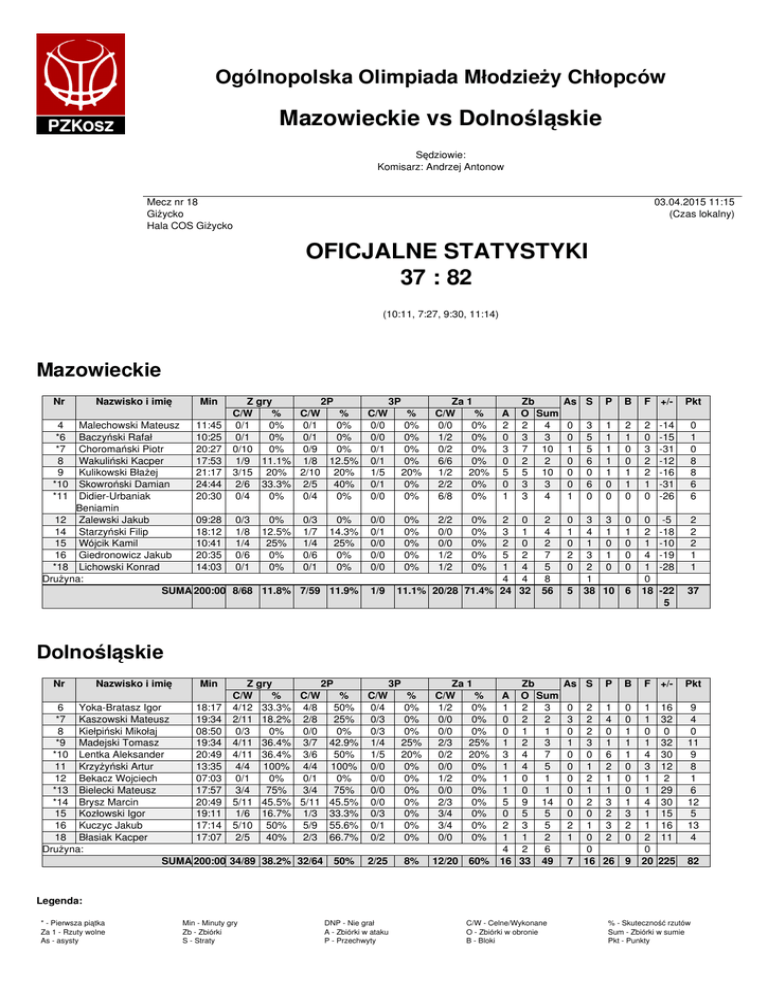 Ogólnopolska Olimpiada Młodzieży Chłopców Mazowieckie vs Dolnośląskie Sędziowie: Komisarz: Andrzej Antonow Mecz nr 18 Giżycko Hala COS Giżycko 03.04.2015 11:15 (Czas lokalny) OFICJALNE STATYSTYKI 37 : 82 (10:11, 7:27, 9:30, 11:14) Mazowieckie Nr Nazwisko i imię Min 4 *6 *7 8 9 *10 *11 Malechowski Mateusz 11:45 Baczyński Rafał 10:25 Choromański Piotr 20:27 Wakuliński Kacper 17:53 Kulikowski Błażej 21:17 Skowroński Damian 24:44 Didier-Urbaniak 20:30 Beniamin 12 Zalewski Jakub 09:28 14 Starzyński Filip 18:12 15 Wójcik Kamil 10:41 16 Giedronowicz Jakub 20:35 *18 Lichowski Konrad 14:03 Drużyna: SUMA 200:00 Z gry 2P 3P C/W % C/W % C/W % 0/1 0% 0/1 0% 0/0 0% 0/1 0% 0/1 0% 0/0 0% 0/10 0% 0/9 0% 0/1 0% 1/9 11.1% 1/8 12.5% 0/1 0% 3/15 20% 2/10 20% 1/5 20% 2/6 33.3% 2/5 40% 0/1 0% 0/4 0% 0/4 0% 0/0 0% Za 1 C/W % 0/0 0% 1/2 0% 0/2 0% 6/6 0% 1/2 20% 2/2 0% 6/8 0% 0/3 1/8 1/4 0/6 0/1 2/2 0/0 0/0 1/2 1/2 0% 12.5% 25% 0% 0% 0/3 1/7 1/4 0/6 0/1 0% 14.3% 25% 0% 0% 0/0 0/1 0/0 0/0 0/0 8/68 11.8% 7/59 11.9% 1/9 0% 0% 0% 0% 0% 0% 0% 0% 0% 0% A 2 0 3 0 5 0 1 Zb O Sum 2 4 3 3 7 10 2 2 5 10 3 3 3 4 2 0 3 1 2 0 5 2 1 4 4 4 11.1% 20/28 71.4% 24 32 2 4 2 7 5 8 56 As S P B F +/- Pkt 0 0 1 0 0 0 1 3 5 5 6 0 6 0 1 1 1 1 1 0 0 2 1 0 0 1 1 0 2 0 3 2 2 1 0 -14 -15 -31 -12 -16 -31 -26 0 1 0 8 8 6 6 0 1 0 2 0 3 3 4 1 1 0 3 1 2 0 1 38 10 0 1 0 0 0 -5 -18 -10 -19 -28 2 2 2 1 1 6 0 2 1 4 1 0 18 -22 5 37 P B F +/- Pkt 2 1 2 4 2 0 3 1 0 6 1 2 2 1 1 1 2 3 0 2 1 3 0 2 0 16 26 0 0 1 1 1 0 0 0 1 3 2 0 1 1 0 1 4 3 1 1 4 1 1 2 0 20 16 32 0 32 30 12 2 29 30 15 16 11 9 4 0 11 9 8 1 6 12 5 13 4 225 82 5 Dolnośląskie Nr Nazwisko i imię Min Z gry 2P 3P C/W % C/W % C/W % 4/12 33.3% 4/8 50% 0/4 0% 2/11 18.2% 2/8 25% 0/3 0% 0/3 0% 0/0 0% 0/3 0% 4/11 36.4% 3/7 42.9% 1/4 25% 4/11 36.4% 3/6 50% 1/5 20% 4/4 100% 4/4 100% 0/0 0% 0/1 0% 0/1 0% 0/0 0% 3/4 75% 3/4 75% 0/0 0% 5/11 45.5% 5/11 45.5% 0/0 0% 1/6 16.7% 1/3 33.3% 0/3 0% 5/10 50% 5/9 55.6% 0/1 0% 2/5 40% 2/3 66.7% 0/2 0% 6 Yoka-Bratasz Igor 18:17 *7 Kaszowski Mateusz 19:34 8 Kiełpiński Mikołaj 08:50 *9 Madejski Tomasz 19:34 *10 Lentka Aleksander 20:49 11 Krzyżyński Artur 13:35 12 Bekacz Wojciech 07:03 *13 Bielecki Mateusz 17:57 *14 Brysz Marcin 20:49 15 Kozłowski Igor 19:11 16 Kuczyc Jakub 17:14 18 Błasiak Kacper 17:07 Drużyna: SUMA 200:00 34/89 38.2% 32/64 50% 2/25 8% Za 1 C/W % 1/2 0% 0/0 0% 0/0 0% 2/3 25% 0/2 20% 0/0 0% 1/2 0% 0/0 0% 2/3 0% 3/4 0% 3/4 0% 0/0 0% 12/20 60% Zb A O Sum 1 2 3 0 2 2 0 1 1 1 2 3 3 4 7 1 4 5 1 0 1 1 0 1 5 9 14 0 5 5 2 3 5 1 1 2 4 2 6 16 33 49 As S 0 3 0 1 0 0 0 0 0 0 2 1 7 9 Legenda: * - Pierwsza piątka Za 1 - Rzuty wolne As - asysty Powered by TCPDF (www.tcpdf.org) Min - Minuty gry Zb - Zbiórki S - Straty DNP - Nie grał A - Zbiórki w ataku P - Przechwyty C/W - Celne/Wykonane O - Zbiórki w obronie B - Bloki % - Skuteczność rzutów Sum - Zbiórki w sumie Pkt - Punkty