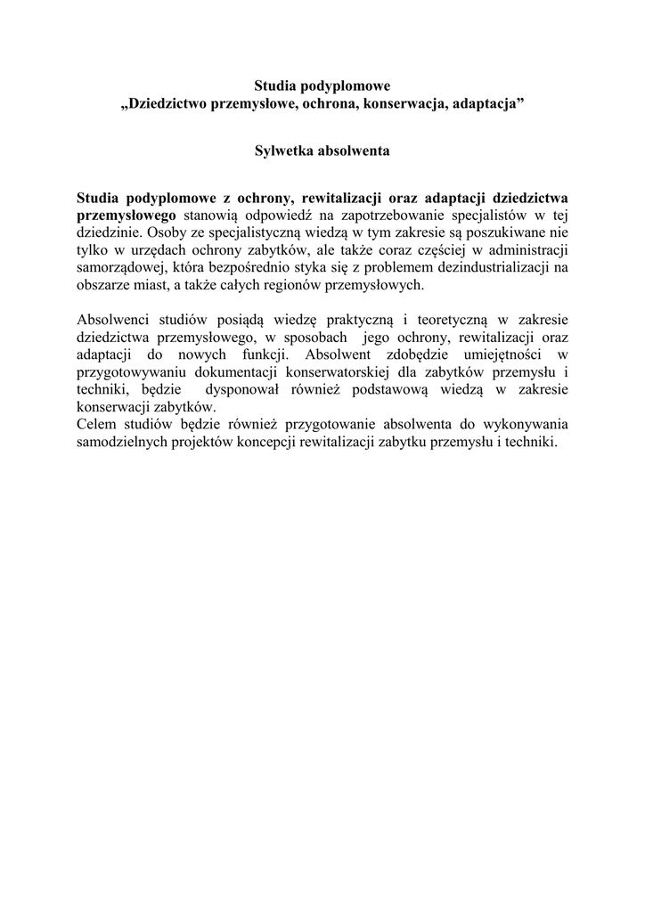 Studia podyplomowe „Dziedzictwo przemysłowe, ochrona, konserwacja, adaptacja” Sylwetka absolwenta Studia podyplomowe z ochrony, rewitalizacji oraz adaptacji dziedzictwa przemysłowego stanowią odpowiedź na zapotrzebowanie specjalistów w tej dziedzinie. Osoby ze specjalistyczną wiedzą w tym zakresie są poszukiwane nie tylko w urzędach ochrony zabytków, ale także coraz częściej w administracji samorządowej, która bezpośrednio styka się z problemem dezindustrializacji na obszarze miast, a także całych regionów przemysłowych. Absolwenci studiów posiądą wiedzę praktyczną i teoretyczną w zakresie dziedzictwa przemysłowego, w sposobach jego ochrony, rewitalizacji oraz adaptacji do nowych funkcji. Absolwent zdobędzie umiejętności w przygotowywaniu dokumentacji konserwatorskiej dla zabytków przemysłu i techniki, będzie dysponował również podstawową wiedzą w zakresie konserwacji zabytków. Celem studiów będzie również przygotowanie absolwenta do wykonywania samodzielnych projektów koncepcji rewitalizacji zabytku przemysłu i techniki.