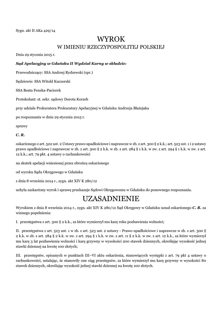 Sygn. akt II AKa 429/14 WYROK W IMIENIU RZECZYPOSPOLITEJ POLSKIEJ Dnia 29 stycznia 2015 r. Sąd Apelacyjny w Gdańsku II Wydział Karny w składzie: Przewodniczący: SSA Andrzej Rydzewski (spr.) Sędziowie: SSA Witold Kuczorski SSA Beata Fenska-Paciorek Protokolant: st. sekr. sądowy Dorota Korzeb przy udziale Prokuratora Prokuratury Apelacyjnej w Gdańsku Andrzeja Błażejaka po rozpoznaniu w dniu 29 stycznia 2015 r. sprawy C. R. oskarżonego z art. 522 ust. 2 Ustawy prawo upadłościowe i naprawcze w zb. z art. 300 § 2 k.k.; art. 523 ust. 1 i 2 ustawy prawo upadłościowe i naprawcze w zb. z art. 300 § 2 k.k. w zb. z art. 284 § 1 k.k. w zw. z art. 294 § 1 k.k. w zw. z art. 12 k.k.; art. 79 pkt. 4 ustawy o rachunkowości na skutek apelacji wniesionej przez obrońcę oskarżonego od wyroku Sądu Okręgowego w Gdańsku z dnia 8 września 2014 r., sygn. akt XIV K 280/12 uchyla zaskarżony wyrok i sprawę przekazuje Sądowi Okręgowemu w Gdańsku do ponownego rozpoznania. UZASADNIENIE Wyrokiem z dnia 8 września 2014 r., sygn. akt XIV K 280/12 Sąd Okręgowy w Gdańsku uznał oskarżonego C. R. za winnego popełnienia: I. przestępstwa z art. 300 § 2 k.k., za które wymierzył mu karę roku pozbawienia wolności; II. przestępstwa z art. 523 ust. 1 w zb. z art. 523 ust. 2 ustawy - Prawo upadłościowe i naprawcze w zb. z art. 300 § 2 k.k. w zb. z art. 284 § 2 k.k. w zw. z art. 294 § 1 k.k. w zw. z art. 11 § 2 k.k. w zw. z art. 12 k.k., za które wymierzył mu karę 3 lat pozbawienia wolności i karę grzywny w wysokości 200 stawek dziennych, określając wysokość jednej stawki dziennej na kwotę 100 złotych; III. przestępstw, opisanych w punktach III–VI aktu oskarżenia, stanowiących występki z art. 79 pkt 4 ustawy o rachunkowości, ustalając, że stanowiły one ciąg przestępstw, za które wymierzył mu karę grzywny w wysokości 80 stawek dziennych, określając wysokość jednej stawki dziennej na kwotę 100 złotych. Łącząc orzeczone wobec C. R. jednostkowe kary pozbawienia wolności i grzywny, Sąd Okręgowy wymierzył oskarżonemu kary łączne: 3 lat i 3 miesięcy pozbawienia wolności i 250 stawek dziennych grzywny, przyjmując wysokość jednej stawki dziennej za równoważną kwocie 100 złotych. Sąd Okręgowy zasądził ponadto od C. R. na rzecz pokrzywdzonego (...) Sp. z o. o. w W. kwotę 170 670,61 zł tytułem naprawienia szkody wyrządzonej przestępstwem, a także rozstrzygnął o kosztach procesu, obciążając nimi częściowo oskarżonego. *** Apelację od powyższego wyroku złożył obrońca C. R., zarzucając Sądowi Okręgowemu obrazę przepisów postępowania polegającą na prowadzeniu rozprawy pod nieobecność oskarżonego, który nie został o niej prawidłowo zawiadomiony. W uzasadnieniu wniesionego środka odwoławczego skarżący podniósł, że C. R. nie został prawidłowo zawiadomiony o terminie rozprawy wyznaczonym na dzień 22 lipca 2013 r., co wobec faktu, iż sąd procedował w trybie zwyczajnym, a obecność oskarżonego na rozprawie była obowiązkowa (art. 374 § 1 k.p.k.), skutkowało zaistnieniem w niniejszej sprawie bezwzględnej przyczyny odwoławczej, o której mowa w art. 439 § 1 pkt 11 k.p.k. Apelujący wskazał, że na rozprawie w dniu 24 czerwca 2013 r. przewodniczący składu orzekającego zarządził o wezwaniu oskarżonego na rozprawę w dniu 22 lipca 2013 r. Na tejże rozprawie uznał natomiast, iż C. R. został wezwany prawidłowo i korzystając z trybu przewidzianego w art. 377 § 3 k.p.k., prowadził rozprawę pod nieobecność oskarżonego. Tymczasem, jak twierdzi obrońca, wezwanie na rozprawę w dniu 22 lipca 2013 r. zostało odebrane przez C. R. dopiero w dniu 23 lipca 2013 r., a wśród dokumentów znajdujących się w aktach sprawy brak jest takich, które potwierdzałyby prawidłowe zawiadomienie oskarżonego o tymże terminie przed dniem, w którym się ona odbyła. Obrońca wskazał ponadto, że na rozprawie w dniu 22 lipca 2013 r. został przesłuchany w charakterze świadka K. P., składający obciążające oskarżonego zeznania, które następnie stały się podstawą poczynionych przez Sąd Okręgowy ustaleń faktycznych. Dodatkowo obrońca wskazał również w uzasadnieniu skargi odwoławczej, że nie został on zawiadomiony o terminie rozprawy wyznaczonym na dzień 24 czerwca 2013 r., na której był nieobecny, w związku z czym doszło do naruszenia art. 117 § 2 k.p.k. oraz art. 6 k.p.k. gwarantującego oskarżonemu prawo do obrony. Powołując się na powyższe okoliczności, obrońca oskarżonego wniósł o skierowanie sprawy na posiedzenie oraz uchylenie zaskarżonego wyroku i przekazanie sprawy Sądowi pierwszej instancji do ponownego rozpoznania. Sąd Apelacyjny zważył, co następuje : Apelacja jest oczywiście zasadna, co pozwoliło rozpoznać ją na posiedzeniu w trybie art. 439 § 3 k.p.k. Zaskarżony wyrok wydano z rażącą obrazą, przywołanych w apelacji, przepisów prawa procesowego – art. 374 § 1 k.p.k. i art. 377 § 3 k.p.k., która w konsekwencji doprowadziła do zaistnienia bezwzględnej przyczyny odwoławczej wskazanej w art. 439 § 1 pkt 11 k.p.k. Nie ulega wątpliwości, że sprawa oskarżonego C. R. toczyła się w trybie postępowania zwyczajnego. Bezsporny jest także fakt, że na mocy zarządzenia z dnia 26 lutego 2013 r. doszło pierwotnie do wyznaczenia następujących terminów rozpraw: 15 kwietnia, 20 maja, 27 maja, 3 czerwca i 24 czerwca 2013 r. (k. 2736), o których oskarżony został zawiadomiony. Na rozprawie w dniu 20 maja 2013 r. C. R. złożył wyjaśnienia, po czym wniósł o prowadzenie dalszej rozprawy pod jego nieobecność. Wobec tego Sąd Okręgowy postanowił prowadzić rozprawę w trybie art. 377 § 3 k.p.k. (k. 2823). Oskarżony nie stawił się również na terminy rozprawy w dniach 27 maja oraz 3 i 24 czerwca 2013 r. (k. 2852, 2866, 2928), które Sąd Okręgowy także prowadził pod jego nieobecność. Równocześnie niekwestionowane są da