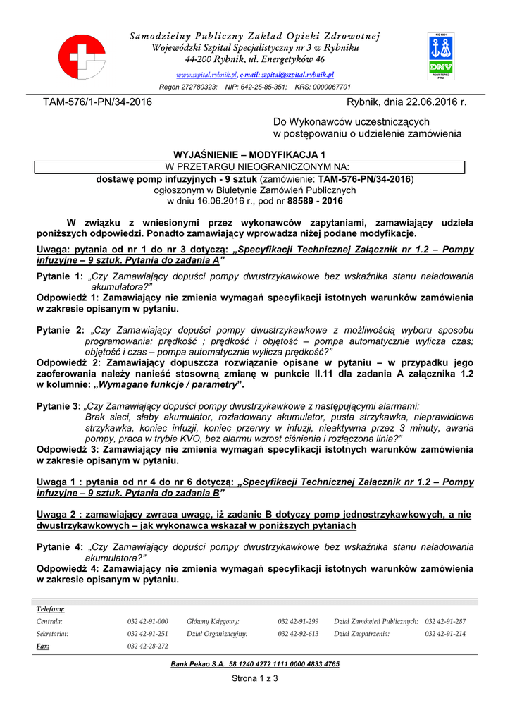 S a m o d z ie l n y P u b l ic zn y Z a k ł a d O p ie k i Zdr o w o t n e j Wojewódzki Szpital Specjalistyczny nr 3 w Rybniku 44-200 Rybnik, ul. Energetyków 46 www.szpital.rybnik.pl, e-mail: [email protected] Regon 272780323; NIP: 642-25-85-351; KRS: 0000067701 TAM-576/1-PN/34-2016 Rybnik, dnia 22.06.2016 r. Do Wykonawców uczestniczących w postępowaniu o udzielenie zamówienia WYJAŚNIENIE – MODYFIKACJA 1 W PRZETARGU NIEOGRANICZONYM NA: dostawę pomp infuzyjnych - 9 sztuk (zamówienie: TAM-576-PN/34-2016) ogłoszonym w Biuletynie Zamówień Publicznych w dniu 16.06.2016 r., pod nr 88589 - 2016 W związku z wniesionymi przez wykonawców zapytaniami, zamawiający udziela poniższych odpowiedzi. Ponadto zamawiający wprowadza niżej podane modyfikacje. Uwaga: pytania od nr 1 do nr 3 dotyczą: „Specyfikacji Technicznej Załącznik nr 1.2 – Pompy infuzyjne – 9 sztuk. Pytania do zadania A” Pytanie 1: „Czy Zamawiający dopuści pompy dwustrzykawkowe bez wskaźnika stanu naładowania akumulatora?” Odpowiedź 1: Zamawiający nie zmienia wymagań specyfikacji istotnych warunków zamówienia w zakresie opisanym w pytaniu. Pytanie 2: „Czy Zamawiający dopuści pompy dwustrzykawkowe z możliwością wyboru sposobu programowania: prędkość ; prędkość i objętość – pompa automatycznie wylicza czas; objętość i czas – pompa automatycznie wylicza prędkość?” Odpowiedź 2: Zamawiający dopuszcza rozwiązanie opisane w pytaniu – w przypadku jego zaoferowania należy nanieść stosowną zmianę w punkcie II.11 dla zadania A załącznika 1.2 w kolumnie: „Wymagane funkcje / parametry”. Pytanie 3: „Czy Zamawiający dopuści pompy dwustrzykawkowe z następującymi alarmami: Brak sieci, słaby akumulator, rozładowany akumulator, pusta strzykawka, nieprawidłowa strzykawka, koniec infuzji, koniec przerwy w infuzji, nieaktywna przez 3 minuty, awaria pompy, praca w trybie KVO, bez alarmu wzrost ciśnienia i rozłączona linia?” Odpowiedź 3: Zamawiający nie zmienia wymagań specyfikacji istotnych warunków zamówienia w zakresie opisanym w pytaniu. Uwaga 1 : pytania od nr 4 do nr 6 dotyczą: „Specyfikacji Technicznej Załącznik nr 1.2 – Pompy infuzyjne – 9 sztuk. Pytania do zadania B” Uwaga 2 : zamawiający zwraca uwagę, iż zadanie B dotyczy pomp jednostrzykawkowych, a nie dwustrzykawkowych – jak wykonawca wskazał w poniższych pytaniach Pytanie 4: „Czy Zamawiający dopuści pompy dwustrzykawkowe bez wskaźnika stanu naładowania akumulatora?” Odpowiedź 4: Zamawiający nie zmienia wymagań specyfikacji istotnych warunków zamówienia w zakresie opisanym w pytaniu. Telefony: Centrala: 032 42-91-000 Główny Księgowy: 032 42-91-299 Dział Zamówień Publicznych: 032 42-91-287 Sekretariat: 032 42-91-251 Dział Organizacyjny: 032 42-92-613 Dział Zaopatrzenia: 032 42-91-214 Fax: 032 42-28-272 Bank Pekao S.A. 58 1240 4272 1111 0000 4833 4765 Strona 1 z 3 Pytanie 5: „Czy Zamawiający dopuści pompy dwustrzykawkowe z możliwością wyboru sposobu programowania: prędkość ; prędkość i objętość – pompa automatycznie wylicza czas; objętość i czas – pompa automatycznie wylicza prędkość?” Odpowiedź 5: Zamawiający dopuszcza rozwiązanie opisane w pytaniu – w przypadku jego zaoferowania należy nanieść stosowną zmianę w punkcie II.11 dla zadania B załącznika 1.2 w kolumnie: „Wymagane funkcje / parametry”. Pytanie 6: „Czy Zamawiający dopuści pompy dwustrzykawkowe z następującymi alarmami: Brak sieci, słaby akumulator, rozładowany akumulator, pusta strzykawka, nieprawidłowa strzykawka, koniec infuzji, koniec przerwy w infuzji, nieaktywna przez 3 minuty, awaria pompy, praca w trybie KVO, bez alarmu wzrost ciśnienia i rozłączona linia?” Odpowiedź 6: Zamawiający nie zmienia wymagań specyfikacji istotnych warunków zamówienia w zakresie opisanym w pytaniu. Uwaga: pytania od nr 7 do nr 10 dotyczą: „ZAŁĄCZNIKA NR 1.3 – WARUNKI GWARANCJI JAKOŚCI I SERWISU” Pytanie 7: „dotyczy pkt. 4. Zwracamy się z prośbą o dodanie zapisu: >>W przypadku, gdy naprawa będzie wymagać sprowadzenia części zamiennych z zagranicy termin usunięcia usterki będzie wynosił 14 dni roboczych.” Pytanie 8: „dotyczy pkt. 5 Zwracamy się z prośbą o odstąpienie od wymogu dostarczenia sprzętu zastępczego na czas naprawy.” Pytanie 9: „dotyczy pkt. 6 i 7 Zwracamy się z prośbą o zamianę zapisów w ww. punktach na zapis o następującej treści: >>Wymiana uszkodzonego podzespołu na nowy podzespół po 3 naprawach gwarancyjnych tego samego podzespołu.<< Wymiana na nowe całego urządzenia (pkt. 7), w przypadku dwukrotnej naprawy jednego z jego elementów, nie znajduje racjonalnego uzasadnienia. Powszechna praktyka postępowania w przypadku częstych napraw danej części, modułu, czy podzespołu obejmuje wymianę jedynie takiego elementu na nowy po wystąpieniu określonej liczby awarii. Wymiana całego urządzenia na nowe, wydaje się być działaniem całkowicie niewspółmiernym w stosunku do zaistniałej szkody (wady podzespołu). Również z finansowego punktu widzenia pozostawienie ww. zapisu w wersji niezmienionej musiałoby oznaczać wielokrotny wzrost ryzyka poniesienia wysokich kosztów przez wykonawców, co zaskutkować musiałoby znaczącym wzrostem cen oferowanych wyrobów. W efekcie będzie to więc niekorzystne także dla Zamawiającego.” Odpowiedź 7-9: Zamawiający nie zmienia wymagań specyfikacji istotnych warunków zamówienia w zakresie załącznika nr 1.3 opisanym w pytaniu. Pytanie 10: „Czy Zamawiający potwierdza, że gwarancja na urządzenia medyczne nie obejmuje przypadków naturalnego zużycia się (na skutek korzystania z nich przez użytkownika) akcesoriów, części i materiałów /elementów zużywalnych (eksploatacyjnych), a także wyrobów jednorazowego użytku wchodzących w skład przedmiotu umowy, a w szczególności, że nie znajdują do nich zastosowania zapisy dotycząc
