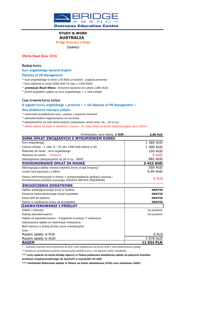 STUDY & WORK AUSTRALIA Bridge Business College (Sydney) Oferta Road Show 2016 Rodzaj kursu Kurs angielskiego General English Diploma of HR Management * kurs angielskiego w cenie 170 AUD za tydzień (zajęcia poranne) * kurs Diploma w cenie 5200 AUD (4 raty x 1300 AUD) * promocja Road Show: zniesione wpisowe do szkoły (200 AUD) * przed wyjazdem opłata za kurs angielskiego + 1 rata college Czas trwania kursu (wizy) 8 tygodni kursu angielskiego + przerwa + 1 rok Diploma of HR Management + dwa dodatkowe miesiące pobytu * możliwość przedłużenia wizy i pobytu z poziomu Australii * zakwaterowanie organizowane na życzenie * ubezpieczenie na cały okres pobytu (szacowany okres wizy: ok.. 18 m-cy) * oferta ważna na zapis w terminie 1 marca - 31 maja 2016 na kursy rozpoczynające się w 2016 r. Orientacyjny kurs waluty 1 AUD 3,00 PLN SUMA OPŁAT ZWIĄZANYCH Z WYKUPIENIEM KURSU Kurs angielskiego Czesne college - 1 rata, II - IV raty 1300 AUD płatne w AU Materiały do nauki - kurs angielskiego Wpisowe do szkoły - zniesione Obowiązkowe ubezpieczenie na 18 m-cy OSHC PODSUMOWANIE OPŁAT ZA NAUKĘ Obowiązująca opłata wizowa ustalona przez Urząd Imigracji Credit Card payment (1,08%) 1 360 AUD 1 300 AUD 100 AUD 0 AUD 662 AUD 3 422 AUD 550 AUD 5,94 AUD Koszty administracyjne w Polsce + przeprowadzenie aplikacji wizowej i monitorowanie procesu wizowego (OPŁATA 490 PLN ZNIESIONA) 0 PLN ŚWIADCZENIA DODATKOWE Opieka polskojęzycznego biura w Sydney GRATIS Otwarcie konta bankowego przed wyjazdem GRATIS Karta SIM do telefonu GRATIS Pomoc w znalezieniu pracy po przyjeździe GRATIS ZAKWATEROWANIE I PRZELOT Odbiór z lotniska na życzenie Rodzaj zakwaterowania na życzenie Opłata za zakwaterowanie - 4 tygodnie w pokoju 2 osobowym Jednorazowa opłata za rezerwacje mieszkania Bilet lotniczy w jedną stronę (cena orientacyjna) Inne Razem opłaty w PLN Razem opłaty w AUD RAZEM * 0 PLN 3 978 AUD 11 934 PLN końcowa wartość jest przeliczona na PLN i jest uzależniona od kursu AUD z dnia dokonywania wpłaty ** kosztorys przedstawia jedynie orientacyjną wartość kursu i nie stanowi oferty handlowej *** przy wpłacie na konto Bridge Agency w Polsce pobierana dodatkowa opłata na pokrycie kosztów przelewu międzynarodowego do Australii w wysokości 45 AUD *** możliwość dokonania wpłaty w Polsce na konto złotówkowe (PLN) oraz walutowe (AUD)