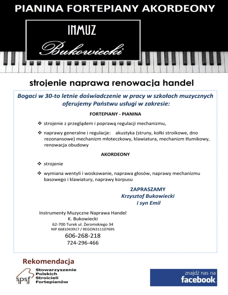 strojenie naprawa renowacja handel Bogaci w 30-to letnie doświadczenie w pracy w szkołach muzycznych oferujemy Państwu usługi w zakresie: FORTEPIANY - PIANINA strojenie z przeglądem i poprawą regulacji mechanizmu, naprawy generalne i regulacje: akustyka (struny, kołki stroikowe, dno rezonansowe) mechanizm młoteczkowy, klawiatura, mechanizm tłumikowy, renowacja obudowy AKORDEONY strojenie wymiana wentyli i woskowanie, naprawa głosów, naprawy mechanizmu basowego i klawiatury, naprawy korpusu ZAPRASZAMY Krzysztof Bukowiecki i syn Emil Instrumenty Muzyczne Naprawa Handel K. Bukowiecki 62-700 Turek ul. Żeromskiego 34 NIP 6681043917 / REGON311107695 606-268-218 724-296-466 Rekomendacja