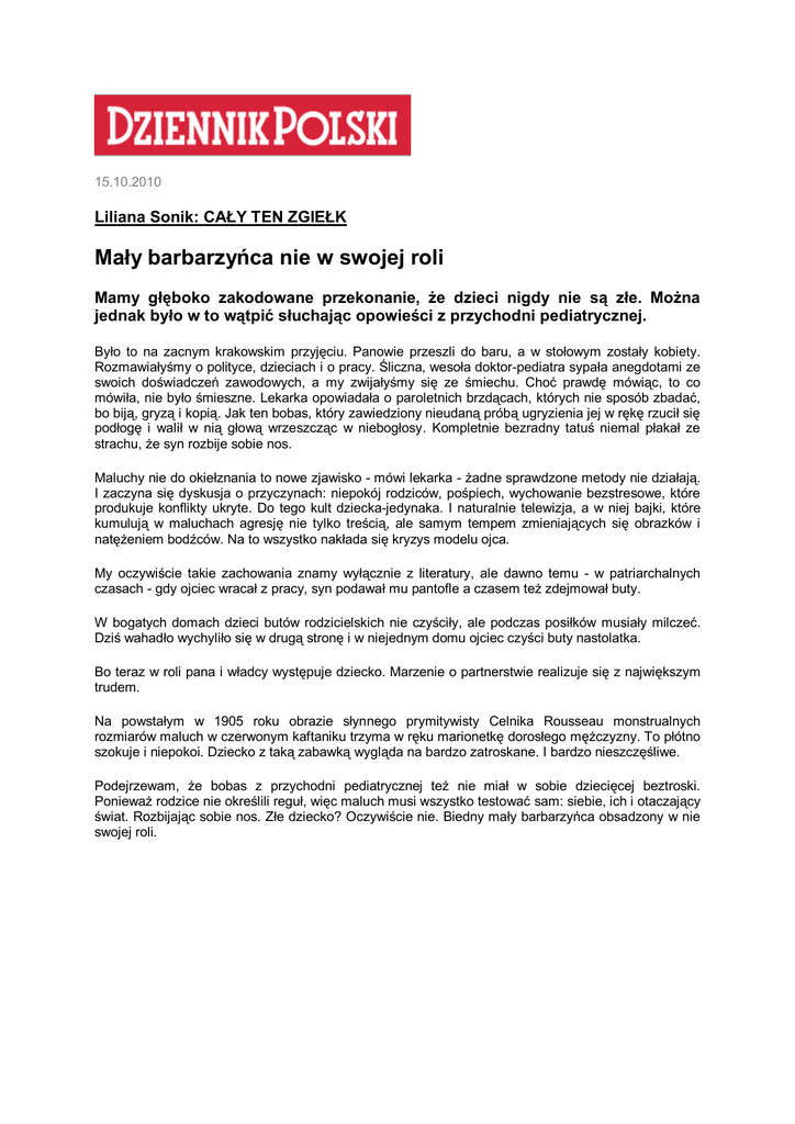 15.10.2010 Liliana Sonik: CAŁY TEN ZGIEŁK Mały barbarzyńca nie w swojej roli Mamy głęboko zakodowane przekonanie, że dzieci nigdy nie są złe. Można jednak było w to wątpić słuchając opowieści z przychodni pediatrycznej. Było to na zacnym krakowskim przyjęciu. Panowie przeszli do baru, a w stołowym zostały kobiety. Rozmawiałyśmy o polityce, dzieciach i o pracy. Śliczna, wesoła doktor-pediatra sypała anegdotami ze swoich doświadczeń zawodowych, a my zwijałyśmy się ze śmiechu. Choć prawdę mówiąc, to co mówiła, nie było śmieszne. Lekarka opowiadała o paroletnich brzdącach, których nie sposób zbadać, bo biją, gryzą i kopią. Jak ten bobas, który zawiedziony nieudaną próbą ugryzienia jej w rękę rzucił się podłogę i walił w nią głową wrzeszcząc w niebogłosy. Kompletnie bezradny tatuś niemal płakał ze strachu, że syn rozbije sobie nos. Maluchy nie do okiełznania to nowe zjawisko - mówi lekarka - żadne sprawdzone metody nie działają. I zaczyna się dyskusja o przyczynach: niepokój rodziców, pośpiech, wychowanie bezstresowe, które produkuje konflikty ukryte. Do tego kult dziecka-jedynaka. I naturalnie telewizja, a w niej bajki, które kumulują w maluchach agresję nie tylko treścią, ale samym tempem zmieniających się obrazków i natężeniem bodźców. Na to wszystko nakłada się kryzys modelu ojca. My oczywiście takie zachowania znamy wyłącznie z literatury, ale dawno temu - w patriarchalnych czasach - gdy ojciec wracał z pracy, syn podawał mu pantofle a czasem też zdejmował buty. W bogatych domach dzieci butów rodzicielskich nie czyściły, ale podczas posiłków musiały milczeć. Dziś wahadło wychyliło się w drugą stronę i w niejednym domu ojciec czyści buty nastolatka. Bo teraz w roli pana i władcy występuje dziecko. Marzenie o partnerstwie realizuje się z największym trudem. Na powstałym w 1905 roku obrazie słynnego prymitywisty Celnika Rousseau monstrualnych rozmiarów maluch w czerwonym kaftaniku trzyma w ręku marionetkę dorosłego mężczyzny. To płótno szokuje i niepokoi. Dziecko z taką zabawką wygląda na bardzo zatroskane. I bardzo nieszczęśliwe. Podejrzewam, że bobas z przychodni pediatrycznej też nie miał w sobie dziecięcej beztroski. Ponieważ rodzice nie określili reguł, więc maluch musi wszystko testować sam: siebie, ich i otaczający świat. Rozbijając sobie nos. Złe dziecko? Oczywiście nie. Biedny mały barbarzyńca obsadzony w nie swojej roli.