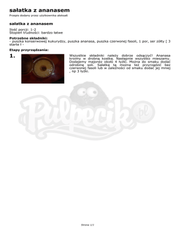 sałatka z ananasem Przepis dodany przez użytkownika aleksa6 sałatka z ananasem Ilość porcji: 1-2 Stopień trudności: bardzo łatwe Potrzebne składniki: - puszka konserwowej kukurydzy, puszka ananasa, puszka czerwonej fasoli, 1 por, ser zółty [ 3 starte ł Etapy przyrządzania: 1. Wszystkie składniki należy dobrze odsączyć! Ananasa kroimy w drobną kostkę. Następnie wszystko mieszamy. Dodajemy majonez około 4 łyżki. Można do smaku dodać odrobinę soli. Sałatkę tą można też przyrządzić bez czerwonej fasoli lub w zależności od smaku dodać jej mniej , np 3 łyżki. Strona 1/1