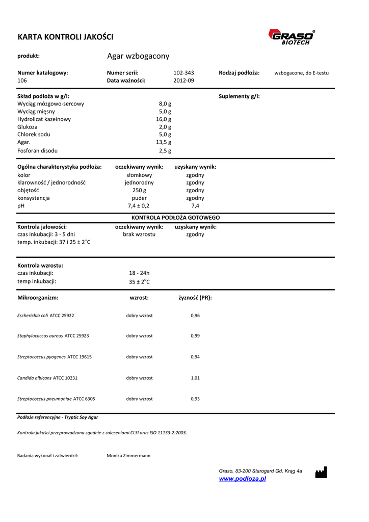 KARTA KONTROLI JAKOŚCI produkt: Agar wzbogacony Numer katalogowy: 106 Numer serii: Data ważności: Skład podłoża w g/l: Wyciąg mózgowo-sercowy Wyciąg mięsny Hydrolizat kazeinowy Glukoza Chlorek sodu Agar. Fosforan disodu Ogólna charakterystyka podłoża: kolor klarowność / jednorodność objętość konsystencja pH Kontrola jałowości: czas inkubacji: 3 - 5 dni temp. inkubacji: 37 i 25 ± 2˚C 102-343 2012-09 Rodzaj podłoża: wzbogacone, do E-testu Suplementy g/l: 8,0 g 5,0 g 16,0 g 2,0 g 5,0 g 13,5 g 2,5 g oczekiwany wynik: słomkowy jednorodny 250 g puder 7,4 ± 0,2 uzyskany wynik: zgodny zgodny zgodny zgodny 7,4 KONTROLA PODŁOŻA GOTOWEGO oczekiwany wynik: uzyskany wynik: brak wzrostu zgodny Kontrola wzrostu: czas inkubacji: temp inkubacji: 18 - 24h 35 ± 2oC Mikroorganizm: wzrost: żyzność (PR): Escherichia coli ATCC 25922 dobry wzrost 0,96 Staphylococcus aureus ATCC 25923 dobry wzrost 0,99 Streptococcus pyogenes ATCC 19615 dobry wzrost 0,94 Candida albicans ATCC 10231 dobry wzrost 1,01 Streptococcus pneumoniae ATCC 6305 dobry wzrost 0,93 Podłoże referencyjne - Tryptic Soy Agar Kontrola jakości przeprowadzona zgodnie z zaleceniami CLSI oraz ISO 11133-2:2003. Badania wykonał i zatwierdził: Monika Zimmermann Graso, 83-200 Starogard Gd, Krąg 4a www.podloza.pl