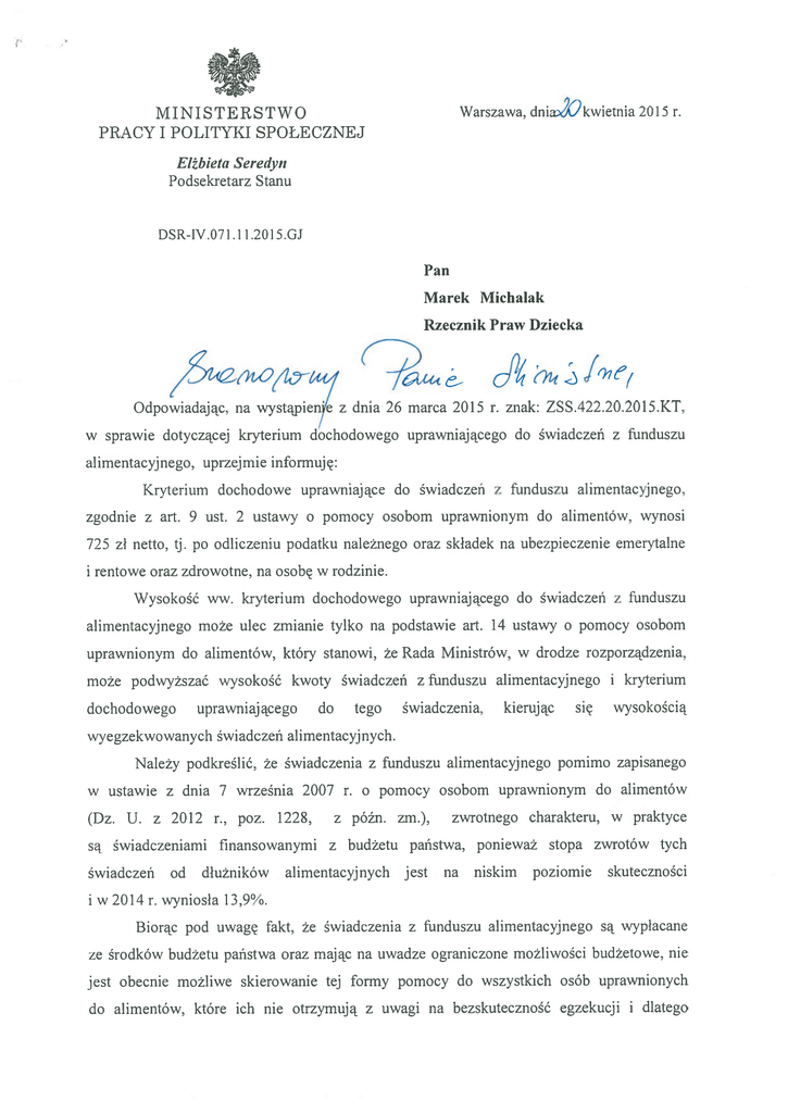 Warszawa, dnia?Okwietnia 2015 r. MINISTERSTWO PRACY I POLITYKI SPOŁECZNEJ Elżbieta Seredyn Podsekretarz Stanu DSR-Iy.071.I l.2015.GJ Pan Marek Michalak Rzecznik Praw Dziecka J e( Odpowiadając, na wystąpienje z dnia 26 marca 2015 r. znak: ZSS.422.20.2015.KT, w sprawie dotyczącej kryterium dochodowego uprawniającego do świadczeń z funduszu alimentacyjnego, uprzejmie informuję: Kryterium dochodowe uprawniające do świadczeń z funduszu alimentacyjnego, zgodnie z art. 9 ust. 2 ustawy o pomocy osobom uprawnionym do alimentów, wynosi 725 zł netto, tj. po odliczeniu podatku należnego oraz składek na ubezpieczenie emerytalne i rentowe oraz zdrowotne, na osobę w rodzinie. Wysokość ww. kryterium dochodowego uprawniającego do świadczeń z funduszu alimentacyjnego może ulec zmianie tylko na podstawie art. 14 ustawy o pomocy osobom uprawnionym do alimentów, który stanowi, że Rada Ministrów, w drodze rozporządzenia, może podwyższać wysokość kwoty świadczeń z funduszu alimentacyjnego i kryterium dochodowego uprawniającego do tego świadczenia, kierując się wysokością wyegzekwowanych świadczeń alimentacyjnych. Należy podkreślić, że świadczenia z funduszu alimentacyjnego pomimo zapisanego w ustawie z dnia 7 września 2007 r. o pomocy osobom uprawnionym do alimentów (Dz. U. z 2012 r., poz. 1228, z późn. zm.), zwrotnego charakteru, w praktyce są świadczeniami finansowanymi z budżetu państwa, ponieważ stopa zwrotów tych świadczeń od dłużników alimentacyjnych jest na niskim poziomie skuteczności i w 2014 r. wyniosła 13,9%. Biorąc pod uwagę fakt. że świadczenia z funduszu alimentacyjnego są wypłacane ze środków budżetu państwa oraz mając na uwadze ograniczone możliwości budżetowe, nie jest obecnie możliwe skierowanie tej formy pomocy do wszystkich osób uprawnionych do alimentów, które ich nie otrzymują z uwagi na bezskuteczność egzekucji i dlatego dostępność do tych świadczeń jest uwarunkowana między innymi koniecznością spełnienia kryterium dochodowego. Ponadto, pragnę zauważyć, że uzależnienie dostępności pomocy z budżetu państwa od spełnienia określonego kryterium potwierdza również najnowsze dochodowego orzecznictwo Trybunału Konstytucyjnego w tym zakresie 2014 r., sygn. akt K138 — - wyrok z dnia 21 października dotyczący innego świadczenia socjalnego finansowanego z budżetu państwa tj. specjalnego zasiłku opiekuńczego funkcjonującego w ustawie o świadczeniach rodzinnych. Trybunał Konstytucyjny w ww. wyroku zawarł generalny pogląd, że świadczenia finansowane z budżetu państwa powinny być uzależnione od mechanizmu oceny sytuacji majątkowej beneficjentów tych świadczeń, a obiektywną metodą oceny tej sytuacji jest odwołanie się do kryterium dochodu. Należy również podkreślić, że kryterium dochodowe uprawniające do świadczeń z funduszu alimentacyjnego jest znacząco wyższe niż kryterium dochodowe uprawniające do zasiłków rodzinnych, które wynosi 574 zł netto na osobę w rodzinie, a w rodzinach wychowujących dziecko niepełnosprawne 664 zł. Tak więc, warunki przyznania prawa do świadczeń z funduszu alimentacyjnego są bardziej preferencyjne niż warunki przyznawania prawa do świadczeń rodzinnych, które adresowane są do wielokrotnie większej grupy rodzin z dziećmi na utrzymaniu. Ponadto, uprzejmie informuję, że obecnie nie są prowadzone prace nad podwyższeniem lub zniesieniem ww. kryterium dochodowego, jak również nad zmianami, dotyczącymi zwiększenia maksymalnej wysokości tych świadczeń. Możliwość podwyższenia kryterium dochodowego uprawniającego do świadczeń z funduszu alimentacyjnego będzie możliwa w miarę poprawy sytuacji budżetowej. Niezależnie od powyższego, odnosząc się generalnie do problemu niealimentacji, należy wskazać, że egzekucja alimentów prowadzona jest przez komorników sądowych na podstawie przepisów ustawy z dnia 17 listopada 1964 r.— Kodeks postępowania cywilnego (Dz. U. Nr 43, poz. 296, z późn. zm.) oraz przepisów wykonawczych do tej ustawy i to od skuteczności działań komorników sądowych zależy przede wszystkim poziom egzekucji alimentów. Minister Pracy i Polityki Społecznej nie dysponuje środkami mogącymi mieć wpływ na skuteczność i sposób prowadzenia przez komorników sądowych, egzekucji orzeczeń sądowych, w tym orzeczeń dotyczących alimentów. Powyższe przepisy dotyczące egzekucji alimentów należą do właściwości Ministra Sprawiedliwości. J 2 Elżbieta