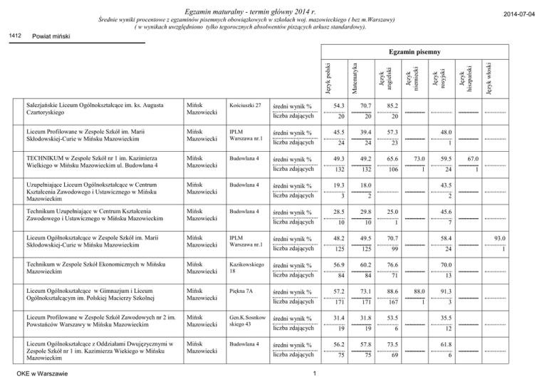 Egzamin maturalny - termin główny 2014 r. 2014-07-04 Średnie wyniki procentowe z egzaminów pisemnych obowiązkowych w szkołach woj. mazowieckiego ( bez m.Warszawy) ( w wynikach uwzględniono tylko tegorocznych absolwentów piszących arkusz standardowy). 1412 Powiat miński 1 4 1 Salezjańskie Liceum Ogólnokształcące im. ks. Augusta Czartoryskiego Mińsk Mazowiecki Kościuszki 27 1 4 1 Liceum Profilowane w Zespole Szkół im. Marii Skłodowskiej-Curie w Mińsku Mazowieckim Mińsk Mazowiecki IPLM Warszawa nr.1 średni wynik % 1 4 1 TECHNIKUM w Zespole Szkół nr 1 im. Kazimierza Wielkiego w Mińsku Mazowieckim ul. Budowlana 4 Mińsk Mazowiecki Budowlana 4 1 4 1 Uzupełniające Liceum Ogólnokształcące w Centrum Kształcenia Zawodowego i Ustawicznego w Mińsku Mazowieckim Mińsk Mazowiecki Budowlana 4 1 4 1 Technikum Uzupełniające w Centrum Kształcenia Zawodowego i Ustawicznego w Mińsku Mazowieckim Mińsk Mazowiecki Budowlana 4 1 4 1 Liceum Ogółnokształcące w Zespole Szkół im. Marii Skłodowskiej-Curie w Mińsku Mazowieckim Mińsk Mazowiecki IPLM Warszawa nr.1 1 4 1 Technikum w Zespole Szkół Ekonomicznych w Mińsku Mazowieckim Mińsk Mazowiecki 1 4 1 Liceum Ogólnokształcące w Gimnazjum i Liceum Ogólnokształcącym im. Polskiej Macierzy Szkolnej 1 4 1 1 4 1 Język włoski Język hiszpański Język rosyjski Język niemiecki Język angielski Język polski Matematyka Egzamin pisemny 54.3 70.7 85.2 0.0 0.0 0.0 0.0 20 20 20 0 0 0 0 45.5 39.4 57.3 0.0 48.0 0.0 0.0 24 24 23 0 1 0 0 średni wynik % 49.3 49.2 65.6 73.0 59.5 67.0 0.0 liczba zdających 132 132 106 1 24 1 0 średni wynik % 19.3 18.0 0.0 0.0 43.5 0.0 0.0 3 2 0 0 2 0 0 28.5 29.8 25.0 0.0 45.6 0.0 0.0 10 10 1 0 7 0 0 średni wynik % 48.2 49.5 70.7 0.0 58.4 0.0 93.0 liczba zdających 125 125 99 0 24 0 1 Kazikowskiego 18 średni wynik % 56.9 60.2 76.6 0.0 70.0 0.0 0.0 84 84 71 0 13 0 0 Mińsk Mazowiecki Piękna 7A średni wynik % 57.2 73.1 88.6 88.0 91.3 0.0 0.0 liczba zdających 171 171 167 1 3 0 0 Liceum Profilowane w Zespole Szkół Zawodowych nr 2 im. Powstańców Warszawy w Mińsku Mazowieckim Mińsk Mazowiecki Gen.K.Sosnkow skiego 43 średni wynik % 31.4 31.8 53.5 0.0 35.5 0.0 0.0 19 19 6 0 12 0 0 Liceum Ogólnokształcące z Oddziałami Dwujęzycznymi w Zespole Szkół nr 1 im. Kazimierza Wiekiego w Mińsku Mazowieckim Mińsk Mazowiecki Budowlana 4 średni wynik % 56.2 57.8 73.5 0.0 61.8 0.0 0.0 75 75 69 0 6 0 0 OKE w Warszawie średni wynik % liczba zdających liczba zdających liczba zdających średni wynik % liczba zdających liczba zdających liczba zdających liczba zdających 1 Egzamin maturalny - termin główny 2014 r. 2014-07-04 Średnie wyniki procentowe z egzaminów pisemnych obowiązkowych w szkołach woj. mazowieckiego ( bez m.Warszawy) ( w wynikach uwzględniono tylko tegorocznych absolwentów piszących arkusz standardowy). 1412 Powiat miński 1 4 1 Technikum w Zespole Szkół Zawodowych nr 2 im. Powstańców Warszawy w Mińsku Mazowieckim Mińsk Mazowiecki Gen.K.Sosnkow skiego 43 średni wynik % 1 4 1 Liceum Ogólnokształcące w Zespóle Szkół Ekonomicznych w Mińsku Mazowieckim Mińsk Mazowiecki Kazikowskiego 18 średni wynik % 1 4 1 Liceum Plastyczne im.Elwiro Michała Andriollego w Zespole Szkół Ekonomicznych w Mińsku Mazowieckim Mińsk Mazowiecki Kazikowskiego 18 średni wynik % 1 4 1 Liceum Ogólnokształcące w Centrum Kształcenia Zawodowego i Ustawicznego w Mińsku Mazowieckim Mińsk Mazowiecki Budowlana 4 średni wynik % 1 4 1 Liceum Ogólnokształcące dla Dorosłych Edukator w Mińsku Mazowieckim Mińsk Mazowiecki Warszawska 157 średni wynik % 1 4 1 Zespół Szkół Agrotechnicznych w Mińsku Mazowieckim Mińsk Mazowiecki Budowlana 4 średni wynik % 1 4 1 Liceum Ogólnokształcące dla Dorosłych TWP Jędrzejów Nowy 30 1 4 1 Uzupełniające Liceum Ogólnokształcące dla Dorosłych Jędrzejów Nowy 30 1 4 1 Liceum Ogólnoksztąłcace im. Adama Mickiewicza w Zespół Szkół Publicznych im. Adama Mickiewicza w Mrozach Mrozy Licealna 3 1 4 1 Technikum w Zespole Szkół im. H. i K. Gnoińskich w Siennicy Siennica OKE w Warszawie liczba zdających liczba zdających liczba zdających liczba zdających liczba zdających liczba zdających średni wynik % liczba zdających średni wynik % liczba zdających średni wynik % liczba zdających Mińska 38 średni wynik % liczba zdających 2 Język włoski Język hiszpański Język rosyjski Język niemiecki Język angielski Język polski Matematyka Egzamin pisemny 41.0 36.7 42.9 0.0 43.1 0.0 0.0 95 95 81 0 13 0 0 63.2 68.2 85.0 100.0 80.6 0.0 0.0 87 87 81 1 5 0 0 50.0 33.6 67.7 82.0 59.5 54.0 0.0 23 23 19 1 2 1 0 38.8 21.0 38.4 60.0 46.3 0.0 0.0 23 23 19 1 3 0 0 37.5 18.4 30.4 0.0 52.7 0.0 0.0 16 16 7 0 9 0 0 48.5 27.1 48.3 48.0 52.0 0.0 0.0 58 58 53 4 1 0 0 20.6 28.6 0.0 0.0 55.1 0.0 0.0 7 7 0 0 7 0 0 15.3 40.8 0.0 0.0 48.9 0.0 0.0 9 8 0 0 8 0 0 48.9 45.5 56.8 88.0 63.0 0.0 0.0 41 41 30 1 10 0 0 57.3 28.0 54.7 0.0 26.0 0.0 0.0 13 13 12 0 1 0 0 Egzamin maturalny - termin główny 2014 r. 2014-07-04 Średnie wyniki procentowe z egzaminów pisemnych obowiązkowych w szkołach woj. mazowieckiego ( bez m.Warszawy) ( w wynikach uwzględniono tylko tegorocznych absolwentów piszących arkusz standardowy). 1412 Powiat miński 1 4 1 Liceum Ogólnokształcące w Zespole Szkół Ponadgimnazjalnych im. Ignacego Jana Paderewskiego w Sulejówku Sulejówek 1 4 1 Liceum Profilowane w Zespole Szkół Ponadgimnazjalnych im. Ignacego Jana Paderewskiego w Sulejówku Sulejówek 1 4 1 Liceum Ogólnokształcące dla Dorosłych w Zespole Szkół Ponadgimnazjalnych im. Ignacego Jana Paderewskiego w Sulejówku Sulejówek OKE w Warszawie I. J. Paderewskiego 29 średni wynik % I. J. Paderewskiego 29 średni wynik % I. J. Paderewskiego 29 średni wynik % liczba zdających liczba zdających liczba zdających 3 Język włoski Język hiszpański Język rosyjski Język niemiecki Język angielski Język polski Matematyka Egzamin pisemny 40.5 30.7 61.8 0.0 0.0 0.0 0.0 5