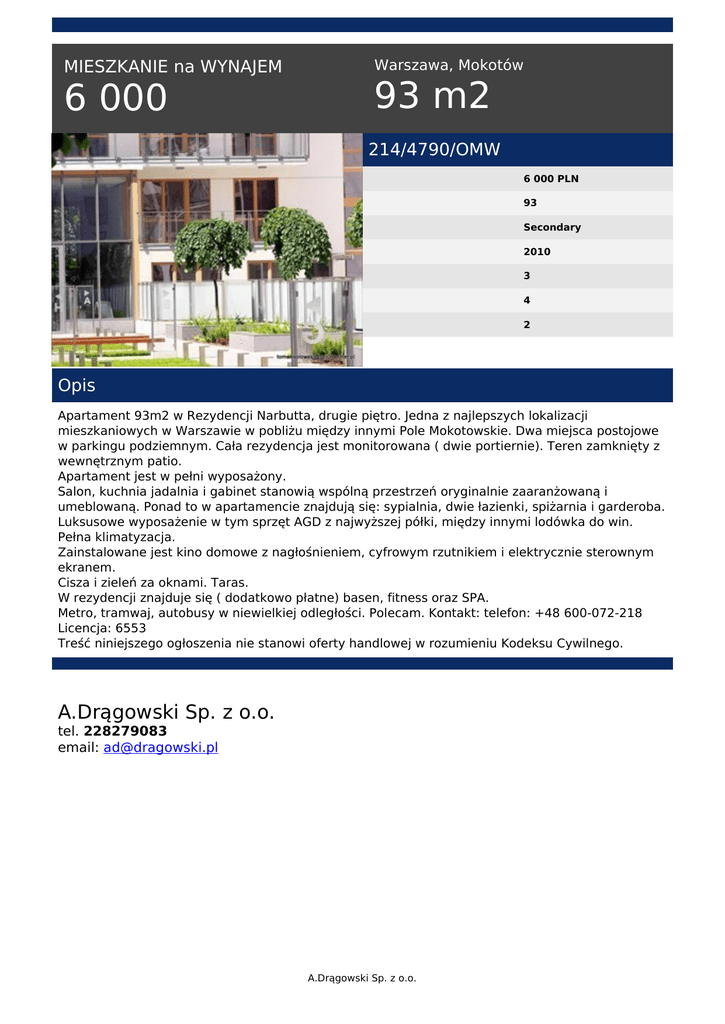 MIESZKANIE na WYNAJEM 6 000 Warszawa, Mokotów 93 m2 214/4790/OMW 6 000 PLN 93 Secondary 2010 3 4 2 Opis Apartament 93m2 w Rezydencji Narbutta, drugie piętro. Jedna z najlepszych lokalizacji mieszkaniowych w Warszawie w pobliżu między innymi Pole Mokotowskie. Dwa miejsca postojowe w parkingu podziemnym. Cała rezydencja jest monitorowana ( dwie portiernie). Teren zamknięty z wewnętrznym patio. Apartament jest w pełni wyposażony. Salon, kuchnia jadalnia i gabinet stanowią wspólną przestrzeń oryginalnie zaaranżowaną i umeblowaną. Ponad to w apartamencie znajdują się: sypialnia, dwie łazienki, spiżarnia i garderoba. Luksusowe wyposażenie w tym sprzęt AGD z najwyższej półki, między innymi lodówka do win. Pełna klimatyzacja. Zainstalowane jest kino domowe z nagłośnieniem, cyfrowym rzutnikiem i elektrycznie sterownym ekranem. Cisza i zieleń za oknami. Taras. W rezydencji znajduje się ( dodatkowo płatne) basen, fitness oraz SPA. Metro, tramwaj, autobusy w niewielkiej odległości. Polecam. Kontakt: telefon: +48 600-072-218 Licencja: 6553 Treść niniejszego ogłoszenia nie stanowi oferty handlowej w rozumieniu Kodeksu Cywilnego. A.Drągowski Sp. z o.o. tel. 228279083 email: [email protected] A.Drągowski Sp. z o.o. Powered by TCPDF (www.tcpdf.org)