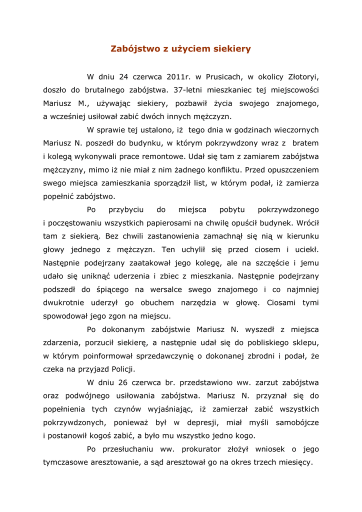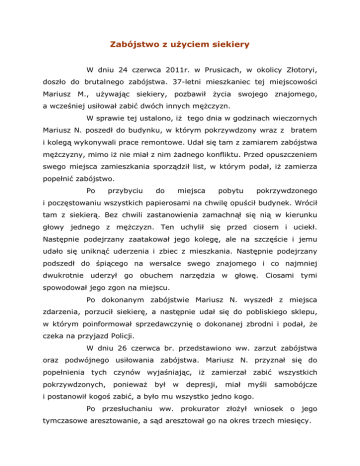 Zabójstwo z użyciem siekiery W dniu 24 czerwca 2011r. w Prusicach, w okolicy Złotoryi, doszło do brutalnego zabójstwa. 37-letni mieszkaniec tej miejscowości Mariusz M., używając siekiery, pozbawił życia swojego znajomego, a wcześniej usiłował zabić dwóch innych mężczyzn. W sprawie tej ustalono, iż tego dnia w godzinach wieczornych Mariusz N. poszedł do budynku, w którym pokrzywdzony wraz z bratem i kolegą wykonywali prace remontowe. Udał się tam z zamiarem zabójstwa mężczyzny, mimo iż nie miał z nim żadnego konfliktu. Przed opuszczeniem swego miejsca zamieszkania sporządził list, w którym podał, iż zamierza popełnić zabójstwo. Po przybyciu do miejsca pobytu pokrzywdzonego i poczęstowaniu wszystkich papierosami na chwilę opuścił budynek. Wrócił tam z siekierą. Bez chwili zastanowienia zamachnął się nią w kierunku głowy jednego z mężczyzn. Ten uchylił się przed ciosem i uciekł. Następnie podejrzany zaatakował jego kolegę, ale na szczęście i jemu udało się uniknąć uderzenia i zbiec z mieszkania. Następnie podejrzany podszedł do śpiącego na wersalce swego znajomego i co najmniej dwukrotnie uderzył go obuchem narzędzia w głowę. Ciosami tymi spowodował jego zgon na miejscu. Po dokonanym zabójstwie Mariusz N. wyszedł z miejsca zdarzenia, porzucił siekierę, a następnie udał się do pobliskiego sklepu, w którym poinformował sprzedawczynię o dokonanej zbrodni i podał, że czeka na przyjazd Policji. W dniu 26 czerwca br. przedstawiono ww. zarzut zabójstwa oraz podwójnego usiłowania zabójstwa. Mariusz N. przyznał się do popełnienia tych czynów wyjaśniając, iż zamierzał zabić wszystkich pokrzywdzonych, ponieważ był w depresji, miał myśli samobójcze i postanowił kogoś zabić, a było mu wszystko jedno kogo. Po przesłuchaniu ww. prokurator złożył wniosek o jego tymczasowe aresztowanie, a sąd aresztował go na okres trzech miesięcy. Jak ustalono, Mariusz N. dopuścił się już podobnej zbrodni z użyciem siekiery 18 lat temu. Wówczas zabił swojego dziadka. W 2008 r. był też skazany za zniszczenie mienia, którego również dokonał posługując się siekierą. Za opisane zbrodnie podejrzanemu grozi kara dożywotniego pozbawienia wolności.
