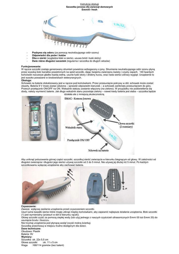 Instrukcja obsługi Szczotka jonowa dla zwierząt domowych Emmi®- fresh - Pozbywa się odoru (za pomocą neutralizującego odór ozonu) Odpowiedni dla psów i kotów Dba o sierść (wygładza kłaki w sierści, usuwa bród i łuski skóry) Dwie różne długości szczotek (regularna i szczotka do długich włosów) Funkcjonowanie: W rączce szczotki zostaje generowany strumień powietrza wzbogacony o jony. Strumienie neutralizującego odór ozonu płyną przez wysoką ilość kanałów powietrznych na spód szczotki, dając twojemu zwierzęciu świeży i czysty zapach. 140 twardych końcówek rozczesze gładko każdą wełnę, usunie łuski skóry i drobiny kurzu, oraz nada sierści zdrowy wygląd. Urządzenie to jest wysoko poważane w środowiskach weterynaryjnych. Obsługa: Schowek na baterie zlokalizowany jest w rączce pod końcówkami. Przez przesunięcie pokrywy w dół, schowek może zostać otwarty. Bateria 9 V może zostać włożona – sprawdź odpowiedni kierunek – a schowek zamknięty przesunięciem do góry. Przesuń przełącznik ON/OFF na ON. Wskaźnik statusu zostanie włączony (na zielono). W przypadku nie podświetlenia się diody, należy wymienić baterie. Jak długo wskaźnik stanu pozostaje zielony – nawet kiedy bateria jest słaba – szczotka będzie działała ale z mniejszą skutecznością. Aby uniknąć poluzowania górnej części szczotki, szczotkuj sierść zwierzęcia w kierunku biegnącym od głowy. W zależności od długości zwierzęcia i długości jego sierści używaj szczotki od 2 do 5 minut. Nie używaj jej dłużej niż 5 minut. Po każdym szczotkowaniu wyłączaj urządzenie aby zachować baterie. Czyszczenie: Zawsze wyłączaj zasilanie urządzenia przed czyszczeniem szczotki. Usuń luźne kawałki sierści które mogły utknąć między końcówkami, aby zapewnić najlepsze działanie urządzenia. Blok szczotki (1) jest wymienialny (przesuń w dół w kierunku rączki). Głowę szczotki czyść za pomocą ciepłej wody (lub użyj jednego z naszych czyścicieli ultrasonicznych Emmi 05 lub Emmi 20) do usunięcia brudu i tłuszczu. Nie trzymaj urządzenia pod płynącą wodą! (czyść mokrą ścierką). Szczotkę przechowuj w miejscu trudno dostępnym dla dzieci. Dane techniczne: Obudowa: Plastik Bateria: 9V Wymiary: Szczotka :ok. 22x 5,5 cm Głowa szczotki :ok. 11 x 5 cm Waga :168/114 gramów (bez baterii)