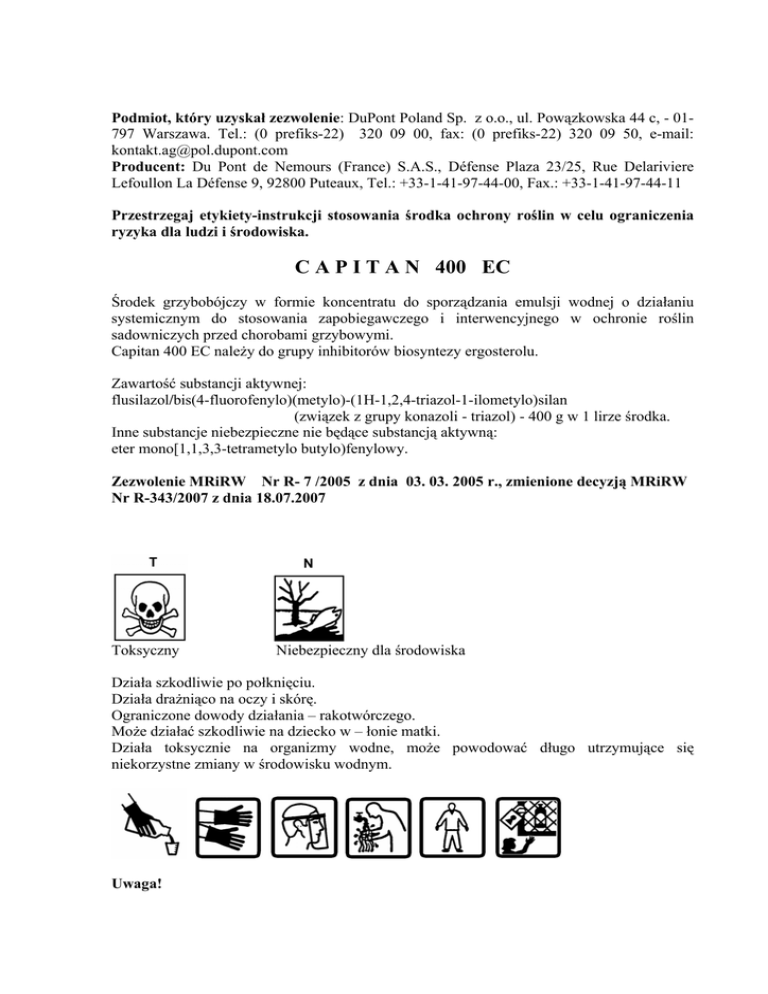Podmiot, który uzyskał zezwolenie: DuPont Poland Sp. z o.o., ul. Powązkowska 44 c, - 01797 Warszawa. Tel.: (0 prefiks-22) 320 09 00, fax: (0 prefiks-22) 320 09 50, e-mail: [email protected] Producent: Du Pont de Nemours (France) S.A.S., Défense Plaza 23/25, Rue Delariviere Lefoullon La Défense 9, 92800 Puteaux, Tel.: +33-1-41-97-44-00, Fax.: +33-1-41-97-44-11 Przestrzegaj etykiety-instrukcji stosowania środka ochrony roślin w celu ograniczenia ryzyka dla ludzi i środowiska. C A P I T A N 400 EC Środek grzybobójczy w formie koncentratu do sporządzania emulsji wodnej o działaniu systemicznym do stosowania zapobiegawczego i interwencyjnego w ochronie roślin sadowniczych przed chorobami grzybowymi. Capitan 400 EC należy do grupy inhibitorów biosyntezy ergosterolu. Zawartość substancji aktywnej: flusilazol/bis(4-fluorofenylo)(metylo)-(1H-1,2,4-triazol-1-ilometylo)silan (związek z grupy konazoli - triazol) - 400 g w 1 lirze środka. Inne substancje niebezpieczne nie będące substancją aktywną: eter mono[1,1,3,3-tetrametylo butylo)fenylowy. Zezwolenie MRiRW Nr R- 7 /2005 z dnia 03. 03. 2005 r., zmienione decyzją MRiRW Nr R-343/2007 z dnia 18.07.2007 Toksyczny Niebezpieczny dla środowiska Działa szkodliwie po połknięciu. Działa drażniąco na oczy i skórę. Ograniczone dowody działania – rakotwórczego. Może działać szkodliwie na dziecko w – łonie matki. Działa toksycznie na organizmy wodne, może powodować długo utrzymujące się niekorzystne zmiany w środowisku wodnym. Uwaga! 2 1. Zabrania się stosowania środka w strefie bezpośredniej ochrony ujęć wody oraz na terenie uzdrowisk, otulin parków narodowych i rezerwatów. 2. Nie zanieczyszczać wód środkiem ochrony roślin lub jego opakowaniem. ZAKRES STOSOWANIA, TERMINY I DAWKI Rośliny sadownicze. jabłoń, grusza - parch jabłoni, parch gruszy. Zalecana dawka: 75 ml/ha. Środek stosować zapobiegawczo lub interwencyjnie - do 120 godzin po infekcji. Capitan 400 EC najlepiej stosować w mieszaninie z fungicydami o działaniu kontaktowym. Zabiegi wykonywać od różowego pąka kwiatowego nie częściej niż 2-3 razy w sezonie. jabłoń - mączniak prawdziwy. Zalecana dawka: 112 ml/ha. Zabiegi wykonywać po kwitnieniu nie częściej niż 2-3 razy w sezonie. Środek stosować z chwilą wystąpienia pierwszych objawów choroby, następne zabiegi wykonywać co 10 dni. Wykonać nie więcej niż 3 zabiegi w sezonie, stosując przemiennie fungicydy należące do innych grup chemicznych. Zalecana ilość wody: 500-750 l/ha, Opryskiwać do całkowitego zwilżenia liści i pędów. UWAGI: 1. Środek stosować w temperaturze powyżej 12o C. 2. Liczbę opryskiwań fungicydami o działaniu układowym należącymi do grupy inhibitorów biosyntezy ergosterolu (IBE) ograniczyć do 2-3 zabiegów w sezonie ze względu na możliwość pojawienia się form odpornych na tę grupę środków. 3. Środek stosować przemiennie z fungicydami należącymi do innych grup chemicznych. OKRES KARENCJI (okres od dnia ostatniego zabiegu do dnia zbioru roślin przeznaczonych do konsumpcji): owoce - 14 dni. 3 OKRES PREWENCJI DLA LUDZI, PSZCZÓŁ I ZWIERZĄT (okres zapobiegający zatruciu): NIE DOTYCZY. SPORZĄDZANIE CIECZY UŻYTKOWEJ Przed przystąpieniem do sporządzania cieczy użytkowej dokładnie ustalić jej ilość. Odmierzoną ilość środka wlać do zbiornika opryskiwacza napełnionego częściowo wodą (z włączonym mieszadłem) i uzupełnić wodą do potrzebnej ilości. Opryskiwać z włączonym mieszadłem. Po wlaniu środka do zbiornika opryskiwacza nie wyposażonego w mieszadło hydrauliczne ciecz mechanicznie wymieszać. Opróżnione opakowania przepłukać trzykrotnie wodą, a popłuczyny wlać do zbiornika opryskiwacza z cieczą użytkową. Po pracy aparaturę dokładnie wymyć. PRZECHOWYWANIE Przechowywać z dala od źródeł ciepła. Nie przechowywać razem z żywnością, napojami i paszami dla zwierząt. Przechowywać wyłącznie w oryginalnym opakowaniu w temperaturze nie niższej niż 0oC i nie wyższej niż 30oC. Przechowywać pod zamknięciem i chronić przed dziećmi. WARUNKI BEZPIECZNEGO STOSOWANIA ŚRODKA Nie jeść i nie pić oraz nie palić tytoniu podczas stosowania produktu. Nie wdychać par cieczy użytkowej. Unikać zanieczyszczenia skóry i oczu. Natychmiast zdjąć całą zanieczyszczoną odzież. Zanieczyszczone oczy przemyć natychmiast dużą ilością wody i zasięgnąć porady lekarza. Nosić odpowiednią odzież ochronną, odpowiednie rękawice ochronne i okulary lub ochronę twarzy. Unikać narażenia - przed użyciem zapoznać się z instrukcją. W przypadku zanieczyszczenia skóry natychmiast przemyć ją dużą ilością wody. W razie połknięcia niezwłocznie zasięgnij porady lekarza - pokaż opakowanie lub etykietę. 4 Resztki cieczy użytkowej rozcieńczyć wodą i wypryskać na powierzchni poprzednio opryskiwanej. Wodę użytą do mycia aparatury wypryskać na powierzchni poprzednio opryskiwanej stosując te same środki ochrony osobistej. Środek i opakowania usuwać jako odpad niebezpieczny. Używać odpowiednich pojemników zapobiegających skażeniu środowiska. Opróżnione opakowania po środku zwrócić do sprzedawcy, u którego środek został zakupiony. Zabrania się spalania opakowań po środku ochrony roślin we własnym zakresie. UWAGA: ZABRANIA SIĘ WYKORZYSTYWANIA OPRÓŻNIONYCH OPAKOWAŃ PO ŚRODKU OCHRONY ROŚLIN DO INNYCH CELÓW, W TYM TAKŻE TRAKTOWANIA ICH JAKO SUROWCE WTÓRNE. ANTIDOTUM: BRAK, STOSOWAĆ LECZENIE OBJAWOWE. W przypadku awarii lub jeżeli źle się poczujesz , niezwłocznie zasięgnij porady lekarza – jeżeli to możliwe , pokaż etykietę. Pomoc medyczna W zaistniałych sytuacjach, kiedy wymagana jest lub konieczna inna pomoc medyczna niż ujęta w wyżej wymienionych ostrzeżeniach skontaktować się z najbliższym Ośrodkiem Toksykologicznym: Gdańsk – (0-prefiks-58) 301 65 16 Rzeszów – (0-prefiks-17) 866 44 09 Kraków - (0-prefiks-12) 