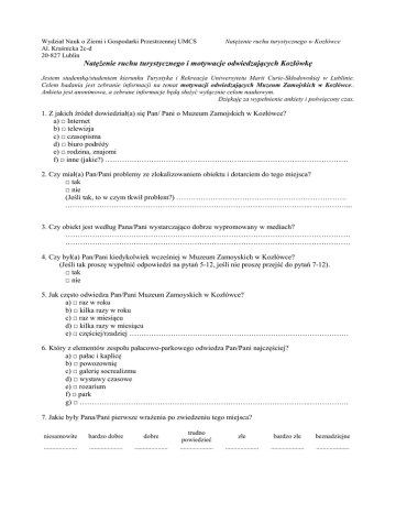 Wydział Nauk o Ziemi i Gospodarki Przestrzennej UMCS Al. Kraśnicka 2c-d 20-827 Lublin Natężenie ruchu turystycznego w Kozłówce Natężenie ruchu turystycznego i motywacje odwiedzających Kozłówkę Jestem studentką/studentem kierunku Turystyka i Rekreacja Uniwersytetu Marii Curie-Skłodowskiej w Lublinie. Celem badania jest zebranie informacji na temat motywacji odwiedzających Muzeum Zamojskich w Kozłówce.. Ankieta jest anonimowa, a zebrane informacje będą służyć wyłącznie celom naukowym. Dziękuję za wypełnienie ankiety i poświęcony czas. 1. Z jakich źródeł dowiedział(a) się Pan/ Pani o Muzeum Zamojskich w Kozłówce? a) □ Internet b) □ telewizja c) □ czasopisma d) □ biuro podróży e) □ rodzina, znajomi f) □ inne (jakie?) ……………………………………………………….……………………………… 2. Czy miał(a) Pan/Pani problemy ze zlokalizowaniem obiektu i dotarciem do tego miejsca? □ tak □ nie (Jeśli tak, to w czym tkwił problem?) ……………………………………………………………. ………………………………………………………………………………………..……………... 3. Czy obiekt jest według Pana/Pani wystarczająco dobrze wypromowany w mediach? ……………………………………………………………………………………………………… ……………………………………………………………………………………………………… 4. Czy był(a) Pan/Pani kiedykolwiek wcześniej w Muzeum Zamoyskich w Kozłówce? (Jeśli tak proszę wypełnić odpowiedzi na pytań 5-12, jeśli nie proszę przejść do pytań 7-12). □ tak □ nie 5. Jak często odwiedza Pan/Pani Muzeum Zamoyskich w Kozłówce? a) □ raz w roku b) □ kilka razy w roku c) □ raz w miesiącu d) □ kilka razy w miesiącu e) □ częściej/rzadziej ……………………………………………………………………………… 6. Który z elementów zespołu pałacowo-parkowego odwiedza Pan/Pani najczęściej? a) □ pałac i kaplicę b) □ powozownię c) □ galerię socrealizmu d) □ wystawy czasowe e) □ rozarium f) □ park g) □ …………………………………………………………………………………..……………. 7. Jakie były Pana/Pani pierwsze wrażenia po zwiedzeniu tego miejsca? niesamowite bardzo dobre dobre .................... .................... .................... trudno powiedzieć .................... złe bardzo złe beznadziejne .................... .................... .................... 8. Proszę skali 1-5 ocenić elementy pałacowo-parkowe pod względem ich atrakcyjności w (1-nieatrkacyjny, 5-bardzo atrakcyjny) a) b) c) d) e) f) g) pałac i kaplica powozownia galeria socrealizmu wystawy czasowe rozarium park ………………… 1 1 1 1 1 1 1 2 2 2 2 2 2 2 ranga 3 3 3 3 3 3 3 4 4 4 4 4 4 4 5 5 5 5 5 5 5 9. Który z obiektów według Pana/Pani jest najbardziej atrakcyjny? ……………………………………………………………………………………………………… ……………………………………………………………………………………………………… 10. Co sprawia, że wraca Pan/Pani do Muzeum? ……………………………………………………………………………………………………………… ……………………………………………………………………………………………………………… 11. Czy polecił(a) Pan/Pani komuś to miejsce, jako cel podróży? □ tak □ nie (Jeśli tak, to komu i dlaczego?) …………………………………………………………………… ……………………………………………………………………………..………………………………… 12. Gdyby miał(a) Pan/Pani tu wrócić, to który z elementów zespołu pałacowo- parkowego odwiedził(a)by Pan/Pani najchętniej? a) □ pałac i kaplica b) □ powozownia c) □ galeria socrealizmu d) □ wystawy czasowe e) □ rozarium f) □ park g) □ …………………………………………………………. 13. Jeżeli tak, to dlaczego? …………………………………………………………………………………………………………… …………………………………………………………………………………………………………… 14. Czy ma Pan/Pani zamiar nadal odwiedzać to miejsce? □ tak □ nie (Jeśli tak, to dlaczego?) …………………………………………………………….……………… ………………………………………………………………………………………..……………………… 15. Co Pana/Pani zdaniem należałoby zmienić w Kozłówce? a) □ warunki dojazdu b) □ koszty pobytu c) □ standard usług d) □ stan sanitarny e) □ liczbę atrakcji f) □ informację turystyczną g) □ inne (jakie?) ……………………………………………………………………………..……….. Metryczka Płeć: □ kobieta □ mężczyzna Wiek:………………… Wykształcenie: □ podstawowe □ średnie □ zawodowe □ wyższe Miejscowość, w której mieszkam ……………….…………….. Województwo, w którym mieszkam ……………………………………….