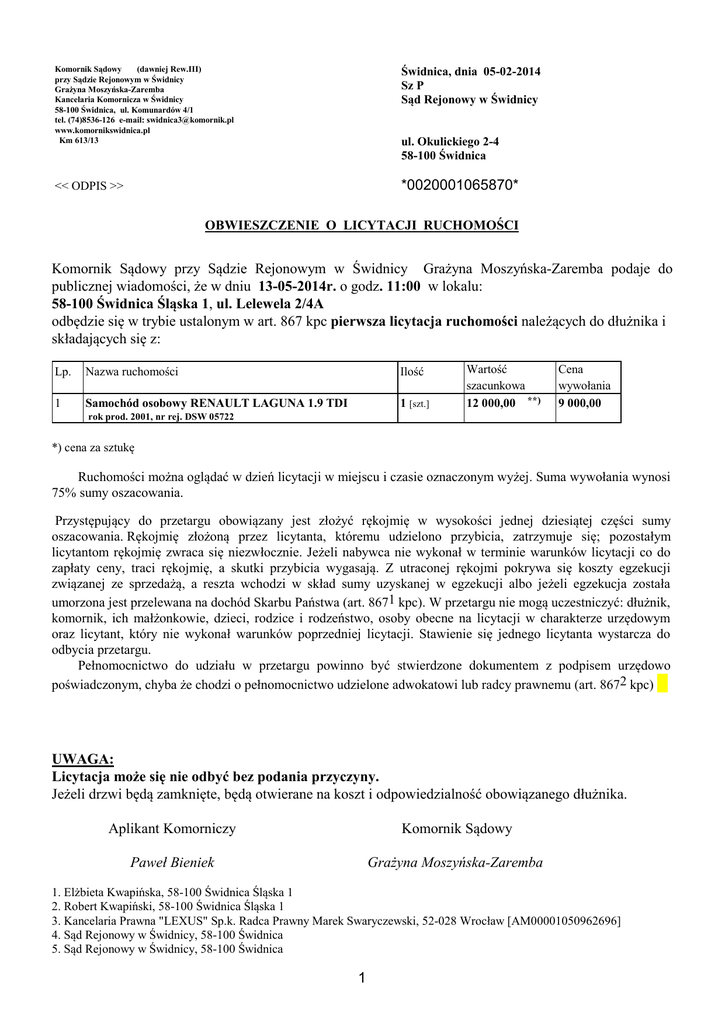 Komornik Sądowy (dawniej Rew.III) przy Sądzie Rejonowym w Świdnicy Grażyna Moszyńska-Zaremba Kancelaria Komornicza w Świdnicy 58-100 Świdnica, ul. Komunardów 4/1 tel. (74)8536-126 e-mail: [email protected] www.komornikswidnica.pl Km 613/13 Świdnica, dnia 05-02-2014 Sz P Sąd Rejonowy w Świdnicy << ODPIS >> *0020001065870* ul. Okulickiego 2-4 58-100 Świdnica OBWIESZCZENIE O LICYTACJI RUCHOMOŚCI Komornik Sądowy przy Sądzie Rejonowym w Świdnicy Grażyna Moszyńska-Zaremba podaje do publicznej wiadomości, że w dniu 13-05-2014r. o godz. 11:00 w lokalu: 58-100 Świdnica Śląska 1, ul. Lelewela 2/4A odbędzie się w trybie ustalonym w art. 867 kpc pierwsza licytacja ruchomości należących do dłużnika i składających się z: Lp. Nazwa ruchomości Ilość 1 Samochód osobowy RENAULT LAGUNA 1.9 TDI 1 [szt.] Wartość szacunkowa 12 000,00 **) Cena wywołania 9 000,00 .rok prod. 2001, nr rej. DSW 05722 *) cena za sztukę Ruchomości można oglądać w dzień licytacji w miejscu i czasie oznaczonym wyżej. Suma wywołania wynosi 75% sumy oszacowania. Przystępujący do przetargu obowiązany jest złożyć rękojmię w wysokości jednej dziesiątej części sumy oszacowania. Rękojmię złożoną przez licytanta, któremu udzielono przybicia, zatrzymuje się; pozostałym licytantom rękojmię zwraca się niezwłocznie. Jeżeli nabywca nie wykonał w terminie warunków licytacji co do zapłaty ceny, traci rękojmię, a skutki przybicia wygasają. Z utraconej rękojmi pokrywa się koszty egzekucji związanej ze sprzedażą, a reszta wchodzi w skład sumy uzyskanej w egzekucji albo jeżeli egzekucja została umorzona jest przelewana na dochód Skarbu Państwa (art. 8671 kpc). W przetargu nie mogą uczestniczyć: dłużnik, komornik, ich małżonkowie, dzieci, rodzice i rodzeństwo, osoby obecne na licytacji w charakterze urzędowym oraz licytant, który nie wykonał warunków poprzedniej licytacji. Stawienie się jednego licytanta wystarcza do odbycia przetargu. Pełnomocnictwo do udziału w przetargu powinno być stwierdzone dokumentem z podpisem urzędowo poświadczonym, chyba że chodzi o pełnomocnictwo udzielone adwokatowi lub radcy prawnemu (art. 8672 kpc) UWAGA: Licytacja może się nie odbyć bez podania przyczyny. Jeżeli drzwi będą zamknięte, będą otwierane na koszt i odpowiedzialność obowiązanego dłużnika. Aplikant Komorniczy Komornik Sądowy Paweł Bieniek Grażyna Moszyńska-Zaremba 1. Elżbieta Kwapińska, 58-100 Świdnica Śląska 1 2. Robert Kwapiński, 58-100 Świdnica Śląska 1 3. Kancelaria Prawna "LEXUS" Sp.k. Radca Prawny Marek Swaryczewski, 52-028 Wrocław [AM00001050962696] 4. Sąd Rejonowy w Świdnicy, 58-100 Świdnica 5. Sąd Rejonowy w Świdnicy, 58-100 Świdnica 1 6. Urząd Miasta Tablica Ogłoszeń, 58-100 Świdnica 7. a/a 2