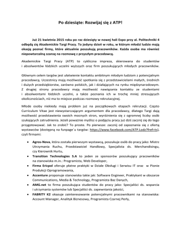 Po dziesiąte: Rozwijaj się z ATP! Już 21 kwietnia 2015 roku po raz dziesiąty w nowej hali Expo przy al. Politechniki 4 odbędą się Akademickie Targi Pracy. To jedyny dzień w roku, w którym młodzi ludzie mają okazję poznać firmy, które aktualnie poszukują pracowników. Każda osoba ma również niepowtarzalną szansę na rozmowę z przyszłym pracodawcą. Akademickie Targi Pracy (ATP) to cykliczna impreza, skierowana do studentów i absolwentów łódzkich uczelni wyższych oraz firm poszukujących młodych pracowników. Głównym celem targów jest ułatwienie kontaktu ambitnym młodym ludziom z potencjalnym pracodawcą. Uczestnicy mają możliwość spotkania się z przedstawicielami małych, średnich i dużych przedsiębiorstw, zarówno polskich, jak i działających na rynku międzynarodowym. Z drugiej strony pracodawcy mają możliwość nawiązania kontaktu ze studentami i absolwentami łódzkich uczelni, a także poznania ich w trochę mniej stresujących okolicznościach, niż ma to miejsce podczas rozmowy rekrutacyjnej. Młode osoby niekiedy mają problem już na początkowych etapach rekrutacji. Często Curriculum Vitae jest niewystarczającym argumentem dla pracodawcy, dlatego Targi dają możliwość przedstawienia swoich mocnych stron, wyróżnienia się z ogromnej liczby osób szukających zatrudnienia. Jeżeli poważnie myślisz o podjęciu pracy już dziś zacznij się do tego przygotowywać. Jak to zrobić? To proste. Po pierwsze: zacznij od zapoznania się z ofertą wystawców (dostępną na funpage`u targów: https://www.facebook.com/ATP.Lodz?fref=ts), czyli firmami: Agros-Nova, która została pierwszym wystawcą, poszukuje osób do pracy jako: Mistrz Utrzymania Ruchu, Przedstawiciel Handlowy, Specjalista ds. Merchandisingu, czy Kierownik Hurtu, Transition Technologies S.A to jeden ze sponsorów poszukujący pracowników na stanowiska m.in.: Programista, Web Developer, Firma Ericpol oferuje płatne praktyki w Dziale Obsługi i Serwisu IT oraz w Pionie Produkcji Oprogramowania, Accenture proponuje stanowiska takie jak: Software Engineer, Praktykant w obszarze Communications, Media & Technology, Programista Baz Danych, AMG.net to firma poszukująca studentów do pracy jako: Specjaliści ds. wsparcia i utrzymania systemów lub Specjaliści ds. zapewniania jakości, FABRITY K2 okazuje zainteresowanie potencjalnymi pracownikami na stanowiska: Account Manager, Analityk Biznesowy, Programista Czarnej Perły, a także: Infosys, Axamo Recruitment, P&G, PartnerTech, Szpital GAMETA, Nordea Operations Centre. Firma GFT Poland Sp. z o.o. (dawniej Rule Finanicial) jak co roku, została Sponsorem Głównym, pozostali sponsorzy to Accenture, ABB, AMG.net, Barry Callebaut, Ericpol, FABRITY K2, P&G, Transition Technologies S.A. Kolejnym krokiem do podjęcia pracy jest przygotowanie dokumentów aplikacyjnych: Curriculum Vitae, List motywacyjny. Przekazanie ich przyszłemu pracodawcy podczas Targów będzie wyrazem Twojej ambicji i determinacji, umożliwi także kontakt między Tobą a zatrudniającym. Ostatni, trzeci etap to zarezerwowanie wolnego czasu na 21 kwietnia i przyjście w pełni przygotowanym i pełnym pozytywnej energii i chęci do pracy. Mówiąc o Akademickim Targach Pracy warto podkreślić wydarzenia towarzyszące, takie jak bezpłatne szkolenia i warsztaty. Ich celem jest ukierunkowanie przyszłych pracowników na radzenie sobie z coraz trudniejszym i kurczącym się rynkiem pracy oraz podnoszeniem umiejętności zawodowych. Jednym z takich wydarzeń są warsztaty organizowane przez firmę Procter & Gamble: International IDS Challenge. Są one kierowane do studentów 3 roku i wyżej z całej Europy, którzy podczas warsztatów będą m.in. szlifować swoje umiejętności przywódcze, menedżerskie pod okiem profesjonalistów. Jedną z zalet tego wydarzenia jest to, że udział w warsztatach jest bezpłatny, jedyną walutą jest Twój czas. Deadline aplikowania to 16 lutego 2015 r. W 2014 roku podczas Targów przeprowadzono 35 szkoleń o tematyce m.in.: Fakty i mity o pracy Test Engineera, Jak pies z kotem, czyli rzecz o skutecznym porozumiewaniu się, Przybyłem, zobaczyłem, zwyciężyłem, czyli jak odnieść sukces podczas wystąpienia publicznego, zaliczyć projekt, zdobyć uznanie szefa lub przekonać zespół do swojego pomysłu, Multi-kulti - praca w międzynarodowym środowisku, Assessment Center, Podstawy prawne zatrudnienia. Jak poradzić sobie z nieuczciwym pracodawcą?. Mamy nadzieję, że tegoroczne Targi również zaoferują szeroki wybór tematów szkoleń, podczas których każdy student będzie mógł zyskać nową wiedzę, przydatną w przyszłym życiu zawodowym. Jak podkreślają organizatorzy, Akademickie Targi Pracy są dedykowane wszystkim studentom - nie tylko tym z Politechniki Łódzkiej i Uniwersytetu Medycznego. Świadczy o tym chociażby neutralne miejsce odbywania się targów. Dla uczestników przygotowane są prócz szkoleń dodatkowe atrakcje, takie jak konkursy organizowane przez wystawców. Organizatorami tegorocznej edycji są: Politechnika Łódzka, Urząd Miasta Łodzi, Fundacja dla Uniwersytetu Medycznego w Łodzi (FUMED), Akademickie Biuro Karier Uniwersytetu Medycznego w Łodzi (ABK UM), Board of European Students of Technology PŁ (BEST PŁ), Biuro Karier Politechniki Łódzkiej (BK PŁ), Erasmus Student Network – European Youth Exchange Łódź (ESN-EYE Łódź) oraz Koło Naukowe Zarządzania Zasobami Ludzkimi Experience (KNZZL Experience). Patronami Honorowymi ATP zostali: Minister Nauki i Szkolnictwa Wyższego - prof. dr hab. Lena Kolarska-Bobińska, Minister Pracy i Polityki Społecznej – Władysław KosiniakKamysz, Wojewoda Łódzki - Jolanta Chełmińska, Marszałek Województwa Łódzkiego – Witold Stępień, Prezydent Miasta Łodzi - Hanna Zdanowska, Rektor Politechniki Łódzkiej prof. dr hab. inż. Stanisław Bielecki, Rektor Uniwersytetu Medycznego w Łodzi - prof. dr hab. n. med. Paweł Górski, 