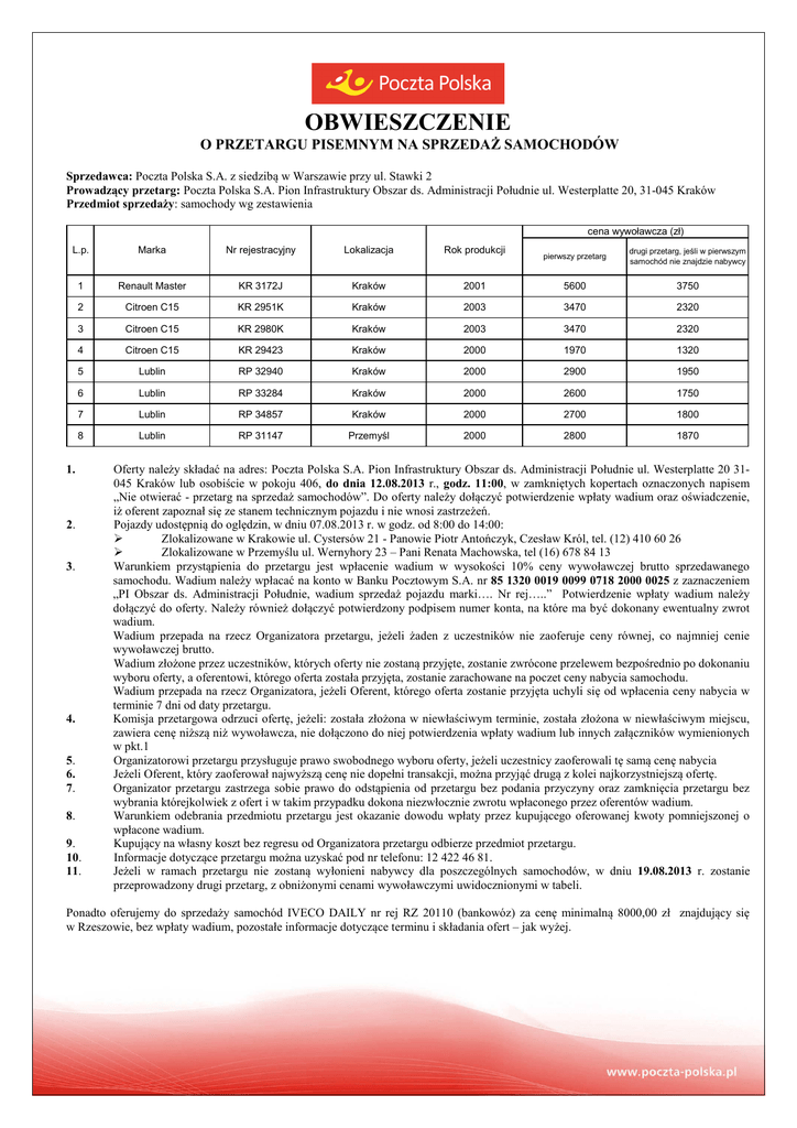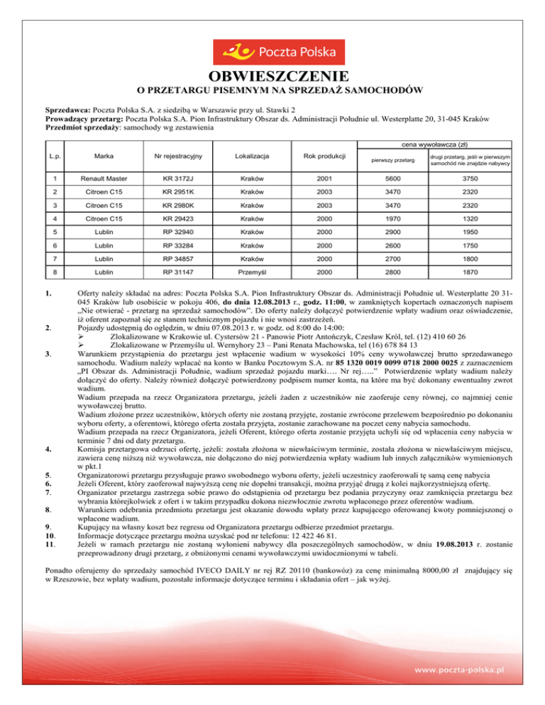 OBWIESZCZENIE O PRZETARGU PISEMNYM NA SPRZEDAŻ SAMOCHODÓW Sprzedawca: Poczta Polska S.A. z siedzibą w Warszawie przy ul. Stawki 2 Prowadzący przetarg: Poczta Polska S.A. Pion Infrastruktury Obszar ds. Administracji Południe ul. Westerplatte 20, 31-045 Kraków Przedmiot sprzedaży: samochody wg zestawienia cena wywoławcza (zł) L.p. Marka Nr rejestracyjny Lokalizacja Rok produkcji 1 Renault Master KR 3172J Kraków 2 Citroen C15 KR 2951K 3 Citroen C15 4 pierwszy przetarg drugi przetarg, jeśli w pierwszym samochód nie znajdzie nabywcy 2001 5600 3750 Kraków 2003 3470 2320 KR 2980K Kraków 2003 3470 2320 Citroen C15 KR 29423 Kraków 2000 1970 1320 5 Lublin RP 32940 Kraków 2000 2900 1950 6 Lublin RP 33284 Kraków 2000 2600 1750 7 Lublin RP 34857 Kraków 2000 2700 1800 8 Lublin RP 31147 Przemyśl 2000 2800 1870 1. 2. 3. 4. 5. 6. 7. 8. 9. 10. 11. Oferty należy składać na adres: Poczta Polska S.A. Pion Infrastruktury Obszar ds. Administracji Południe ul. Westerplatte 20 31045 Kraków lub osobiście w pokoju 406, do dnia 12.08.2013 r., godz. 11:00, w zamkniętych kopertach oznaczonych napisem „Nie otwierać - przetarg na sprzedaż samochodów”. Do oferty należy dołączyć potwierdzenie wpłaty wadium oraz oświadczenie, iż oferent zapoznał się ze stanem technicznym pojazdu i nie wnosi zastrzeżeń. Pojazdy udostępnią do oględzin, w dniu 07.08.2013 r. w godz. od 8:00 do 14:00: Zlokalizowane w Krakowie ul. Cystersów 21 - Panowie Piotr Antończyk, Czesław Król, tel. (12) 410 60 26 Zlokalizowane w Przemyślu ul. Wernyhory 23 – Pani Renata Machowska, tel (16) 678 84 13 Warunkiem przystąpienia do przetargu jest wpłacenie wadium w wysokości 10% ceny wywoławczej brutto sprzedawanego samochodu. Wadium należy wpłacać na konto w Banku Pocztowym S.A. nr 85 1320 0019 0099 0718 2000 0025 z zaznaczeniem „PI Obszar ds. Administracji Południe, wadium sprzedaż pojazdu marki…. Nr rej…..” Potwierdzenie wpłaty wadium należy dołączyć do oferty. Należy również dołączyć potwierdzony podpisem numer konta, na które ma być dokonany ewentualny zwrot wadium. Wadium przepada na rzecz Organizatora przetargu, jeżeli żaden z uczestników nie zaoferuje ceny równej, co najmniej cenie wywoławczej brutto. Wadium złożone przez uczestników, których oferty nie zostaną przyjęte, zostanie zwrócone przelewem bezpośrednio po dokonaniu wyboru oferty, a oferentowi, którego oferta została przyjęta, zostanie zarachowane na poczet ceny nabycia samochodu. Wadium przepada na rzecz Organizatora, jeżeli Oferent, którego oferta zostanie przyjęta uchyli się od wpłacenia ceny nabycia w terminie 7 dni od daty przetargu. Komisja przetargowa odrzuci ofertę, jeżeli: została złożona w niewłaściwym terminie, została złożona w niewłaściwym miejscu, zawiera cenę niższą niż wywoławcza, nie dołączono do niej potwierdzenia wpłaty wadium lub innych załączników wymienionych w pkt.1 Organizatorowi przetargu przysługuje prawo swobodnego wyboru oferty, jeżeli uczestnicy zaoferowali tę samą cenę nabycia Jeżeli Oferent, który zaoferował najwyższą cenę nie dopełni transakcji, można przyjąć drugą z kolei najkorzystniejszą ofertę. Organizator przetargu zastrzega sobie prawo do odstąpienia od przetargu bez podania przyczyny oraz zamknięcia przetargu bez wybrania którejkolwiek z ofert i w takim przypadku dokona niezwłocznie zwrotu wpłaconego przez oferentów wadium. Warunkiem odebrania przedmiotu przetargu jest okazanie dowodu wpłaty przez kupującego oferowanej kwoty pomniejszonej o wpłacone wadium. Kupujący na własny koszt bez regresu od Organizatora przetargu odbierze przedmiot przetargu. Informacje dotyczące przetargu można uzyskać pod nr telefonu: 12 422 46 81. Jeżeli w ramach przetargu nie zostaną wyłonieni nabywcy dla poszczególnych samochodów, w dniu 19.08.2013 r. zostanie przeprowadzony drugi przetarg, z obniżonymi cenami wywoławczymi uwidocznionymi w tabeli. Ponadto oferujemy do sprzedaży samochód IVECO DAILY nr rej RZ 20110 (bankowóz) za cenę minimalną 8000,00 zł znajdujący się w Rzeszowie, bez wpłaty wadium, pozostałe informacje dotyczące terminu i składania ofert – jak wyżej.