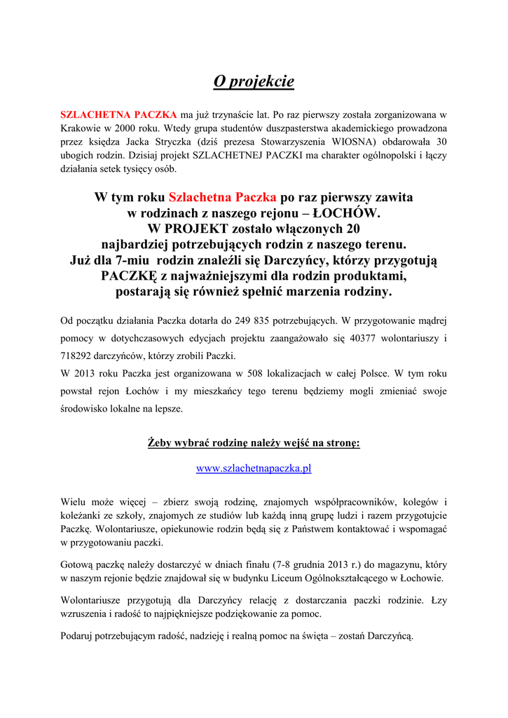 O projekcie SZLACHETNA PACZKA ma już trzynaście lat. Po raz pierwszy została zorganizowana w Krakowie w 2000 roku. Wtedy grupa studentów duszpasterstwa akademickiego prowadzona przez księdza Jacka Stryczka (dziś prezesa Stowarzyszenia WIOSNA) obdarowała 30 ubogich rodzin. Dzisiaj projekt SZLACHETNEJ PACZKI ma charakter ogólnopolski i łączy działania setek tysięcy osób. W tym roku Szlachetna Paczka po raz pierwszy zawita w rodzinach z naszego rejonu – ŁOCHÓW. W PROJEKT zostało włączonych 20 najbardziej potrzebujących rodzin z naszego terenu. Już dla 7-miu rodzin znaleźli się Darczyńcy, którzy przygotują PACZKĘ z najważniejszymi dla rodzin produktami, postarają się również spełnić marzenia rodziny. Od początku działania Paczka dotarła do 249 835 potrzebujących. W przygotowanie mądrej pomocy w dotychczasowych edycjach projektu zaangażowało się 40377 wolontariuszy i 718292 darczyńców, którzy zrobili Paczki. W 2013 roku Paczka jest organizowana w 508 lokalizacjach w całej Polsce. W tym roku powstał rejon Łochów i my mieszkańcy tego terenu będziemy mogli zmieniać swoje środowisko lokalne na lepsze. Żeby wybrać rodzinę należy wejść na stronę: www.szlachetnapaczka.pl Wielu może więcej – zbierz swoją rodzinę, znajomych współpracowników, kolegów i koleżanki ze szkoły, znajomych ze studiów lub każdą inną grupę ludzi i razem przygotujcie Paczkę. Wolontariusze, opiekunowie rodzin będą się z Państwem kontaktować i wspomagać w przygotowaniu paczki. Gotową paczkę należy dostarczyć w dniach finału (7-8 grudnia 2013 r.) do magazynu, który w naszym rejonie będzie znajdował się w budynku Liceum Ogólnokształcącego w Łochowie. Wolontariusze przygotują dla Darczyńcy relację z dostarczania paczki rodzinie. Łzy wzruszenia i radość to najpiękniejsze podziękowanie za pomoc. Podaruj potrzebującym radość, nadzieję i realną pomoc na święta – zostań Darczyńcą. Paczka to prezent – z jednej strony szlachetny i przygotowywany z myślą o konkretnej osobie, a z drugiej: wymarzony i długo oczekiwany. W SZLACHETNEJ PACZCE pomoc odpowiada na konkretne potrzeby danej rodziny, dlatego jest w stanie faktycznie zmienić jej trudną sytuację. Najważniejsze jest to, że darczyńca wie, dokładnie czego potrzebuje dana rodzina. Szlachetna Paczka pomaga osobom, co do których ma nadzieję, że będzie impulsem do zmiany. W Paczkach może znaleźć się wszystko – żywność, środki czystości, odzież, sprzęt AGD, książki, przybory szkolne, leki, zabawki i wszystko, czego może potrzebować rodzina. Chodzi o to, by odpowiedzieć na jak najwięcej jej potrzeb. Pomoc w SZLACHETNEJ PACZCE prócz tego, że jest realna, jest też prawdziwym prezentem – często spełnia marzenia, a darczyńcy starają się, by niosła ze sobą ona jak najwięcej radości. Prezent, który jest przygotowana z myślą o konkretnej osobie ma niezwykłą moc – potrafi czynić cuda. W całej Polsce przez najbliższe dni będą poszukiwani Darczyńcy - ludzie którzy chcą mądrze pomagać rodzinom w potrzebie ze swojego otoczenia. 16 listopada na stronie internetowej www.szlachetnapaczka.pl ruszyła baza z informacjami o rodzinach w potrzebie. Przez trzy tygodnie każdy będzie mógł wybrać jedną z nich i specjalnie dla jej członków przygotować wyjątkową paczkę. SZLACHETNA PACZKA pomocą obejmie w tym roku ponad 14 000 rodzin w trudnej sytuacji materialnej. Dokładna liczba rodzin, którym pomoże Paczka nie jest jeszcze znana, bo w ponad 500 miejscach w Polsce wolontariusze spotykali się z potrzebującymi w ich domach, by zdiagnozować sytuację, poznać potrzeby i podjąć decyzję o włączeniu do projektu. Na tej podstawie powstały opisy, które trafiają do internetowej bazy. Tam darczyńca może wybrać rodzinę ze swojej miejscowości i przygotować dla niej mądrą i skuteczną pomoc lub dokonać wpłaty na organizację projektu. Nie ma Polski biednej i bogatej. „Nie ma Polski biednej i bogatej. Jest jedna Polska” – to hasło tegorocznej kampanii SZLACHETNEJ PACZKI. Łączymy biednych i bogatych, gdyby nie Paczka nigdy by się nie spotkali, nie wiedzieliby o swoich istnieniach. Jednoczymy Polaków, którzy chcą mądrze pomagać, bez względu na podziały i różnice. Chcemy inspirować ludzi do walki z biedą i trudnościami oraz dawać im impuls do zmian. Zależy nam na Polsce, w której ludzie wstają z kolan i chcą wygrywać swoje życie. - Marzę o Polsce, w której SZLACHETNA PACZKA nie jest już potrzebna, o Polsce, w której kiedy ktoś spotyka człowieka w potrzebie - mówi: Chodź, ja mogę Ci pomóc – podkreśla ksiądz Jacek Stryczek. SZLACHETNA PACZKA do tej pory dotarła do 249 835 osób żyjących w niezawinionej biedzie – ludzi starszych, samotnych, rodzin dotkniętych chorobą lub niepełnosprawnością, samotnych rodziców i rodzin wielodzietnych. Kodeks Mądrego Pomagania – to zasady, którymi kierujemy się przy pomaganiu. Staramy się, aby pomoc była z serca i by była przemyślana. To dzięki tym zasadom udało nam się tak rozwinąć SZLACHETNĄ PACZKĘ. W Paczce zawsze najpierw są ideały, dopiero z nich wypływają działania. Szukamy biednych Do nas nie można się zgłosić po pomoc. Sami szukamy potrzebujących. Prawdziwa bieda jest cicha i skromna. Chcemy znaleźć tych, którzy naprawdę potrzebują pomocy. Nie pomagamy tym, którzy potrafią ją sobie załatwić. Spotkanie Odwiedzamy domy potrzebujących. Nie wystarczy nam, że ktoś mówi, że jest biedny. Osobiste spotkanie jest szansą na wzajemne zrozumienie. Osoby, do których trafiają wolontariusze mówią często: nie musicie już przynosić paczek. Wystarczy, że ktoś mnie odnalazł i chciał wysłuchać. Diagnoza Najpierw sprawdzamy, potem pomagamy. Co to za lekarz, który każdemu pacjentowi przepisuje aspirynę… najpierw powinna być diagnoza, a potem leczenie. Pomagamy tylko wtedy, gdy jesteśmy pewni