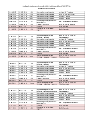 Studia niestacjonarne II stopnia GEOGRAFIA specjalność TURYSTYKA II rok - semestr jesienny 10 X 2015 11.15-13.30 1.26 Seminarium magisterskie dr hab. R. Twardosz 10 X 2015 11.15-13.30 3.13 Seminarium magisterskie prof. dr hab. W. Kurek 10 X 2015 11.15-13.30 Prac. Seminarium magisterskie dr hab. I. Sołjan 10 X 2015 11.15-13.30 Prac. dr hab. J. Balon 10 X 2015 14.00-16.30 1.21 10 X 2015 16.45-19.15 1.25 Seminarium magisterskie Globalne procesy społeczne i gospodarcze Prawo w turystyce 11 X 2015 8.30-11.00 1.21 dr K. Barska 11 X 2013 11.45-14.15 1.25 Filozofia Zarządzanie turystyką w regionie 17 X 2015 8.30-11.00 1.25 17 X 2015 11.15-13.30 1.26 Wybrane zagadnienia z etnologii - wykład Seminarium magisterskie prof. dr hab. R. GodulaWęcławowicz dr hab. R. Twardosz 17 X 2015 11.15-13.30 3.13 Seminarium magisterskie prof. dr hab. W. Kurek 17 X 2015 11.15-13.30 Prac. Seminarium magisterskie dr hab. I. Sołjan 17 X 2015 11.15-13.30 Prac. dr hab. J. Balon 17 X 2015 14.00-16.30 1.21 17 X 2015 16.45-19.15 1.25 Seminarium magisterskie Globalne procesy społeczne i gospodarcze Prawo w turystyce 18 X 2015 8.30-11.00 1.21 18 X 2013 11.45-14.15 teren Filozofia Wybrane zagadnienia z etnologii – zajęcia w muzeum dr K. Barska prof. dr hab. R. GodulaWęcławowicz 7 XI 2015 8.30-11.00 1.25 7 XI 2015 11.15-13.30 1.26 Wybrane zagadnienia z etnologii – wykład Seminarium magisterskie prof. dr hab. R. GodulaWęcławowicz dr hab. R. Twardosz 7 XI 2015 11.15-13.30 3.13 Seminarium magisterskie prof. dr hab. W. Kurek 7 XI 2015 11.15-13.30 Prac. Seminarium magisterskie dr hab. I. Sołjan 7 XI 2015 11.15-13.30 Prac. dr hab. J. Balon 7 XI 2015 14.00-16.30 1.21 7 XI 2015 16.45-19.15 1.25 Seminarium magisterskie Globalne procesy społeczne i gospodarcze Prawo w turystyce 8 XI 2015 8.30-11.00 1.21 8 XI 2015 11.45-14.15 Teren Filozofia Wybrane zagadnienia z etnologii - zajęcia w muzeum dr K. Barska prof. dr hab. R. GodulaWęcławowicz 21 XI 2015 8.30-11.00 1.25 21 XI 2015 11.15-13.30 1.26 Wybrane zagadnienia z etnologii -wykład + zaliczenie Seminarium magisterskie prof. dr hab. R. GodulaWęcławowicz dr hab. R. Twardosz 21 XI 2015 11.15-13.30 3.13 Seminarium magisterskie prof. dr hab. W. Kurek 21 XI 2015 11.15-13.30 Prac. Seminarium magisterskie dr hab. I. Sołjan 21 XI 2015 11.15-13.30 Prac. dr hab. J. Balon 21 XI 2015 14.00-16.30 1.21 22 XI 2015 8.30-11.00 1.21 22 XI 2015 11.45-14.15 1.25 Seminarium magisterskie Globalne procesy społeczne i gospodarcze Filozofia Zarządzanie turystyką w regionie Dr J. Więcław-Michniewska prof. dr hab. J. Sondel Dr R. Faracik Dr J. Więcław-Michniewska prof. dr hab. J. Sondel Dr J. Więcław-Michniewska prof. dr hab. J. Sondel Dr J. Więcław-Michniewska dr K. Barska Dr R. Faracik 5 XII 2015 5 XII 2015 8.30-11.00 11.15-13.30 1.25 1.26 Przedmiot do wyboru a1 Seminarium magisterskie dr hab. R. Twardosz 5 XII 2015 11.15-13.30 3.13 Seminarium magisterskie prof. dr hab. W. Kurek 5 XII 2015 11.15-13.30 Prac. Seminarium magisterskie dr hab. I. Sołjan 5 XII 2015 11.15-13.30 Prac. Seminarium magisterskie dr hab. J. Balon 5 XII 2015 14.00-16.30 1.25 Prawo w turystyce prof. dr hab. J. Sondel 6 XII 2015 8.30-11.00 1.21 dr K. Barska 6 XII 2015 11.15-13.45 1.25 6 XII 2015 14.15-16.15 1.25 Filozofia Zarządzanie turystyką w regionie Przedmiot do wyboru b 19 XII 2015 8.30-11.00 1.21 Filozofia dr K. Barska 19 XII 2015 11.15-13.30 1.26 Seminarium magisterskie dr hab. R. Twardosz 19 XII 2015 11.15-13.30 3.13 Seminarium magisterskie prof. dr hab. W. Kurek 19 XII 2015 11.15-13.30 Prac. Seminarium magisterskie dr hab. I. Sołjan 19 XII 2015 11.15-13.30 Prac. Seminarium magisterskie dr hab. J. Balon 19 XII 2015 14.00-16.30 1.25 Prawo w turystyce prof. dr hab. J. Sondel 20 XII 2015 8.30-11.00 1.21 20 XII 2015 11.15-13.45 1.25 Dr R. Faracik 20 XII 2015 14.15-16.15 1.25 Przedmiot do wyboru a Zarządzanie turystyką w regionie 4 Przedmiot do wyboru b 9 I 2016 9 I 2016 8.30-11.00 11.15-13.30 1.21 1.26 Filozofia Seminarium magisterskie dr K. Barska dr hab. R. Twardosz 9 I 2016 11.15-13.30 3.13 Seminarium magisterskie prof. dr hab. W. Kurek 9 I 2016 11.15-13.30 Prac. Seminarium magisterskie dr hab. I. Sołjan 9 I 2016 11.15-13.30 Prac. dr hab. J. Balon 9 I 2016 14.00-16.30 1.21 9 I 2016 16.45-19.15 1.25 Seminarium magisterskie Globalne procesy społeczne i gospodarcze Prawo w turystyce 23 I 2016 23 I 2016 8.30-11.00 11.15-13.30 1.21 1.26 Filozofia Seminarium magisterskie dr K. Barska dr hab. R. Twardosz 23 I 2016 11.15-13.30 3.13 Seminarium magisterskie prof. dr hab. W. Kurek 23 I 2016 11.15-13.30 Prac. Seminarium magisterskie dr hab. I. Sołjan 23 I 2016 11.15-13.30 Prac. dr hab. J. Balon 23 I 2016 14.00-16.30 1.25 23 I 2016 17.00-19.30 1.21 Seminarium magisterskie Prawo w turystyce – wykład + zaliczenie Globalne procesy społeczne i gospodarcze 6 II 2016 6 II 2016 8.30-11.00 11.15-13.30 1.21 1.26 Filozofia 9 Seminarium magisterskie dr K. Barska dr hab. R. Twardosz 6 II 2016 11.15-13.30 3.13 Seminarium magisterskie prof. dr hab. W. Kurek 6 II 2016 11.15-13.30 Prac. Seminarium magisterskie dr hab. I. Sołjan 6 II 2016 11.15-13.30 Prac. dr hab. J. Balon 6 II 2016 14.00-16.30 1.25 Seminarium magisterskie Globalne procesy społeczne i gospodarcze Dr R. Faracik Dr J. Więcław-Michniewska prof. dr hab. J. Sondel prof. dr hab. J. Sondel Dr J. Więcław-Michniewska Dr J. Więcław-Michniewska 20 II 2016 20 II 2016 8.30-11.00 11.15-13.30 1.21 1.26 Filozofia Seminarium magisterskie dr K. Barska dr hab. R. Twardosz 20 II 2016 11.15-13.30 3.13 Seminarium magisterskie prof. dr hab. W. Kurek 20 II 2016 11.15-13.30 Prac. Seminarium magisterskie dr hab. I. Sołjan 20 II 2016 11.15-13.30 Prac. dr hab. J. Balon 20 II 2016 16.00-17.30 1.21 Seminarium magisterskie Globalne procesy społeczne i gospodarcze – egzamin 1 Dr J. Więcław-Michniewska