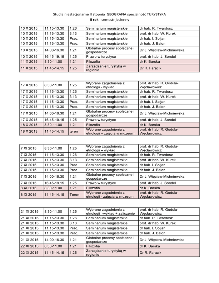 specjalność TURYSTYKA - semestr jesienny 2015/16