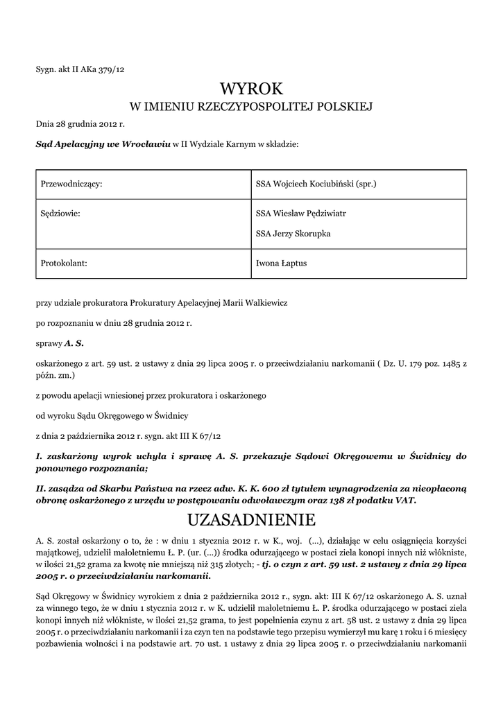 Sygn. akt II AKa 379/12 WYROK W IMIENIU RZECZYPOSPOLITEJ POLSKIEJ Dnia 28 grudnia 2012 r. Sąd Apelacyjny we Wrocławiu w II Wydziale Karnym w składzie: Przewodniczący: SSA Wojciech Kociubiński (spr.) Sędziowie: SSA Wiesław Pędziwiatr SSA Jerzy Skorupka Protokolant: Iwona Łaptus przy udziale prokuratora Prokuratury Apelacyjnej Marii Walkiewicz po rozpoznaniu w dniu 28 grudnia 2012 r. sprawy A. S. oskarżonego z art. 59 ust. 2 ustawy z dnia 29 lipca 2005 r. o przeciwdziałaniu narkomanii ( Dz. U. 179 poz. 1485 z późn. zm.) z powodu apelacji wniesionej przez prokuratora i oskarżonego od wyroku Sądu Okręgowego w Świdnicy z dnia 2 października 2012 r. sygn. akt III K 67/12 I. zaskarżony wyrok uchyla i sprawę A. S. przekazuje Sądowi Okręgowemu w Świdnicy do ponownego rozpoznania; II. zasądza od Skarbu Państwa na rzecz adw. K. K. 600 zł tytułem wynagrodzenia za nieopłaconą obronę oskarżonego z urzędu w postępowaniu odwoławczym oraz 138 zł podatku VAT. UZASADNIENIE A. S. został oskarżony o to, że : w dniu 1 stycznia 2012 r. w K., woj. (...), działając w celu osiągnięcia korzyści majątkowej, udzielił małoletniemu Ł. P. (ur. (...)) środka odurzającego w postaci ziela konopi innych niż włókniste, w ilości 21,52 grama za kwotę nie mniejszą niż 315 złotych; - tj. o czyn z art. 59 ust. 2 ustawy z dnia 29 lipca 2005 r. o przeciwdziałaniu narkomanii. Sąd Okręgowy w Świdnicy wyrokiem z dnia 2 października 2012 r., sygn. akt: III K 67/12 oskarżonego A. S. uznał za winnego tego, że w dniu 1 stycznia 2012 r. w K. udzielił małoletniemu Ł. P. środka odurzającego w postaci ziela konopi innych niż włókniste, w ilości 21,52 grama, to jest popełnienia czynu z art. 58 ust. 2 ustawy z dnia 29 lipca 2005 r. o przeciwdziałaniu narkomanii i za czyn ten na podstawie tego przepisu wymierzył mu karę 1 roku i 6 miesięcy pozbawienia wolności i na podstawie art. 70 ust. 1 ustawy z dnia 29 lipca 2005 r. o przeciwdziałaniu narkomanii orzekł przepadek na rzecz Skarbu Państwa i zarządził zniszczenie dowodu rzeczowego w postaci woreczka foliowego z zawartością suszu roślinnego, ujętego w wykazie dowodów rzeczowych na k. 41 akt sprawy oraz zasądził od Skarbu Państwa na rzecz adw. R. T. z Kancelarii Adwokackiej w Ś. 1.033,20 zł z VAT, tytułem wynagrodzenia za nieopłaconą obronę z urzędu oskarżonego; jego zaś zwolnił od obowiązku poniesienia kosztów postępowania, którymi obciążył Skarb Państwa. Apelację od tego wyroku wnieśli oskarżony i prokuratur. Obrońca oskarżonego zaskarżonemu wyrokowi zarzucił: 1. obrazę przepisów prawa materialnego, mianowicie art. 58 ust. 2 ustawy z dnia 29 lipca 2005 r. o przeciwdziałaniu narkomanii, wynikającą z jego bezzasadnego zastosowania do czynu przypisanego oskarżonemu, mimo że czyn ten nie wypełnia znamion przestępstwa określonego w tym przepisie, 2. rażącą niewspółmierność wymierzonej oskarżonemu kary pozbawienia wolności – wynikającą z jej wysokości i niezastosowania przy jej wymierzeniu art. 69 k.k. Obrońca oskarżonego wniósł o zmianę zaskarżonego wyroku przez uniewinnienie oskarżonego od zarzutu aktu oskarżenia albo o wymierzenie kary pozbawienia wolności w granicach dolnego zagrożenia, z zawieszeniem jej wykonania, ewentualnie o uchylenie wyroku i przekazanie sprawy sądowi pierwszej instancji do ponownego rozpoznania. Prokurator zaskarżonemu wyrokowi zarzucił (cyt. dosł. z apelacji): 1.błąd w ustaleniach faktycznych przyjętych za podstawę orzeczenia, mający wpływ na jego treść, polegający na niesłusznym przyjęciu, iż A. S. udzielił małoletniemu Ł. P. środka odurzającego w postaci ziela konopi innych niż włókniste, w ilości 21,52 grama, bez zamiaru osiągnięcia korzyści majątkowej, w celu zażycia części środka przez małoletniego oraz po to, aby małoletni zorientował się wśród kolegów, czy są zainteresowani używaniem tegoż środka, podczas gdy właściwa ocena zeznań świadka P. B. oraz Ł. P., z uznaniem za wiarygodne przede wszystkim tych, które złożył on na etapie postępowania przygotowawczego, jednoznacznie wskazują na to, iż przekazując małoletniemu tak istotną ilość ziela konopi oskarżony zarówno udzielił części środka małoletniemu na własny użytek, jak i działał w zamiarze wprowadzenia ich do obrotu za pośrednictwem Ł. P., z czego miał osiągnąć wymierną korzyść majątkową, co w konsekwencji winno skutkować rozważeniem przez Sąd możliwości przyjęcia kumulatywnej kwalifikacji czynu przypisanego oskarżonemu z art. 56 ust. 1 i art. 59 ust. 2 ustawy o przeciwdziałaniu narkomanii w zw. z art. 11 §2 k.k. a także w zw. z art. 64 k.k., przy czym podstawę do przyjęcia działania sprawcy w warunkach powrotu do przestępstwa należy odnieść do uprzedniego skazania A. S. za przestępstwa przeciwko mieniu i podobieństwa wynikającego z faktu działania sprawcy w celu osiągnięcia korzyści majątkowej. 2. rażącą niewspółmierność kary orzeczonej wobec oskarżonego A. S., polegającej na orzeczeniu kary w wymiarze 1 roku i 6 miesięcy pozbawienia wolności, gdy prawidłowa analiza materiału dowodowego w sprawie, nakazująca (jak wskazano w I zarzucie skargi) ocenę zachowania oskarżonego jako kumulatywnie kwalifikowany czyn wprowadzenia do obrotu środka odurzającego w postaci ziela konopi innych niż włókniste i udzielenia tegoż środka małoletniemu Ł. P., w celu osiągnięcia korzyści majątkowej, przy uwzględnieniu, iż przy tak skonstruowanej kwalifikacji, sprawca winien odpowiadać w warunkach powrotu do przestępstwa, w związku z uprzednim skazaniem za przestępstwa przeciwko mieniu, winna skutkować orzeczeniem wobec oskarżonego kary pozbawienia wolności w wymiarze 4 lat pozbawienia wolności. Podnosząc powyższe zarzuty, prokurator wniósł o uchylenie zaskarżonego wyroku i przekazanie sprawy do ponownego rozpoznania Sądowi I instancji.
