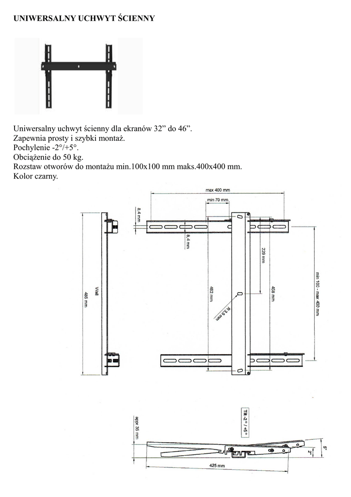 UNIWERSALNY UCHWYT ŚCIENNY Uniwersalny uchwyt ścienny dla ekranów 32” do 46”. Zapewnia prosty i szybki montaŜ. Pochylenie -2°/+5°. ObciąŜenie do 50 kg. Rozstaw otworów do montaŜu min.100x100 mm maks.400x400 mm. Kolor czarny.