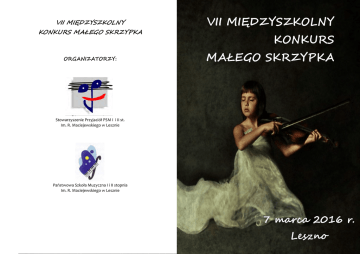 VII MIĘDZYSZKOLNY KONKURS MAŁEGO SKRZYPKA ORGANIZATORZY: VII MIĘDZYSZKOLNY KONKURS MAŁEGO SKRZYPKA Stowarzyszenie Przyjaciół PSM I i II st. Im. R. Maciejewskiego w Lesznie Państwowa Szkoła Muzyczna I i II stopnia Im. R. Maciejewskiego w Lesznie 7 marca 2016 r. Leszno VII MIĘDZYSZKOLNY KONKURS MAŁEGO SKRZYPKA REGULAMIN §1 1. Organizatorem VII MIĘDZYSZKOLNEGO KONKURSU MAŁEGO SKRZYPKA jest Państwowa Szkoła Muzyczna I i II stopnia im. Romana Maciejewskiego w Lesznie. §3 1. Występy uczestników będzie oceniać Jury powołane przez Organizatora. 2. Decyzje Jury są ostateczne. 3. Każdy Uczestnik otrzymuje dyplom uczestnictwa. 4. Dla laureatów konkursu przewidziane są nagrody i wyróżnienia, a o ich rozdziale decyduje Jury. 5. Ogłoszenie wyników końcowych, wręczenie nagród oraz koncert laureatów odbędzie się po zakończeniu obrad Jury w dniu konkursu. 2. Konkurs odbędzie się 7 marca 2016 r. w Sali Kameralnej PSM I i II st. im. R. Maciejewskiego w Lesznie. 3. Konkurs adresowany jest do uczniów klas II, III i IV cyklu sześcioletniego szkół muzycznych I stopnia. §4 1. Zgłoszenia uczestnictwa na załączonej karcie prosimy przesyłać do dnia 15 lutego 2016 r. na adres: Państwowa Szkoła Muzyczna I i II stopnia im. Romana Maciejewskiego w Lesznie §2 ul. Wałowa 3, 64-100 Leszno 1. Konkurs jest jednoetapowy i przebiega z udziałem publiczności. lub pocztą elektroniczną na adres: [email protected] 2. Przesłuchania konkursowe będą się odbywać w kolejności ustalonej przez Organizatora. 3. Uczestnicy zobowiązani są do wykonania dwóch utworów: a) obowiązkowego utworu z fortepianem ze zbioru Doroty Obijalskiej i Marcina Wawruka pt. „Skrzypiące nutki” 2. Do karty zgłoszenia należy dołączyć dowód uiszczenia opłaty wpisowej oraz podpisane oświadczenia rodziców (opiekunów prawnych) Uczestnika. 3. Wpisowe w wysokości 50 zł. należy wpłacić na konto Organizatora: 98 1010 1469 0025 5413 9134 0000 Uczestnicy z klasy II – „Pośpieszna ciuchcia” z dopiskiem „Konkurs Małego Skrzypka” Uczestnicy z klasy III – „Tuptuś w podskokach” Uczestnicy klasy IV – „Przedostatni dyliżans” b) jednego utworu dowolnego z literatury skrzypcowej na skrzypce solo lub z fortepianem 4. Uczestnicy konkursu są zobowiązani do wykonania utworów z pamięci. 5. Organizator nie zapewnia uczestnikom akompaniatora. oraz imieniem i nazwiskiem uczestnika 4. W wypadku rezygnacji z udziału w konkursie wpisowe nie będzie zwracane. 5. Koszty podróży, wyżywienia i zakwaterowania uczestnicy i ich akompaniatorzy pokrywają we własnym zakresie.