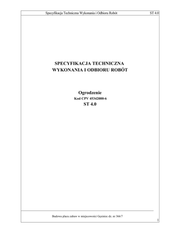 Specyfikacja Techniczna Wykonania i Odbioru Robót ST 4.0 SPECYFIKACJA TECHNICZNA WYKONANIA I ODBIORU ROBÓT Ogrodzenie Kod CPV 45342000-6 ST 4.0 Budowa placu zabaw w miejscowości Gęsiniec dz. nr 366/7 1 Specyfikacja Techniczna Wykonania i Odbioru Robót ST 4.0 1. WSTĘP 1.1. Przedmiot SST Przedmiotem niniejszej szczegółowej specyfikacji technicznej (SST) są wymagania dotyczące wykonania i odbioru robót związanych z budową ogrodzenia placu zabaw w miejscowości Gęsiniec dz. nr 366/7. 1.2. Zakres stosowania SST Szczegółowa specyfikacja techniczna (ST) stanów dokument przetargowy i kontraktowy przy zlecaniu i realizacji robót wymienionych w punkcie 1.1. 1.3. Zakres robót objętych SST Montaż ogrodzenia wys. 1,2m z paneli ogrodzeniowych stalowych np. NYLOFOR 3D PRO . Montaż furtki wejściowej o szer. 1,2m systemowej z kształtowników stalowych. 1.3.1. Zakres stosowania ogrodzeń Ogrodzenia są środkiem zabezpieczającym przed dostępem osób niepowołanych na teren placu zabaw oraz wybieganiem dzieci z placu zabaw. Projektowane ogrodzenie z paneli ogrodzeniowych np. NYLOFOR 3D PRO oraz NYLOFOR 2D Super Betafence na obrzeżach betonowych 6x20x100cm i podsypce piaskowej. 1.4. Ogólne wymagania dotyczące robót Wykonawca robót jest odpowiedzialny za jakość ich wykonania o za zgodność z specyfikacjami technicznymi i poleceniami Inspektora nadzoru. Ogólne wymagania dotyczące wykonania i odbioru robót podano w ST „Wymagania ogólne" Kod CPV45000000-7, punkt 1.5. 2. WYMAGANIA DOTYCZĄCE WŁAŚCIWOŚCI MATERIAŁÓW. 2.1. Ogólne wymagania dotyczące materiałów, ich pozyskiwania i składowania podano w ST „Wymagania ogólne" , pkt 2 2.2. Rodzaje materiałów Materiałami stosowanymi przy wykonaniu ogrodzeń, objętych niniejsza SST są: – panele ogrodzeniowe stalowe np. NYLOFOR 3D PRO – słupki metalowe i elementy metalowe połączeniowe – materiały do wykonywania fundamentów na mokro – obrzeża betonowe 6x20x100 Budowa placu zabaw w miejscowości Gęsiniec dz. nr 366/7 2 Specyfikacja Techniczna Wykonania i Odbioru Robót ST 4.0 2.3 Wymagania dotyczące materiałów Systemowe panele ogrodzeniowe długości 2500mm z prętów d5 mm zgrzewanych punktowo – panel ogrodzeniowy wysokości 1,23m pręt d 5mm zabezpieczony antykorozyjnie przez ocynkowanie+ powłoka poliestrową grub. 100mikronów. Słupy ocynkowane wewnątrz i na zewnątrz (minimalna grubość pokrycia 275 g/m2, z obydwu stron), zgodnie z normą EN 10147. – oczko panelu ogrodzeniowego 200x50mm – słupek wysokości 1700mm z profilu 70x44 wyposażony w kapturek – Beton na fundamenty B-15 3. WYMAGANIA DOTYCZĄCE SPRZĘTU, MASZYN I NARZĘDZI 3.1. Ogólne wymagania dotyczące sprzętu podano w ST „Wymagania ogólne ” Kod CPV45000000 - 7,pkt. 3 3.2. Sprzęt do wykonywania ogrodzeń Ustawienie ogrodzenia wykonuje się ręcznie: przy użyciu łopat, szpadli, młotków, wielokrążków. Do wykonania betonu można użyć na miejscu robót betoniarek. 4. WYMAGANIA DOTYCZĄCE TRANSPORTU 4.1. Ogólne wymagania dotyczące transportu podano w ST „Wymagania ogólne" Kod CPV45000000-7, punkt 4 4.2. Transport materiałów Siatkę, słupki, bramę i furtkę można przewozić dowolnymi środkami transportu, w warunkach zabezpieczających je przed uszkodzeniami mechanicznymi tj. uszkodzeniem powłok malarskich oraz otuliny drutu i siatki. 5. WYMAGANIA DOTYCZĄCE WYKONANIA ROBÓT 5.1. Ogólne zasady wykonania robót podano w ST „Wymagania ogólne" Kod CPV 45000000-7,punkt 5. 5.2 Zasady wykonywania ogrodzeń Przed wykonaniem ogrodzenia należy zaakceptowania przez Inspektora Nadzoru wytyczyć trasę w terenie do Budowa placu zabaw w miejscowości Gęsiniec dz. nr 366/7 3 Specyfikacja Techniczna Wykonania i Odbioru Robót ST 4.0 5.3. Podstawowe czynności objęte niniejszą SST przy montażu ogrodzenia : -wykopanie dołów pod słupki, - odsądzenie słupków ogrodzenia z betonowaniem fundamentu – osadzenia słupków przyfurtkowych z betonowaniem fundamentu – montaż cokołów z obrzeży trawnikowych - zamontowanie - obsadzenie furtki – montaż paneli 5.4 Wykonanie dołów pod słupki Doły pod słupki powinny mieć wymiar w planie o 20cm większy od wymiarów słupka, a gł, 0,8m. Należy wykonać doły pod słupki narożne i na załamaniach ogrodzenia, a następnie dokonać podziału odcinków prostych na mniejsze zgodnie z podziałem na montowane panele ogrodzeniowe wg zaleceń wybranego producenta paneli. Należy dążyć aby odległości między słupkami pośrednimi była jednakowa na całej długości ogrodzenia 5.5 Wykonanie fundamentów pod słupki Słupki osadzić w betonie ułożonym w dołku albo oprawione w bloczki betonowe. Słupek należy wstawić w gotowy wykop i napełnić otwór mieszanką betonową. Do czasu stwardnienia betonu słupek należy podeprzeć. Fundament betonowy wykonywany „na mokro” w którym osadzono słupek można wykorzystywać do dalszych prac co najmniej po 7 dniach od ustawienia słupka w betonie, a jeśli temperatura w czasie wykonywania fundamentu jest niższa od 10 0C – po 14 dniach 5.6 Ustawianie słupków Słupki powinny stać pionowo w linii ogrodzenia, a ich wierzchołki powinny znajdować się na jednakowej wysokości. Słupi powinny być zabezpieczone z góry przed dostępem wody. Słupki końcowe i narożne należy zabezpieczyć przed wychylaniem się ukośnymi słupkami wspierającymi, ustawionymi wzdłuż biegu pod kątem 300-450Słupki powinny być przystosowane do umocowania na nich linek usztywniających przez posiadanie odpowiednich uszek lub otworów do zaczepów i haków metalowych 6. WYMAGANIA DOTYCZĄCE KONTROLI JAKOŚCI ROBÓT 6.1. Ogólne zasady kontroli jakości robót Kontrola jakości robót przez inspektora nadzoru wskazanego przez inwestora. Sprawdzenie linii ogrodzenia, sposobu obsadzenia słupków ogrodzeniowych i przy bramowanych, naciągu siatki i drutów podtrzymujących obsadzenia bramy i furtek, stanu technicznego powłok ma