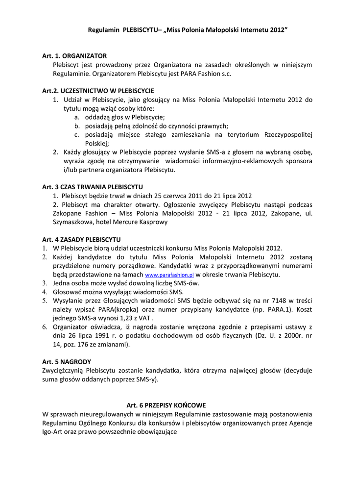 Regulamin PLEBISCYTU– „Miss Polonia Małopolski Internetu 2012” Art. 1. ORGANIZATOR Plebiscyt jest prowadzony przez Organizatora na zasadach określonych w niniejszym Regulaminie. Organizatorem Plebiscytu jest PARA Fashion s.c. Art.2. UCZESTNICTWO W PLEBISCYCIE 1. Udział w Plebiscycie, jako głosujący na Miss Polonia Małopolski Internetu 2012 do tytułu mogą wziąć osoby które: a. oddadzą głos w Plebiscycie; b. posiadają pełną zdolność do czynności prawnych; c. posiadają miejsce stałego zamieszkania na terytorium Rzeczypospolitej Polskiej; 2. Każdy głosujący w Plebiscycie poprzez wysłanie SMS-a z głosem na wybraną osobę, wyraża zgodę na otrzymywanie wiadomości informacyjno-reklamowych sponsora i/lub partnera organizatora Plebiscytu. Art. 3 CZAS TRWANIA PLEBISCYTU 1. Plebiscyt będzie trwał w dniach 25 czerwca 2011 do 21 lipca 2012 2. Plebiscyt ma charakter otwarty. Ogłoszenie zwycięzcy Plebiscytu nastąpi podczas Zakopane Fashion – Miss Polonia Małopolski 2012 - 21 lipca 2012, Zakopane, ul. Szymaszkowa, hotel Mercure Kasprowy Art. 4 ZASADY PLEBISCYTU 1. W Plebiscycie biorą udział uczestniczki konkursu Miss Polonia Małopolski 2012. 2. Każdej kandydatce do tytułu Miss Polonia Małopolski Internetu 2012 zostaną przydzielone numery porządkowe. Kandydatki wraz z przyporządkowanymi numerami będą przedstawione na łamach www.parafashion.pl w okresie trwania Plebiscytu. 3. Jedna osoba może wysłać dowolną liczbę SMS-ów. 4. Głosować można wysyłając wiadomości SMS. 5. Wysyłanie przez Głosujących wiadomości SMS będzie odbywać się na nr 7148 w treści należy wpisać PARA(kropka) oraz numer przypisany kandydatce (np. PARA.1). Koszt jednego SMS-a wynosi 1,23 z VAT . 6. Organizator oświadcza, iż nagroda zostanie wręczona zgodnie z przepisami ustawy z dnia 26 lipca 1991 r. o podatku dochodowym od osób fizycznych (Dz. U. z 2000r. nr 14, poz. 176 ze zmianami). Art. 5 NAGRODY Zwyciężczynią Plebiscytu zostanie kandydatka, która otrzyma najwięcej głosów (decyduje suma głosów oddanych poprzez SMS-y). Art. 6 PRZEPISY KOŃCOWE W sprawach nieuregulowanych w niniejszym Regulaminie zastosowanie mają postanowienia Regulaminu Ogólnego Konkursu dla konkursów i plebiscytów organizowanych przez Agencje Igo-Art oraz prawo powszechnie obowiązujące