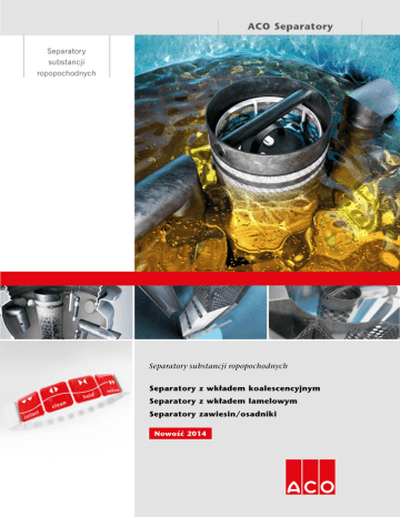 Separatory substancji ropopochodnych ACO Separatory Separatory substancji ropopochodnych Separatory substancji ropopochodnych Separatory z wkładem koalescencyjnym Separatory z wkładem lamelowym Separatory zawiesin/osadniki Nowość 2014 1 Separatory substancji ropopochodnych Separatory substancji ropopochodnych Dlaczego kluczowe jest obecnie zrównoważone zarządzanie wodami powierzchniowymi? 40% 30% 10% 55% ewapotranspiracja ewapotranspiracja spływanie 25% płytkie rozsączanie spływanie Podłoże naturalne Nawierzchnia 10% płytkie rozsączanie 25% 5% głębokie rozsączanie głębokie rozsączanie W wyniku gwałtownej urbanizacji naturalna cyrkulacja wodna została drastycznie zaburzona. W środowisku niezurbanizowanym 50% opadów wsiąka w grunt, a około 10% pozostaje na powierzchni. zbieranie podczyszczanie retencja i infiltracja wody deszczowej Czym powinien charakteryzować się dobrze zaprojektowany system zbierania wody deszczowej? Czym powinien charakteryzować się dobrze zaprojektowany system podczyszczania wody deszczowej? Czym powinien charakteryzować się dobrze zaprojektowany system magazynowania i uwalniania wody deszczowej? Obliczeniami hydraulicznymi dla danej zlewni Obliczeniami hydraulicznymi dotyczącymi podczyszczania wody Obliczeniami hydraulicznymi dla obszaru Prawidłowo zdefiniowaną klasą obciążenia zgodną Zgodnością z EN 858 lub innymi specyfikacjami technicznymi Stabilnością statyczną systemu Prostą i bezpieczną konserwacją Prostą konserwacją i nadzorem z obszarem zastosowania Gwarancją bezpieczeństwa Zgodnością z PN-EN 1433 (jeśli stosujemy odwodnienie liniowe) W wysoko zurbanizowanych obszarach 55% wody deszczowej pozostaje na powierzchni, a jedynie 15% wsiąka w grunt, jako że nawierzchnie utwardzone uniemożliwiają wsiąkanie wody. Kiedy należy stosować systemy odwodnień? Zasoby wodne zmniejszają się, a jednocześnie ich jakość spada, co oddziałuje zarówno na ludzi, jak i środowisko naturalne. Zawsze, gdy mamy do czynienia z powierzchniami utwardzonymi, uniemożliwiającymi naturalne wchłanianie wody, tj: kostką brukową projektowanie pomoc techniczna opieka Informowanie i edukowanie Planowanie i optymalizacja Pomoc techniczna i wsparcie na miejscu Obsługa posprzedażowa parkingi i obszary oddane do ruchu drogowego Wody powierzchniowe z parkingów, stacji benzynowych i innych powierzchniami betonowymi. szkolenie Zawsze na obszarach zagrożonych wyciekiem substancji ropopochodnych do wód powierzchniowych lub skażeniem cząsteczkami metali ciężkich, m.in. są to: stacje benzynowe i myjnie samochodowe. powierzchniami asfaltowymi Doskonałość rozwiązań produktowych ACO jest dodatkowo wspierana przez obsługę systemową Kiedy należy podczyszczać wodę? obszarów ruchu drogowego zawierają, w różnym stężeniu, substancje Kiedy należy zatrzymywać i/lub uwalniać wodę? Zawsze w przypadku ograniczonego odpływu i/lub chęci ponownego wykorzystania wody.Wytyczne dotyczące konieczności zastosowania systemów regulujących i rozsączających wodę powierzchniową: brak lub ograniczenie możliwości podłączenia odpływu do systemu kanalizacji deszczowej konieczność regulacji i kontroli przepływu Woda deszczowa gromadzi się na powierzchni pod wpływem ropopochodne, które mogą stanowić potencjalne zagrożenie ulewnych deszczów oraz topniejących śniegów. w przypadku zgromadzenia ich w systemie kanalizacyjnym. Z drugiej Aby nie powodować zniszczeń, konieczne jest jej szybkie strony, jeżeli substancje te zostaną uwolnione do środowiska Zagrożenie powodziami wzrasta w ostatnich latach ze względu na przetransportowanie z terenów narażonych na niepożądane naturalnego, stanowić będą zagrożenie dla gleby, wód podziemnych coraz częstsze i coraz bardziej dynamiczne opady nawalne. działanie wody. Systemy odwadniające gwarantują oraz środowiska. Zebrana woda powierzchniowa podczyszczana jest Z przyczyn ekonomicznych i technicznych istniejąca kanalizacja bezpieczeństwo, wygodę ludzi oraz ochronę budynków i dróg w celu zapobiegania przedostawaniu się tych niebezpiecznych cieczy deszczowa zaprojektowana jest tak, by była w stanie odprowadzać przed zniszczeniem wynikającym z zalegania wody. ACO oferuje do systemu kanalizacyjnego lub uwalnianiu ich do środowiska często niewielkie ilości opadów deszczu. Stąd szybkie zapełnianie się szeroki zakres systemów odwadniających zaprojektowanych naturalnego. ACO oferuje szereg separatorów substancji kanalizacji deszczowej w czasie trwającego dłuższy czas deszczu zgodnie ze szczególnymi wymaganiami projektu w celu ropopochodnych wykonanych na zbiornikach żelbetowych, nawalnego, powodujące szkody i zagrożenie na drogach uzyskania optymalnego działania. tworzywowych lub żeliwnych zaprojektowanych w taki sposób, i w budynkach. Innowacyjne systemy ACO gwarantują, że woda by spełniały wymagania danego projektu. pozostaje wewnątrz systemu, skąd może być odpowiednio chęć ponownego użycia zmagazynowanej wody. uwalniana. Zarządzanie wodami powierzchniowymi w tym obszarze zwiększa ochronę i bezpieczeństwo w sytuacjach ekstremalnych, umożliwiając jednocześnie ponowne użycie zasobów wody. ACO. Przyszłość odwodnień. ACO Qmax kanały odwadniające o dużej pojemności magazynowej 2 ACO Monoblock kanały odwadniające o konstrukcji monolitycznej Oleopator-C-FST separator substancji ropopochodnych zintegrowany z osadnikiem ACO Coalisator L żelbetowy separator substancji ropopochodnych z wkładem lamelowym ACO Stormbrixx system retencji i rozsączania ACO QBrake regulator przepływu 3 Separatory substancji ropopochodnych Separatory substancji ropopochodnych LOTNISKA AUTOSTRADY PARKINGI STACJE PALIW DROGI Spis treści Wstęp 6 Zastosowania 7 Separatory z wkładem koalescencyjnym 10 WOLNOSTOJĄCE z tworzywa sztucznego (PEHD) 12 DO ZABUDOWY W GRUNCIE z tworzywa sztucznego (PEHD) 20 DO ZABUDOWY W GRUNCIE żelbetowe 26 Se