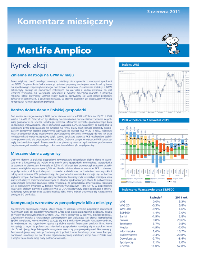 3 czerwca 2011 Komentarz miesięczny Rynek akcji Indeks WIG Zmienne nastroje na GPW w maju Przez większą część zeszłego miesiąca mieliśmy do czynienia z mocnymi spadkami na GPW. Dopiero końcówka maja przyniosła poprawę nastrojów oraz korektę trendu spadkowego zapoczątkowanego pod koniec kwietnia. Ostatecznie indeksy z GPW zakończyły miesiąc na poziomach zbliżonych do wartości z końca kwietnia, co jest lepszym wynikiem niż większość indeksów z rynków emerging markets z naszego regionu, które przyniosły ujemne stopy zwrotu. Sprawdziły się więc nasze prognozy zawarte w komentarzu z zeszłego miesiąca, w którym pisaliśmy, że oczekujemy w maju konsolidacji na warszawskim parkiecie. Bardzo dobre dane z Polskiej gospodarki 4.5% 4.4% 4.2% 3.0% 3.4% 3.2% 4.0% 3.2% 1.0% 1.7% II kw. III kw. 6.0% 0.5% 5.2% 6.3% 6.1% I kw. 8.0% II kw. 6.6% 6.6% 7.5% 6.6% 10.0% I kw. PKB w Polsce za 1 kwartał 2011 II kw. Pod koniec zeszłego miesiąca GUS podał dane o wzroście PKB w Polsce za 1Q 2011. PKB wzrósł o 4,4% r/r. Odczyt ten był zbliżony do oczekiwań i potwierdził utrzymanie się polskiej gospodarki na ścieżce solidnego wzrostu. Motorem wzrostu gospodarczego była konsumpcja indywidualna, której dynamika wyniosła 3,9% r/r. Uważamy, że kategoria ta wspierana przez poprawiającą się sytuację na rynku pracy oraz rosnące dochody gospodarstw domowych będzie pozytywnie wpływać na wzrost PKB w 2011 roku. Pierwszy kwartał przyniósł długo oczekiwane przyśpieszenie dynamiki inwestycji do 6% r/r oraz mniejszy wkład wzrostu zapasów, dzięki czemu struktura wzrostu PKB jest bardziej stabilna w porównaniu do poprzednich kwartałów. Dobrym danym o wzroście PKB towarzyszyły bardzo dobre wyniki finansowe firm za pierwszy kwartał: zysk netto w porównaniu do pierwszego kwartału zeszłego roku zanotował dwucyfrową dynamikę. 2.0% 0.0% Dobrym danym z polskiej gospodarki towarzyszyły rekordowo dobre dane o wzroście PKB z kluczowej dla Polski oraz strefy euro gospodarki niemieckiej. Gospodarka ta wzrosła w pierwszym kwartale o 5,2% r/r. Wzrost ten przekroczył znacznie oczekiwania analityków wynoszące 4,5% r/r. Bardzo dobre dane o wzroście PKB z Niemiec w połączeniu z dobrymi danymi o sprzedaży detalicznej za kwiecień oraz wysokimi odczytami indeksu IFO potwierdzają, że gospodarka niemiecka rozwija się w bardzo szybkim tempie. Bardzo dobrym danym z Niemiec towarzyszyła w zeszłym miesiącu seria słabszych danych makroekonomicznych ze Stanów Zjednoczonych. Dane te potwierdzają wcześniejsze wstępne szacunki, które wskazują, że gospodarka amerykańska rozwijała się w pierwszym kwartale w tempie rocznym wynoszącym 1,8% (3,1% w poprzednim kwartale). Słabym danym o wzroście PKB w USA towarzyszyły słabe publikacje z amerykańskiego rynku pracy oraz spadek indeksu ISM, który jednak utrzymuje się na poziomie powyżej 50 punktów. -2.0% Kontynuacja wzrostów w perspektywie kilku miesięcy WIG WIG 20 sWIG 80 S&P500 Banki Paliwa Telekomy Media Informatyka Budownictwo Deweloperzy Spo¿ywczy Chemia Kluczowymi czynnikami ryzyka, które mogą w krótkim terminie pogorszyć sentyment na rynkach akcji są: problemy finansowe Grecji oraz skutki zakończenia programu skupu aktywów skarbowych przez FED (tzw. QE2, który kończy się w czerwcu bieżącego roku). Czynnikiem ryzyka o charakterze wewnętrznym jest zbliżająca się oferta Jastrzębskiej Spółki Węglowej, której wielkość szacuje się na 5 miliardów złotych. Uważamy jednak, że ważniejsze od czynników ryzyka są dobre wyniki finansowe polskich firm, które korzystają z tego, że polska oraz niemiecka gospodarka rozwijają się w szybkim tempie. Oczekujemy, że polska giełda osiągnie nowe szczyty w perspektywie kilku miesięcy. Rekomendujemy więc zakup funduszy akcji polskich oraz funduszy typu nowa Europa, ponieważ uważamy, że po okresie pięciomiesięcznej stabilizacji akcje firm z Polski oraz z krajów sąsiednich mają duży potencjał wzrostu. 2007 2008 2009 2010 Spo¿ycie indywidualne Spo¿ycie publiczne Eksport netto Nak³ady inwestycyjne Zapasy PKB I kw. III kw. IV kw. II kw. I kw. IV kw. I kw. III kw. III kw. -6.0% IV kw. -4.0% IV kw. Mieszane dane z zagranicy 2011 Indeksy w Warszawie oraz S&P500 kwiecieñ 2011 rok 0,0% -0,3% -0,9% -1,4% -1,9% 0,8% 3,7% -4,9% 1,6% -9,4% -2,7% 7,1% 11,0% 5,3% 5,8% 4,6% 7,0% 2,8% 20,6% 9,8% -7,0% 10,7% -20,8% -8,4% 2,0% 57,8% 3 czerwca 2011 Komentarz miesięczny Rynek długu Kurs obligacji DS1020 Powolne wzrosty Indeks obligacji Citigroup Poland GBI po wzroście w kwietniu o 0,74%, w maju kontynuował trend wzrostowy zwiększając swoją wartość o kolejne 0,85%. Najbardziej wzrosły obligacje średnio i długoterminowe (powyżej 5 lat), niewielkie zmiany cen zanotowano również na krótkim końcu krzywej rentowności. Dobry sentyment na rynku długu spowodowany był przede wszystkim sytuacją na rynkach rozwiniętych. Pomimo stosunkowo wysokich wskaźników inflacji i wciąż utrzymującej się presji inflacyjnej, wynikającej przede wszystkim z wysokich cen surowców, obserwowane ostatnio pogorszenie się wskaźników aktywności gospodarczej spowodowało znaczące spadki rentowności papierów dłużnych w Europie i w USA. Nie przeszkodziła temu nawet utrzymująca się niepewność w Europie dotycząca rozwiązania problemów zadłużenia Grecji, oraz brak decyzji w sprawie zwiększenia limitu zadłużenia rządu federalnego w USA i kończący się w czerwcu program zakupu obligacji rządu amerykańskiego przez FED. W czerwcu, z uwagi na w/w problemy w USA i w Europie rynek będzie charakteryzował się większą zmiennością. Oferta produktowa Subfundusze Amplico Parasola Krajowego Subfundusze Amplico Parasola Światowego Pieniężny Lokacyjny Obligacji Obligacji Plus Aktywnej Alokacji Obligacji Światowych Stabilnego Wzrostu Zrównoważony Azjatycki Zrównoważony Nowa Europa Stabilnego Wzrostu Plus Akcji Akcji Małych Sp