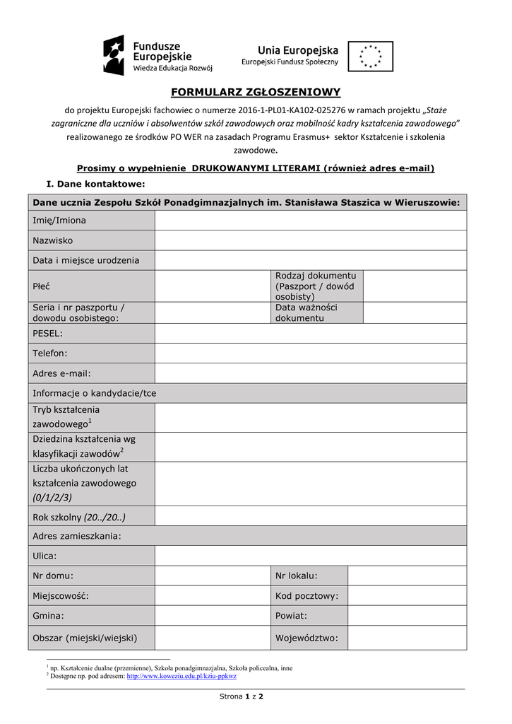FORMULARZ ZGŁOSZENIOWY do projektu Europejski fachowiec o numerze 2016-1-PL01-KA102-025276 w ramach projektu „Staże zagraniczne dla uczniów i absolwentów szkół zawodowych oraz mobilność kadry kształcenia zawodowego” realizowanego ze środków PO WER na zasadach Programu Erasmus+ sektor Kształcenie i szkolenia zawodowe. Prosimy o wypełnienie DRUKOWANYMI LITERAMI (również adres e-mail) I. Dane kontaktowe: Dane ucznia Zespołu Szkół Ponadgimnazjalnych im. Stanisława Staszica w Wieruszowie: Imię/Imiona Nazwisko Data i miejsce urodzenia Rodzaj dokumentu (Paszport / dowód osobisty) Data ważności dokumentu Płeć Seria i nr paszportu / dowodu osobistego: PESEL: Telefon: Adres e-mail: Informacje o kandydacie/tce Tryb kształcenia zawodowego1 Dziedzina kształcenia wg klasyfikacji zawodów2 Liczba ukończonych lat kształcenia zawodowego (0/1/2/3) Rok szkolny (20../20..) Adres zamieszkania: Ulica: Nr domu: Nr lokalu: Miejscowość: Kod pocztowy: Gmina: Powiat: Obszar (miejski/wiejski) Województwo: 1 2 np. Kształcenie dualne (przemienne), Szkoła ponadgimnazjalna, Szkoła policealna, inne Dostępne np. pod adresem: http://www.koweziu.edu.pl/kziu-ppkwz Strona 1 z 2 Dane kontaktowe do rodziców / opiekunów prawnych (w przypadku osób niepełnoletnich): Imię i nazwisko: Telefon: Wyrażam zgodę na przetwarzanie moich danych osobowych zawartych w formularzu dla celów rekrutacji do projektu „Staże zagraniczne dla uczniów i absolwentów szkół zawodowych oraz mobilność kadry kształcenia zawodowego” realizowanego ze środków PO WER na zasadach Programu Erasmus+ sektor Kształcenie i szkolenia zawodowe. Dane osobowe będą przetwarzane zgodnie z ustawą z dnia 29 sierpnia 1997 r. o ochronie danych osobowych ( Dz. U. z 2014 r. poz. 1182, z późn. zm.). …………….…………………………………….………………. data i podpis kandydata/tki W przypadku kandydata/tki niepełnoletniego/niej poniżej podpisuje się również rodzić lub opiekun prawny. Wyrażam zgodę na wzięcie udziału mojego syna/córki w jakimkolwiek działaniu typu mobilność. ……………….………………………………………………….. data i podpis rodzica/opiekuna II. Informacja dodatkowe o potencjalnym uczestniku projektu: Preferowany kraj wyjazdu (wybrać jeden zaznaczając „X” w kratce przy preferowanym kraju): Malta Hiszpania Oświadczam, że : deklaruję chęć uczestnictwa w całym Projekcie, tj. przygotowaniu, stażu zagranicznym i ewaluacji projektu; posiadam co najmniej ocenę poprawną z zachowania w roku szkolnym 2015/2016; przeczytałem(am) i akceptuję Regulamin uczestnictwa i rekrutacji do Projektu. III. Rekrutacja (szare pola są wypełniane przez Szkołę, kandydat/ka wypełnia tylko białe pola): Ocena z języka angielskiego Przyznane punkty w roku szkolnym rekrutacyjne: 2015/2016 Średnia z przedmiotów Przyznane punkty zawodowych w roku rekrutacyjne: szkolnym 2015/2016 Przyznane punkty Test językowy (j. angielski) rekrutacyjne: Suma punktów rekrutacyjnych: Wyrażam zgodę na przetwarzanie moich danych osobowych dla potrzeb niezbędnych do realizacji procesu rekrutacji w ramach projektu „Europejski fachowiec”, który organizowany jest przez Zespół Szkół Ponadgimnazjalnych im. Stanisława Staszica w Wieruszowie (zgodnie z Ustawą z dnia 29.08.1997 roku o Ochronie Danych Osobowych; tekst jednolity: Dz. U. z 2002r. Nr 101, poz. 926 ze zm.). Potwierdzam prawidłowość wszystkich podanych danych. ………………………………………………………………. Miejsce, data ………………………………………………………………………… Podpis Uczestnika i Opiekuna prawnego Strona 2 z 2