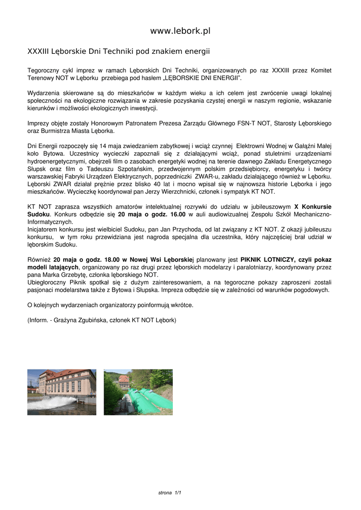 www.lebork.pl XXXIII Lęborskie Dni Techniki pod znakiem energii Tegoroczny cykl imprez w ramach Lęborskich Dni Techniki, organizowanych po raz XXXIII przez Komitet Terenowy NOT w Lęborku przebiega pod hasłem „LĘBORSKIE DNI ENERGII”. Wydarzenia skierowane są do mieszkańców w każdym wieku a ich celem jest zwrócenie uwagi lokalnej społeczności na ekologiczne rozwiązania w zakresie pozyskania czystej energii w naszym regionie, wskazanie kierunków i możliwości ekologicznych inwestycji. Imprezy objęte zostały Honorowym Patronatem Prezesa Zarządu Głównego FSN-T NOT, Starosty Lęborskiego oraz Burmistrza Miasta Lęborka. Dni Energii rozpoczęły się 14 maja zwiedzaniem zabytkowej i wciąż czynnej Elektrowni Wodnej w Gałąźni Małej koło Bytowa. Uczestnicy wycieczki zapoznali się z działającymi wciąż, ponad stuletnimi urządzeniami hydroenergetycznymi, obejrzeli film o zasobach energetyki wodnej na terenie dawnego Zakładu Energetycznego Słupsk oraz film o Tadeuszu Szpotańskim, przedwojennym polskim przedsiębiorcy, energetyku i twórcy warszawskiej Fabryki Urządzeń Elektrycznych, poprzedniczki ZWAR-u, zakładu działającego również w Lęborku. Lęborski ZWAR działał prężnie przez blisko 40 lat i mocno wpisał się w najnowsza historie Lęborka i jego mieszkańców. Wycieczkę koordynował pan Jerzy Wierzchnicki, członek i sympatyk KT NOT. KT NOT zaprasza wszystkich amatorów intelektualnej rozrywki do udziału w jubileuszowym X Konkursie Sudoku. Konkurs odbędzie się 20 maja o godz. 16.00 w auli audiowizualnej Zespołu Szkół MechanicznoInformatycznych. Inicjatorem konkursu jest wielbiciel Sudoku, pan Jan Przychoda, od lat związany z KT NOT. Z okazji jubileuszu konkursu, w tym roku przewidziana jest nagroda specjalna dla uczestnika, który najczęściej brał udział w lęborskim Sudoku. Również 20 maja o godz. 18.00 w Nowej Wsi Lęborskiej planowany jest PIKNIK LOTNICZY, czyli pokaz modeli latających, organizowany po raz drugi przez lęborskich modelarzy i paralotniarzy, koordynowany przez pana Marka Grzebytę, członka lęborskiego NOT. Ubiegłoroczny Piknik spotkał się z dużym zainteresowaniem, a na tegoroczne pokazy zaproszeni zostali pasjonaci modelarstwa także z Bytowa i Słupska. Impreza odbędzie się w zależności od warunków pogodowych. O kolejnych wydarzeniach organizatorzy poinformują wkrótce. (Inform. - Grażyna Zgubińska, członek KT NOT Lębork) strona 1/1 Powered by TCPDF (www.tcpdf.org)