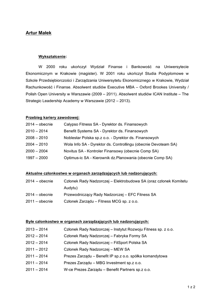 Artur Małek Wykształcenie: W 2000 roku ukończył Wydział Finanse i Bankowość na Uniwersytecie Ekonomicznym w Krakowie (magister). W 2001 roku ukończył Studia Podyplomowe w Szkole Przedsiębiorczości i Zarządzania Uniwersytetu Ekonomicznego w Krakowie, Wydział Rachunkowość i Finanse. Absolwent studiów Executive MBA – Oxford Brookes University / Polish Open University w Warszawie (2009 – 2011). Absolwent studiów ICAN Institute – The Strategic Leadership Academy w Warszawie (2012 – 2013). Przebieg kariery zawodowej: 2014 – obecnie Calypso Fitness SA - Dyrektor ds. Finansowych 2010 – 2014 Benefit Systems SA - Dyrektor ds. Finansowych 2008 – 2010 Noblestar Polska sp.z o.o. - Dyrektor ds. Finansowych 2004 – 2010 Wola Info SA - Dyrektor ds. Controllingu (obecnie Devoteam SA) 2000 – 2004 Novitus SA - Kontroler Finansowy (obecnie Comp SA) 1997 – 2000 Optimus-ic SA - Kierownik dz.Planowania (obecnie Comp SA) Aktualne członkostwo w organach zarządzających lub nadzorujących: 2014 – obecnie Członek Rady Nadzorczej – Elektrobudowa SA (oraz członek Komitetu Audytu) 2014 – obecnie Przewodniczący Rady Nadzorczej – EFC Fitness SA 2011 – obecnie Członek Zarządu – Fitness MCG sp. z o.o. Byłe członkostwo w organach zarządzających lub nadzorujących: 2013 – 2014 Członek Rady Nadzorczej – Instytut Rozwoju Fitness sp. z o.o. 2012 – 2014 Członek Rady Nadzorczej – Fabryka Formy SA 2012 – 2014 Członek Rady Nadzorczej – FitSport Polska SA 2011 – 2012 Członek Rady Nadzorczej – MEW SA 2011 – 2014 Prezes Zarządu – Benefit IP sp.z o.o. spółka komandytowa 2011 – 2014 Prezes Zarządu – MBG Investment sp.z o.o. 2011 – 2014 W-ce Prezes Zarządu – Benefit Partners sp.z o.o. 1z2 2010 – 2014 Członek Rady Nadzorczej – Vanity Style sp. z o.o. 2009 – 2010 Członek Zarządu – Noblestar Polska sp. z o.o. Artur Małek nie prowadzi, ani nie uczestniczy w prowadzeniu działalności, która byłaby konkurencyjna w stosunku do działalności Emitenta, nie uczestniczy w innej spółce konkurencyjnej jako wspólnik spółki cywilnej, spółki osobowej lub jako członek organu spółki kapitałowej oraz nie uczestniczy w innej konkurencyjnej osobie prawnej jako członek jej organu. 2z2