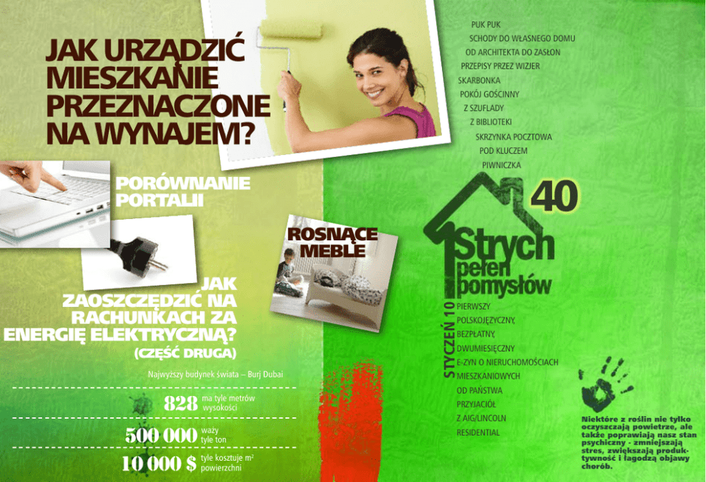 PUK PUK Jak urządzić mieszkanie przeznaczone na wynajem? SCHODY DO WŁASNEGO DOMU OD ARCHITEKTA DO ZASŁON PRZEPISY PRZEZ WIZJER SKARBONKA POKÓJ GOŚCINNY Z SZUFLADY Z BIBLIOTEKI SKRZYNKA POCZTOWA POD KLUCZEM PIWNICZKA porównanie portalii ROSNĄCE MEBLE Jak zaoszczędzić na rachunkach za energię elektryczną? 40 styczeń 10 Pierwszy polskojęzyczny, bezpłatny, dwumiesięczny (CZĘŚĆ DRUGA) e-zyn o nieruchomościach Najwyższy budynek świata – Burj Dubai tyle metrów 828 mawysokości waży 500 000 tyle ton tyle kosztuje m 10 000 $ powierzchni 2 mieszkaniowych od Państwa przyjaciół z AIG/Lincoln Residential Niektóre z roślin nie tylko oczyszczają powietrze, ale także poprawiają nasz stan psychiczny - zmniejszają stres, zwiększają produktywność i łagodzą objawy chorób. PUK, PUK PUK PUK SCHODY DO WŁASNEGO DOMU OD ARCHITEKTA DO ZASŁON Drodzy Czytelnicy! PRZEPISY PRZEZ WIZJER Zapraszamy do lektury okrągłego, czterdziestego wydania Strychu Pełnego SKARBONKA Pomysłów. Styczeń mamy w tym roku iście zimowy. Narciarze się cieszą, POKÓJ GOŚCINNY Z SZUFLADY a właściciele i zarządcy nieruchomości rwą włosy z głowy przy usuwaniu hałd Z BIBLIOTEKI śniegu, które i tak potrafią „odbudować się” w ciągu kilku godzin. I jednym i drugim polecamy chwilę odpoczynku przy lekturze naszego magazynu. SKRZYNKA POCZTOWA POD KLUCZEM Tym razem w OD A DO Z podpowiadamy jak mądrze wykończyć i wyposażyć PIWNICZKA mieszkanie przeznaczone na wynajem. W PRZEPISACH PRZEZ WIZJER prawnicy podsumowują wszystkie plusy i minusy zakupu nieruchomości licytowanej przez komornika. Nasz gość z kolei ma radę szalenie na czasie – jak zaoszczędzić na ogrzewaniu domu lub mieszkania. 40 Pokonujemy kolejny SCHODEK DO WŁASNEGO DOMU. Tym razem podpowiadamy gdzie szukać ofert i jak zrobić z nich najlepszy użytek. Jako uzupełnienie tego artykułu przygotowaliśmy dla Państwa swoisty ranking portali oferujących ogłoszenia z rynku nieruchomości. W BIBLIOTECE znajdą Państwo jak zawsze artykuły z czołowych polskich dzienników i tygodników. Tym razem sporo jest w nich prognoz gospodarczych na 2010 rok. W SZUFLADZIE natomiast czeka Państwa chwila wytchnienia przy kilku zabawnych ciekawostkach. styczeń 10 Pierwszy polskojęzyczny, bezpłatny, dwumiesięczny e-zyn o nieruchomościach mieszkaniowych Życzymy przyjemnej lektury! E.W. ? puk, puk od Państwa przyjaciół z AIG/Lincoln Residential Proces poszukiwania własnego lokum PUK PUK jest zawsze radosnym momentem, SCHODY DO WŁASNEGO DOMU OD ARCHITEKTA DO ZASŁON który stanowi początek nowego rozdziału w życiu. Dlatego zanim wy- PRZEPISY PRZEZ WIZJER bierzemy to właściwe miejsce warto zastanowić się czego tak naprawdę SKARBONKA szukamy i na czym najbardziej nam POKÓJ GOŚCINNY potrzeb stanowi klucz do przyszłego szczęścia w nowym miejscu niezależnie od tego czy zamieszkamy w dużej willi z basenem, trzydziestometrowej kawalerce, czy w pięknym apartamencie w śródmieściu. Schodek 2: Przejrzyj oferty Z SZUFLADY Z BIBLIOTEKI SKRZYNKA POCZTOWA POD KLUCZEM PIWNICZKA Po rodzinnych konsultacjach na temat Obowiązkowo powinniśmy sprawdzić Dokonując wyboru agencji nierucho- nowego lokum oraz dokładnym spre- zawartość takich stron internetowych mości powinniśmy dokładnie określić cyzowaniu własnych potrzeb jesteśmy jak: gratka.pl, oferty.net, trader.pl zadania pośrednika, aby jego funkcja gotowi na podjęcie pierwszej ważnej oraz lokalnymi gazetami zajmującymi nie sprowadzała się tylko do przeka- decyzji. Rynek wtórny czy rynek pier- się tematyką nieruchomości. zania adresu lokalizacji nieruchomo- wotny oto jest pytanie? Oczywiście Nieocenionym źródłem informacji ści, a następnie uczestnictwa w akcie każda opcja ma swoje wady i zalety, o ciekawych ofertach na rynku notarialnym przy podpisaniu umowy dlatego indywidualnie powinniśmy lokalnym są również znajomi, koledzy ostatecznej. podjąć decyzję mając na względzie z pracy czy członkowie rodziny. Osoby środki finansowe dostępne na z bardziej zasobnym portfelem mogą koncie oraz ilość czasu, który możemy zdecydować się na skorzystanie z poświęcić na wykończenie przyszłego usług agencji pośrednictwa w takim lokum. Następnie warto zapoznać się przypadku liczyć się trzeba z prowizją z ofertami zamieszczonymi w gazecie sięgającą od 2,5% do 3,5% wartości i Internecie. nieruchomości. c. d. è polskojęzyczny, bezpłatny, dwumiesięczny e-zyn o nieruchomościach mieszkaniowych od Państwa przyjaciół z AIG/Lincoln Residential schody do własnego domu 40 Pierwszy styczeń 10 zależy. Dokładne określenie własnych Przeglądając ogłoszenia kolejnych oraz notatnik, aby po powrocie na transakcja faktycznie dojdzie do skut- nieruchomości znajdujących się w wy- spokojnie wraz z bliskimi przeanali- ku. Pamiętajmy jednak, że wszelkie branej przez nas lokalizacji szybko zować walory oraz wady oglądanego umowy zawierane u notariusza są dojdziemy do wniosku, że tak napraw- lokum ponownie. Gdy zdecydujemy, objęte taksą notarialną oraz kosztami dę każda nieruchomość jest inna. iż dane mieszkanie bądź dom spełnia opłaty sądowej. Dlatego przy ogólnej ocenie danego nasze kryteria i zdecydujemy się na Mając podpisany akt notarialny SKARBONKA mieszkania bądź domu będziemy zakup, aby uniknąć niepotrzebnych w ręku możemy odetchnąć z ulgą POKÓJ GOŚCINNY musieli rozważyć wszystkie kluczowe komplikacji w przyszłości powinniśmy i odpocząć przed przeprowadzką, elementy składające się na cenę. sprawdzić stan prawny nieruchomości, która będzie jeszcze trudniejsza od Szczególną uwagę powinniśmy zwró- mam tu na myśli księgę wieczystą, poszukiwań naszego nowego lokum. cić na: standard wykończenia, techno- hipotekę oraz zaległości poprzednich logię budowy, specyfikację techniczną, właścicieli. Pominięcie aspektu praw- stan zewnętrzny elewacji, sąsiedztw