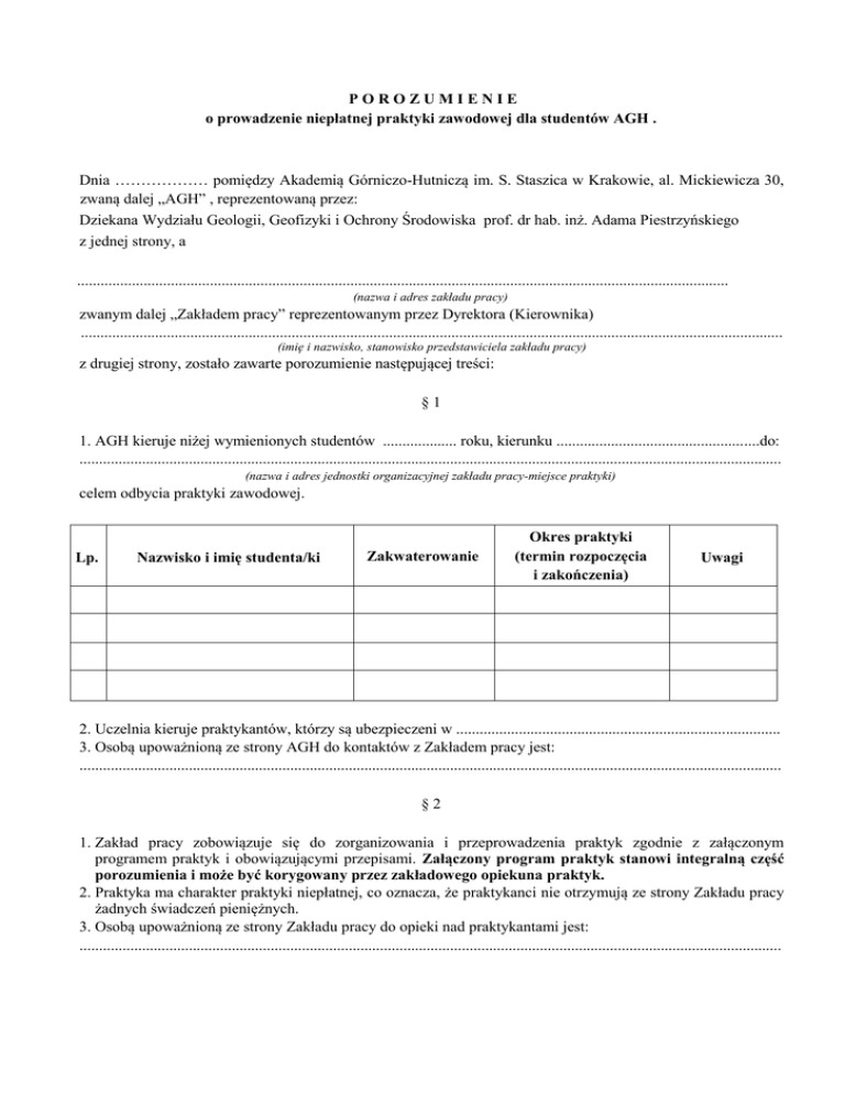 POROZUMIENIE o prowadzenie niepłatnej praktyki zawodowej dla studentów AGH . Dnia ……………… pomiędzy Akademią Górniczo-Hutniczą im. S. Staszica w Krakowie, al. Mickiewicza 30, zwaną dalej „AGH” , reprezentowaną przez: Dziekana Wydziału Geologii, Geofizyki i Ochrony Środowiska prof. dr hab. inż. Adama Piestrzyńskiego z jednej strony, a ....................................................................................................................................................................... (nazwa i adres zakładu pracy) zwanym dalej „Zakładem pracy” reprezentowanym przez Dyrektora (Kierownika) .................................................................................................................................................................................... (imię i nazwisko, stanowisko przedstawiciela zakładu pracy) z drugiej strony, zostało zawarte porozumienie następującej treści: §1 1. AGH kieruje niżej wymienionych studentów ................... roku, kierunku ....................................................do: .................................................................................................................................................................................... (nazwa i adres jednostki organizacyjnej zakładu pracy-miejsce praktyki) celem odbycia praktyki zawodowej. Lp. Nazwisko i imię studenta/ki Zakwaterowanie Okres praktyki (termin rozpoczęcia i zakończenia) Uwagi 2. Uczelnia kieruje praktykantów, którzy są ubezpieczeni w ................................................................................... 3. Osobą upoważnioną ze strony AGH do kontaktów z Zakładem pracy jest: .................................................................................................................................................................................... §2 1. Zakład pracy zobowiązuje się do zorganizowania i przeprowadzenia praktyk zgodnie z załączonym programem praktyk i obowiązującymi przepisami. Załączony program praktyk stanowi integralną część porozumienia i może być korygowany przez zakładowego opiekuna praktyk. 2. Praktyka ma charakter praktyki niepłatnej, co oznacza, że praktykanci nie otrzymują ze strony Zakładu pracy żadnych świadczeń pieniężnych. 3. Osobą upoważnioną ze strony Zakładu pracy do opieki nad praktykantami jest: .................................................................................................................................................................................... §3 Zakład pracy zobowiązuje się do zapewnienia warunków niezbędnych do prowadzenia praktyki a w szczególności do: 1. zapewnienia odpowiednich stanowisk pracy, pomieszczeń, warsztatów, urządzeń, narzędzi i materiałów, zgodnie z programem praktyki, stanowiącym integralną część niniejszego porozumienia, 2. zapoznania studentów z zakładowym regulaminem pracy, przepisami o bezpieczeństwie i higienie pracy oraz o ochronie tajemnicy państwowej i służbowej, 3. nadzoru nad wykonaniem przez studentów zadań wynikających z programu praktyki, 4. zapewnienia studentom na czas odbywania praktyki odzieży ochronnej oraz sprzętu ochrony osobistej i środków higieny, przewidzianych w przepisach o bezpieczeństwie i higienie pracy, 5. udostępnienia niezbędnych danych o Zakładzie pracy, koniecznych studentom do napisania sprawozdania z praktyki zawodowej. §4 AGH zobowiązana jest do sprawowania nadzoru dydaktycznego oraz organizacyjnego nad przebiegiem praktyk, a w szczególności do: 1) wyznaczenia opiekuna praktyki sprawującego nadzór dydaktyczno-wychowawczy oraz organizacyjny nad przebiegiem praktyk. §5 1. Studenci zobowiązani są do odbycia praktyki zgodnie z programem praktyk i zgodnie z zasadami obowiązującymi w Zakładzie pracy, dotyczy to w szczególności zasad BHP i ppoż., czasu pracy, porządku i dyscypliny oraz dochowania tajemnicy służbowej i ochrony danych osobowych. 2. Studenci naruszający w rażący sposób zasady odbywania praktyki mogą być przez Zakład pracy wydaleni z praktyki. O fakcie tym zostanie poinformowany przedstawiciel AGH wymieniony w § 1 ust.3. §6 Po odbyciu praktyki przez studentów Zakład pracy potwierdzi ten fakt poprzez wydanie stosownego zaświadczenia. §7 Wszelkie zmiany niniejszej umowy wymagają formy pisemnej, a sprawy nieuregulowane w umowie są rozstrzygane na podstawie Kodeksu Pracy i Kodeksu Cywilnego. §8 Umowę sporządzono w dwóch jednobrzmiących egzemplarzach, po jednym dla każdej ze stron. ....................................................... podpis Dziekana ....................................................................... podpis Dyrektora Zakładu pracy lub osoby upoważnionej Prosimy o zwrot podpisanej kopii Załączniki do umowy: 1. Program praktyki