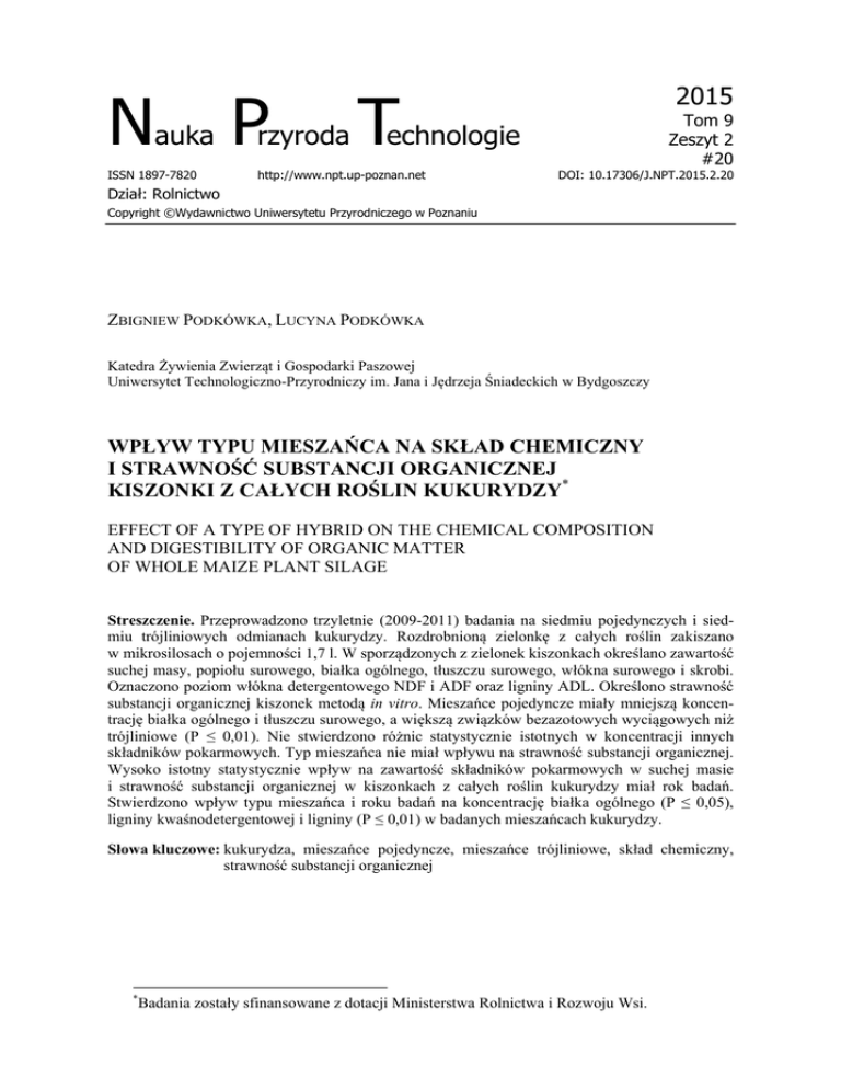 Nauka Przyroda Technologie ISSN 1897-7820 http://www.npt.up-poznan.net 2015 Tom 9 Zeszyt 2 #20 DOI: 10.17306/J.NPT.2015.2.20 Dział: Rolnictwo Copyright ©Wydawnictwo Uniwersytetu Przyrodniczego w Poznaniu ZBIGNIEW PODKÓWKA, LUCYNA PODKÓWKA Katedra Żywienia Zwierząt i Gospodarki Paszowej Uniwersytet Technologiczno-Przyrodniczy im. Jana i Jędrzeja Śniadeckich w Bydgoszczy WPŁYW TYPU MIESZAŃCA NA SKŁAD CHEMICZNY I STRAWNOŚĆ SUBSTANCJI ORGANICZNEJ KISZONKI Z CAŁYCH ROŚLIN KUKURYDZY* EFFECT OF A TYPE OF HYBRID ON THE CHEMICAL COMPOSITION AND DIGESTIBILITY OF ORGANIC MATTER OF WHOLE MAIZE PLANT SILAGE Streszczenie. Przeprowadzono trzyletnie (2009-2011) badania na siedmiu pojedynczych i siedmiu trójliniowych odmianach kukurydzy. Rozdrobnioną zielonkę z całych roślin zakiszano w mikrosilosach o pojemności 1,7 l. W sporządzonych z zielonek kiszonkach określano zawartość suchej masy, popiołu surowego, białka ogólnego, tłuszczu surowego, włókna surowego i skrobi. Oznaczono poziom włókna detergentowego NDF i ADF oraz ligniny ADL. Określono strawność substancji organicznej kiszonek metodą in vitro. Mieszańce pojedyncze miały mniejszą koncentrację białka ogólnego i tłuszczu surowego, a większą związków bezazotowych wyciągowych niż trójliniowe (P ≤ 0,01). Nie stwierdzono różnic statystycznie istotnych w koncentracji innych składników pokarmowych. Typ mieszańca nie miał wpływu na strawność substancji organicznej. Wysoko istotny statystycznie wpływ na zawartość składników pokarmowych w suchej masie i strawność substancji organicznej w kiszonkach z całych roślin kukurydzy miał rok badań. Stwierdzono wpływ typu mieszańca i roku badań na koncentrację białka ogólnego (P ≤ 0,05), ligniny kwaśnodetergentowej i ligniny (P ≤ 0,01) w badanych mieszańcach kukurydzy. Słowa kluczowe: kukurydza, mieszańce pojedyncze, mieszańce trójliniowe, skład chemiczny, strawność substancji organicznej * Badania zostały sfinansowane z dotacji Ministerstwa Rolnictwa i Rozwoju Wsi. 2 Podkówka, Z., Podkówka, L. (2015). Wpływ typu mieszańca na skład chemiczny i strawność substancji organicznej kiszonki z całych roślin kukurydzy. Nauka Przyr. Technol., 9, 2, #20. DOI: 10.17306/J.NPT.2015.2.20 Wstęp Kukurydzę zwyczajną (Zea mays L.) w naszej strefie geograficznej zaliczamy do roślin bardzo młodych oraz egzotycznych z uwagi na pochodzenie. O dużym zainteresowaniu uprawą kukurydzy przesądzają przede wszystkim jej cechy użytkowe: możliwość wykorzystania całej jej nadziemnej biomasy jako paszy, żywności lub surowca przemysłowego. Zasadniczej przyczyny tego zjawiska należy upatrywać we wprowadzeniu do uprawy mieszańców liniowych, które bardzo szybko zastąpiły odmiany populacyjne i mieszańce odmianowe. W mieszańcach liniowych realizuje się w praktyce zjawisko heterozji poprzez wykorzystanie korzystnych następstw krzyżowania odpowiednio dobranych form rodzicielskich (Adamczyk i in., 2010). Odmiany mieszańcowe w porównaniu z populacyjnymi charakteryzują się większym o 20-30% plonowaniem, zdecydowanie mniejszą podatnością na choroby fuzaryjne i wyleganie łodygowe w okresie dojrzewania oraz łatwiejszym dostosowywaniem się do trudnych warunków środowiskowych (Siódmiak, 2006). Jak podkreśla Adamczyk (2001), bez względu na kierunek użytkowania, na wielkość i jakość zebranego plonu wpływają następujące czynniki: agrotechnika – w 40%, warunki klimatyczne – w 30% i dobór odmiany – w 30%. Tak więc prawie jedna trzecia oczekiwanego efektu zależy od wyboru odpowiedniej odmiany. W krajach przodujących w produkcji kukurydzy spośród różnych typów odmian 75-100% areału uprawnego zajmują mieszańce pojedyncze (Adamczyk, 2005). W krajowym rejestrze w 2013 roku mieszańce pojedyncze stanowiły 57%, a trójliniowe 42%. Znajdowały się tam również dwie odmiany mieszańcowe czteroliniowe (Centralny Ośrodek..., 2013). Rodzaj mieszańca kukurydzy może być jednym z czynników, które wpływają na wartość odżywczą kiszonki z kukurydzy (Forouzmand i in., 2005). Celem przeprowadzonego badania było porównanie kiszonek sporządzonych z pojedynczych i trójliniowych mieszańców kukurydzy pod względem zawartości podstawowych składników pokarmowych, skrobi, frakcji włókna pokarmowego oraz strawności substancji organicznej określanej metodą in vitro. Zakładano, że typ mieszańca ma wpływ na skład chemiczny i strawność substancji organicznej. Materiał i metody Badania przeprowadzono w latach 2009-2011. Materiał badawczy stanowiły kiszonki sporządzone z zielonek z całych roślin kukurydzy. W każdym roku badań ocenie poddano siedem pojedynczych i siedem trójliniowych eksperymentalnych mieszańców kukurydzy polskiej hodowli. Materiał świeży Próbki zielonek do badań pobierano w firmach hodowlano-nasiennych z trzech lokalizacji – Hodowla Roślin Kobierzyce (woj. dolnośląskie, 50°58'0"N, 16°55'0"E), Hodowla Roślin Smolice (woj. wielkopolskie, 51°42'12"N, 17°10'10"E) oraz Hodowla Roślin Radzików (woj. mazowieckie, 52°13'39"N, 20°36'57"E). Warunki pogodowe w czasie wegetacji przedstawiono w tabeli 1. Zielonkę zbierano w fazie dojrzałości 3 Podkówka, Z., Podkówka, L. (2015). Wpływ typu mieszańca na skład chemiczny i strawność substancji organicznej kiszonki z całych roślin kukurydzy. Nauka Przyr. Technol., 9, 2, #20. DOI: 10.17306/J.NPT.2015.2.20 woskowej ziarna i zakiszano w mikrosilosach o pojemności 1,7 l. Każdy mieszaniec zakiszony został w sześciu powtórzeniach (po dwa mikrosilosy z każdego miejsca pobrania próby). Analiza kiszonek Po 6 tygodniach od sporządzenia kiszonek mikrosilosy otworzono i pobrano próbki do analiz. Po podsuszeniu do stałej wagi w temperaturze 55°C materiał zmielono w młynku (SM 100, Retsch) do wielkości cząstek 1 mm. W podsuszonych kiszonkach określono zawartość suchej masy metodą suszarkową oraz poziom 