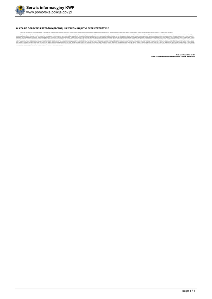 Serwis informacyjny KWP www.pomorska.policja.gov.pl W CZASIE GORĄCZKI PRZEDŚWIĄTECZNEJ NIE ZAPOMINAJMY O BEZPIECZEŃSTWIE Zbli?aj? si? ?wi?ta Bo?ego Narodzenia. Dla wielu z nas jest to czas wyjazdów z domu, zakupów ?wi?tecznych oraz zwi?zanego z tym wszystkim zamieszania. W tej wielkiej przed?wi?tecznej gor?czce zadbajmy o bezpiecze?stwo swoje i bliskich. Policjanci apeluj?, zróbmy wszystko, aby te szczególne dni min??y w spokoju i mi?ej atmosferze. Policjanci przypominaj?!- Nie zostawiaj warto?ciowych przedmiotów w widocznym miejscu w samochodzie; • podczas zakupów pilnuj swojego baga?u; • trzymaj pieni?dze i dokumenty w bezpiecznym miejscu; • nie no? karty bankomatowej razem z nr PIN; • torebk? zawsze no? zamkni?t? i odwrócon? zamkiem „do siebie”, a nie na zewn?trz; • unikaj noszenia torebki na pasku z ty?u; • portmonetka zawsze powinna znajdowa? si? na dnie torebki; • nie trzymaj gotówki w jednym miejscu; • nie no? przy sobie wi?cej gotówki, ni? wynika to z potrzeby zakupów w danym dniu; • nie demonstruj zawarto?ci portfela; • nie no? portfela w tylnej kieszeni spodni; • podczas przymierzania rzeczy, pakowania, p?acenia w sklepie nie odstawiaj torebki; • klucze do mieszkania no? w innym miejscu ni? dokumenty; • nie zostawiaj torebki na wieszaku , oparciu krzes?a w punktach us?ugowych.- Uwa?ajmy przy bankomatach. Tutaj tak?e mo?emy pa?? ofiar? z?odziei i oszustów. Oszu?ci montuj? nak?adki ze skanerami na czytniki kart magnetycznych, nak?adki na klawiatury lub minikamery do przechwycenia numerów PIN. I cho? trudno stwierdzi?, czy na bankomacie jest za?o?ona nak?adka, to warto zachowa? ostro?no??, a swoimi podejrzeniami podzieli? si? z Policj?.- Zabezpiecz mieszkanie:Pami?tajmy, aby wyje?d?aj?c na ?wi?ta do najbli?szych, swoje mieszkanie pozostawi? pod okiem przyjaznego s?siada. Baczny s?siad nigdy nie odmówi pomocy. Cz?sto zauwa?y obce osoby, które kr?c? si? w pobli?u naszego domu b?d? mieszkania. Wtedy przest?pcy rezygnuj? ze swych zamiarów.Wychodz?c z domu:• zamknij wszystkie okna i drzwi.• nie zostawiaj kluczy w tzw. dobrych schowkach - z?odziej zazwyczaj zna te miejsca nie gorzej od Ciebie; • zamknij równie? okienka piwniczne i innych pomieszcze? gospodarczych, przez które mo?na przedosta? si? do mieszkania; • wychodz?c wieczorem z domu zaci?gnij zas?ony lub opu?? ?aluzje i pozostaw w pokoju w??czone ?wiat?o - stwórz pozory, ?e w domu kto? jest; • nie pozostawiaj w drzwiach ?adnych kartek typu "wysz?am do Zosi", w?amywacz bardzo lubi gwarancje, ?e mieszkanie jest puste; • je?eli masz telefon z automatyczn? sekretark?, nie nagrywaj wiadomo?ci, o której wracasz do domu. W?amywacz mo?e równie? skorzysta? z takiej informacji; • wychodz?c, nawet na krótko, po list do skrzynki czy wyrzuci? ?mieci - zamykaj drzwi na klucz. Z?odziej nie potrzebuje wiele czasu, aby wtargn?? do Twojego mieszkania."Niezapowiedziani go?cie"Przed ?wi?tami i w same ?wi?ta cz?sto odwiedzaj? nas w domach osoby potrzebuj?ce pomocy, akwizytorzy, itp. Pami?tajmy, mog? to by? te? oszu?ci. Otwieraj?c im drzwi nale?y zachowa? ostro?no??:- stara? si? nie wpuszcza? takich osób, je?eli jeste?my sami w domu i w miar? mo?liwo?ci prowadzi? rozmow? przez drzwi,- dzieci i osoby starsze i samotne w ogóle nie powinny otwiera? takim ludziom drzwi, nie zostawia? takiej osoby samej w mieszkaniu - zdarza si?, ?e zostajemy poproszeni np. o przywo?anie czy zapytanie o co? s?siada,- nie dawa? zaliczek na us?ugi i towary, nie odbiera? towaru pó?nym wieczorem i je?li jeste?my sami w domu,- je?li mamy w?tpliwo?ci -sprawdza?, czy dana osoba jest t?, za któr? si? podaje, np. dzwoni?c do firmy, w której rzekomo pracuje. Data publikacji:2015-12-16 Oficer Prasowy Komendanta Powiatowego Policji w Wejherowie page 1 / 1 Powered by TCPDF (www.tcpdf.org)