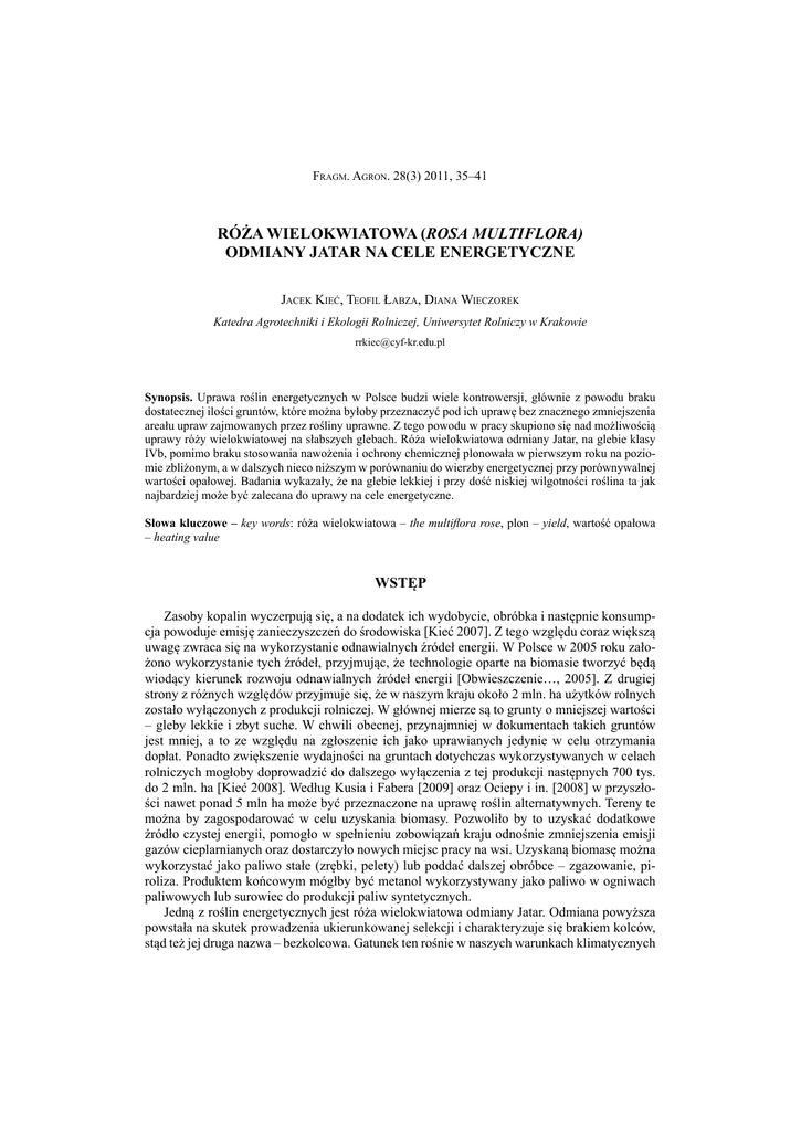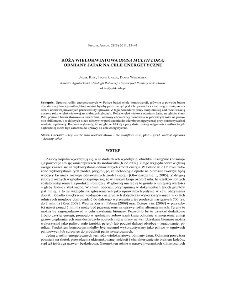 Fragm. Agron. 28(3) 2011, 35–41 RÓŻA WIELOKWIATOWA (ROSA MULTIFLORA) ODMIANY JATAR NA CELE ENERGETYCZNE Jacek Kieć, Teofil Łabza, Diana Wieczorek Katedra Agrotechniki i Ekologii Rolniczej, Uniwersytet Rolniczy w Krakowie [email protected] Synopsis. Uprawa roślin energetycznych w Polsce budzi wiele kontrowersji, głównie z powodu braku dostatecznej ilości gruntów, które można byłoby przeznaczyć pod ich uprawę bez znacznego zmniejszenia areału upraw zajmowanych przez rośliny uprawne. Z tego powodu w pracy skupiono się nad możliwością uprawy róży wielokwiatowej na słabszych glebach. Róża wielokwiatowa odmiany Jatar, na glebie klasy IVb, pomimo braku stosowania nawożenia i ochrony chemicznej plonowała w pierwszym roku na poziomie zbliżonym, a w dalszych nieco niższym w porównaniu do wierzby energetycznej przy porównywalnej wartości opałowej. Badania wykazały, że na glebie lekkiej i przy dość niskiej wilgotności roślina ta jak najbardziej może być zalecana do uprawy na cele energetyczne. Słowa kluczowe – key words: róża wielokwiatowa – the multiflora rose, plon – yield, wartość opałowa – heating value WSTĘP Zasoby kopalin wyczerpują się, a na dodatek ich wydobycie, obróbka i następnie konsumpcja powoduje emisję zanieczyszczeń do środowiska [Kieć 2007]. Z tego względu coraz większą uwagę zwraca się na wykorzystanie odnawialnych źródeł energii. W Polsce w 2005 roku założono wykorzystanie tych źródeł, przyjmując, że technologie oparte na biomasie tworzyć będą wiodący kierunek rozwoju odnawialnych źródeł energii [Obwieszczenie…, 2005]. Z drugiej strony z różnych względów przyjmuje się, że w naszym kraju około 2 mln. ha użytków rolnych zostało wyłączonych z produkcji rolniczej. W głównej mierze są to grunty o mniejszej wartości – gleby lekkie i zbyt suche. W chwili obecnej, przynajmniej w dokumentach takich gruntów jest mniej, a to ze względu na zgłoszenie ich jako uprawianych jedynie w celu otrzymania dopłat. Ponadto zwiększenie wydajności na gruntach dotychczas wykorzystywanych w celach rolniczych mogłoby doprowadzić do dalszego wyłączenia z tej produkcji następnych 700 tys. do 2 mln. ha [Kieć 2008]. Według Kusia i Fabera [2009] oraz Ociepy i in. [2008] w przyszłości nawet ponad 5 mln ha może być przeznaczone na uprawę roślin alternatywnych. Tereny te można by zagospodarować w celu uzyskania biomasy. Pozwoliło by to uzyskać dodatkowe źródło czystej energii, pomogło w spełnieniu zobowiązań kraju odnośnie zmniejszenia emisji gazów cieplarnianych oraz dostarczyło nowych miejsc pracy na wsi. Uzyskaną biomasę można wykorzystać jako paliwo stałe (zrębki, pelety) lub poddać dalszej obróbce – zgazowanie, piroliza. Produktem końcowym mógłby być metanol wykorzystywany jako paliwo w ogniwach paliwowych lub surowiec do produkcji paliw syntetycznych. Jedną z roślin energetycznych jest róża wielokwiatowa odmiany Jatar. Odmiana powyższa powstała na skutek prowadzenia ukierunkowanej selekcji i charakteryzuje się brakiem kolców, stąd też jej druga nazwa – bezkolcowa. Gatunek ten rośnie w naszych warunkach klimatycznych 36 J. Kieć, T. Łabza, D. Wieczorek w stanie dzikim i ma małe wymagania glebowe, zarówno pod względem zasobności jak i odczynu. Dobrze znosi suszę i niskie temperatury, a co najważniejsze jest odporny na patogeny [Kieć 2011]. Wykorzystanie biomasy na cele energetyczne ma prowadzić do obniżenia emisji gazów cieplarnianych oraz zanieczyszczeń do atmosfery, jak również zmniejszenie zanieczyszczenia gleb i wód. Takie warunki mogą spełnić tylko rośliny mało wymagające pod względem agrotechniki. Celem niniejszych badań było sprawdzenie możliwości uprawy róży wielokwiatowej odmiany Jatar w celach energetycznych na glebach słabszych przy ograniczeniu do minimum agrotechniki (brak nawożenia i ochrony chemicznej). MATERIAŁ I METODY Różę wielokwiatową odmiany Jatar wysadzono wiosną w roku 2007, w rozstawie 0,7 m × 0,7 m, na glebie brunatnej, wyługowanej, wytworzonej z utworów fluwioglacjalnych o składzie granulometrycznym piasków słabogliniastych zaliczanej do kompleksu żytniego dobrego i klasy IVb o niskiej zawartości makroelementów (P – 5,6 mg∙kg-1, K – 6,1 mg∙kg-1, Mg – 2,4 mg∙kg-1 oraz N – 0,25 g∙kg-1 gleby) i lekko kwaśnym odczynie (pH w KCl - 5,93). Pole doświadczalne położone w południowej części XV dzielnicy częstochowsko-kieleckiej, na wysokości 265 m.n.p.m było zlokalizowane na terenie stacji doświadczalnej Katedry Agrotechniki i Ekologii Rolniczej w Krakowie – Mydlinikach (50˚05′ N, 19˚51′ E). W czasie trwania doświadczenia nie stosowano żadnego nawożenia ani chemicznej ochrony roślin, aby sprawdzić zasadność uprawy róży wielokwiatowej na słabych glebach przy minimalnych nakładach ponoszonych na wzrost i rozwój tego gatunku. Założenie to jest spowodowane brakiem wystarczającej ilości dobrych i bardzo dobrych gleb, które mogły by być zajmowane zarówno pod uprawę gatunków uprawnych jak i tych uprawianych w celach energetycznych. W roku 2007 ścięto 10 roślin na wysokości około 10 cm nad powierzchnią pola. W latach następnych, aż do roku 2010 w okresie zimowym, na przełomie lutego i marca dokonywano zbioru 10-ciu roślin dwuletnich oraz 10-ciu roślin ciętych co roku. Materiałem badawczym były jednoroczne i dwuletnie pędy róży wielokwiatowej, dla których każdorazowo oznaczono średnią masę pojedynczej rośliny oraz plon świeżej i suchej masy. Ponadto jednorazowo w trakcie trwania doświadczenia na pędach jednorocznych oznaczono: wilgotność, ciepło spalania i wartość opałową oraz zawartość popiołu, węgla, wodoru i siarki. Wilgotność biomasy oznaczono metodą suszarkowo-wagową w temperaturze 105oC. Pozostałe parametry biomasy oznaczono w Katedrze Technologii Paliw Akademii Górniczo-Hutniczej w Krakowie
