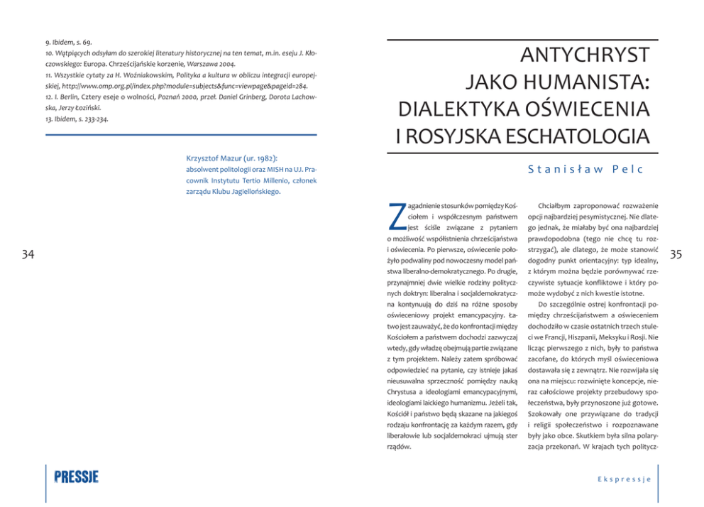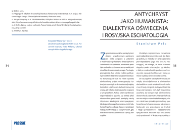 9. Ibidem, s. 69. 10. Wątpiących odsyłam do szerokiej literatury historycznej na ten temat, m.in. eseju J. Kłoczowskiego: Europa. Chrześcijańskie korzenie, Warszawa 2004. 11. Wszystkie cytaty za H. Woźniakowskim, Polityka a kultura w obliczu integracji europejskiej, http://www.omp.org.pl/index.php?module=subjects&func=viewpage&pageid=284. 12. I. Berlin, Cztery eseje o wolności, Poznań 2000, przeł. Daniel Grinberg, Dorota Lachowska, Jerzy Łoziński. 13. Ibidem, s. 233-234. ANTYCHRYST JAKO HUMANISTA: DIALEKTYKA OŚWIECENIA I ROSYJSKA ESCHATOLOGIA Krzysztof Mazur (ur. 1982): absolwent politologii oraz MISH na UJ. Pracownik Instytutu Tertio Millenio, członek zarządu Klubu Jagiellońskiego. Stanisław Pelc Z agadnienie stosunków pomiędzy Koś- 34 ciołem i współczesnym państwem jest ściśle związane z pytaniem o możliwość współistnienia chrześcijaństwa i oświecenia. Po pierwsze, oświecenie położyło podwaliny pod nowoczesny model państwa liberalno-demokratycznego. Po drugie, przynajmniej dwie wielkie rodziny politycznych doktryn: liberalna i socjaldemokratyczna kontynuują do dziś na różne sposoby oświeceniowy projekt emancypacyjny. Łatwo jest zauważyć, że do konfrontacji między Kościołem a państwem dochodzi zazwyczaj wtedy, gdy władzę obejmują partie związane z tym projektem. Należy zatem spróbować odpowiedzieć na pytanie, czy istnieje jakaś nieusuwalna sprzeczność pomiędzy nauką Chrystusa a ideologiami emancypacyjnymi, ideologiami laickiego humanizmu. Jeżeli tak, Kościół i państwo będą skazane na jakiegoś rodzaju konfrontację za każdym razem, gdy liberałowie lub socjaldemokraci ujmują ster rządów. Chciałbym zaproponować rozważenie opcji najbardziej pesymistycznej. Nie dlatego jednak, że miałaby być ona najbardziej prawdopodobna (tego nie chcę tu rozstrzygać), ale dlatego, że może stanowić dogodny punkt orientacyjny: typ idealny, z którym można będzie porównywać rzeczywiste sytuacje konfliktowe i który pomoże wydobyć z nich kwestie istotne. Do szczególnie ostrej konfrontacji pomiędzy chrześcijaństwem a oświeceniem dochodziło w czasie ostatnich trzech stuleci we Francji, Hiszpanii, Meksyku i Rosji. Nie licząc pierwszego z nich, były to państwa zacofane, do których myśl oświeceniowa dostawała się z zewnątrz. Nie rozwijała się ona na miejscu: rozwinięte koncepcje, nieraz całościowe projekty przebudowy społeczeństwa, były przynoszone już gotowe. Szokowały one przywiązane do tradycji i religii społeczeństwo i rozpoznawane były jako obce. Skutkiem była silna polaryzacja przekonań. W krajach tych politycz- Ekspressje 35 ny spór jawił się zatem jako starcie dwóch przeciwstawnych i niemożliwych do pogodzenia potęg. Aby ujrzeć konflikt pomiędzy chrześcijaństwem i oświeceniem w jego największej intensywności, warto przyjrzeć się właśnie tym krajom. Moją uwagę skupiła Rosja, nie tylko ze względu na znaną skłonność Rosjan do uprawiania filozofii ekstremalnej, ale także 36 dlatego, że właśnie tam doszło do szczególnie interesującego ujęcia tego konfliktu w filozofii i literaturze. Rosjanie (Dostojewski, Sołowjow, a potem – już we Francji – Kojève) zrozumieli, że konflikt pomiędzy oboma wielkimi światopoglądami (czy „metanarracjami”) przechodzi przez szereg etapów, których opisanie i uporządkowanie wymaga przyjęcia, że projekt oświeceniowy rozwija się dialektycznie1. Tylko tak można będzie wyjaśnić zaskakujące zerwania i nieciągłości w relacjach z napotykaną przezeń religią. W jednej chwili porozumienie może zostać zastąpione całkowitą sprzecznością i na odwrót. Ta ambiwalencja w relacjach chrześcijaństwo – oświecenie została symbolicznie wyrażona w paradoksalnej postaci Antychrysta humanisty. Antychryst: filantrop, dobroczyńca, a zarazem antychrześcijański buntownik – nowy Prometeusz, filozof i dialektyk, a wreszcie największy mędrzec w historii ludzkości, to postać pojawiająca się bezpośrednio dopiero w Krótkiej opowieści o Antychryście Sołowjowa. Jednak podstawowy zarys jej portretu dał już Dostojewski w swych największych powieściach: Biesach i Braciach Karamazow. W niniejszym tekście podjęto próbę odtworze- nia podstawowych cech tego wizerunku, a następnie skonfrontowania go z nauką Ta ambiwalencja w relacjach chrześcijaństwo – oświecenie została symbolicznie wyrażona w paradoksalnej postaci Antychrysta humanisty. Antychryst: filantrop, dobroczyńca, a zarazem antychrześcijański buntownik – nowy Prometeusz, filozof i dialektyk, a wreszcie największy mędrzec w historii ludzkości. człowieka, który sam pragnął zostać Antychrystem. Chodzi o francuskiego heglistę i – jak się okaże – rosyjskiego eschatologa: Alexandre’a Kojève’a. Zazwyczaj pojmuje się Szatana i jego wysłanników jako osobników będących jak najdalej od chęci obdarowania człowieka szczęściem, zmniejszenia jego cierpień. Uważa się, że jeżeli przedstawiają się jako dobroczyńcy, to są oni oszustami, wciągającymi człowieka w pułapkę. Nie mogą przecież kochać człowieka. W jaki sposób zatem możliwa jest do pomyślenia na gruncie rosyjskiej filozofii religijnej postać Antychrysta dobroczyńcy, który rzeczywiście (a nie tylko pozornie) pragnie zmniejszyć cierpienia człowieka? W jaki sposób filantrop może być Antychrystem? Jego humanizm nie jest wszak zwykłym kłamstwem. Oczywiście Rosjanie nie odchodzą od tego tradycyjnego schematu: że w ofercie Antychrysta zawarty jest jakiś fundamental- ny fałsz. Szatan nie może być faktycznym Zbawicielem ludzkości, jest tylko zbawicielem pozornym. Jednak fałsz zawarty w jego propozycji jest o wiele lepiej ukryty i subtelniejszy, niż zazwyczaj skłonni jesteśmy podejrzewać. Filozofia Dostojewskiego i Sołowjowa pozwala pomyśleć kogoś, kto naprawdę nakarmi głodnych i wybawi ludzkość od wojen (a więc zreal