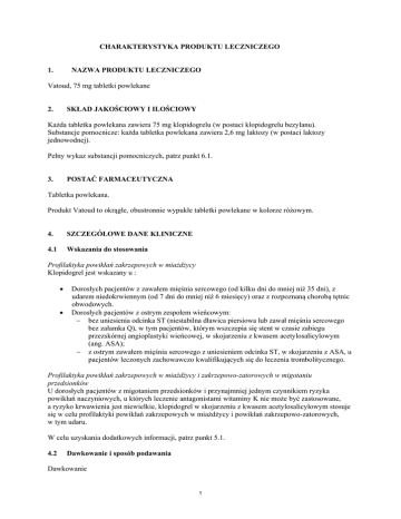 CHARAKTERYSTYKA PRODUKTU LECZNICZEGO 1. NAZWA PRODUKTU LECZNICZEGO Vatoud, 75 mg tabletki powlekane 2. SKŁAD JAKOŚCIOWY I ILOŚCIOWY Każda tabletka powlekana zawiera 75 mg klopidogrelu (w postaci klopidogrelu bezylanu). Substancje pomocnicze: każda tabletka powlekana zawiera 2,6 mg laktozy (w postaci laktozy jednowodnej). Pełny wykaz substancji pomocniczych, patrz punkt 6.1. 3. POSTAĆ FARMACEUTYCZNA Tabletka powlekana. Produkt Vatoud to okrągłe, obustronnie wypukłe tabletki powlekane w kolorze różowym. 4. SZCZEGÓŁOWE DANE KLINICZNE 4.1 Wskazania do stosowania Profilaktyka powikłań zakrzepowych w miażdżycy Klopidogrel jest wskazany u : Dorosłych pacjentów z zawałem mięśnia sercowego (od kilku dni do mniej niż 35 dni), z udarem niedokrwiennym (od 7 dni do mniej niż 6 miesięcy) oraz z rozpoznaną chorobą tętnic obwodowych. Dorosłych pacjentów z ostrym zespołem wieńcowym: bez uniesienia odcinka ST (niestabilna dławica piersiowa lub zawał mięśnia sercowego bez załamka Q), w tym pacjentów, którym wszczepia się stent w czasie zabiegu przezskórnej angioplastyki wieńcowej, w skojarzeniu z kwasem acetylosalicylowym (ang. ASA); z ostrym zawałem mięśnia sercowego z uniesieniem odcinka ST, w skojarzeniu z ASA, u pacjentów leczonych zachowawczo kwalifikujących się do leczenia trombolitycznego. Profilaktyka powikłań zakrzepowych w miażdżycy i zakrzepowo-zatorowych w migotaniu przedsionków U dorosłych pacjentów z migotaniem przedsionków i przynajmniej jednym czynnikiem ryzyka powikłań naczyniowych, u których leczenie antagonistami witaminy K nie może być zastosowane, a ryzyko krwawienia jest niewielkie, klopidogrel w skojarzeniu z kwasem acetylosalicylowym stosuje się w celu profilaktyki powikłań zakrzepowych w miażdżycy i powikłań zakrzepowo-zatorowych, w tym udaru. W celu uzyskania dodatkowych informacji, patrz punkt 5.1. 4.2 Dawkowanie i sposób podawania Dawkowanie 1 Dorośli i osoby w podeszłym wieku Klopidogrel należy podawać w pojedynczej dawce 75 mg na dobę. U pacjentów z ostrym zespołem wieńcowym: bez uniesienia odcinka ST (niestabilna dławica piersiowa lub zawał mięśnia sercowego bez załamka Q): leczenie klopidogrelem należy rozpocząć od pojedynczej dawki nasycającej 300 mg i następnie kontynuować dawką 75 mg raz na dobę (z kwasem acetylosalicylowym (ASA) 75 mg do 325 mg na dobę). Ponieważ większe dawki ASA były związane z większym ryzykiem krwawienia, zaleca się, żeby dawka ASA nie była większa niż 100 mg. Optymalny czas trwania leczenia nie został wyraźnie ustalony. Dane z badań klinicznych potwierdzają stosowanie do 12 miesięcy, a maksymalnie korzystny efekt obserwowano po 3 miesiącach (patrz punkt 5.1); z ostrym zawałem mięśnia sercowego z uniesieniem odcinka ST: leczenie klopidogrelem należy rozpocząć od dawki nasycającej 300 mg, a następnie podawać dawkę 75 mg raz na dobę w skojarzeniu z ASA i lekami trombolitycznymi lub bez leków trombolitycznych. U pacjentów powyżej 75. roku życia leczenie klopidogrelem należy rozpocząć bez podawania dawki nasycającej. Leczenie skojarzone należy rozpocząć jak najszybciej po wystąpieniu objawów i kontynuować przez co najmniej 4 tygodnie. Nie badano korzyści z jednoczesnego stosowania klopidogrelu i ASA w okresie powyżej 4 tygodni w tym modelu leczenia (patrz punkt 5.1). U pacjentów z migotaniem przedsionków, klopidogrel należy podawać w postaci pojedynczej dawki dobowej 75 mg. Równocześnie należy rozpocząć i kontynuować stosowanie kwasu acetylosalicylowego (75-100 mg na dobę) (patrz punkt 5.1). Jeśli dawka zostanie pominięta: Przed upływem mniej niż 12 godzin od planowanego czasu przyjęcia dawki: pacjent powinien przyjąć pominiętą dawkę niezwłocznie i potem przyjąć następną dawkę w przewidzianym czasie. Po upływie więcej niż 12 godzin: pacjent powinien przyjąć kolejną dawkę w przewidzianym czasie i nie powinien przyjmować dawki podwójnej. Dzieci i młodzież Klopidogrelu nie należy stosować u dzieci, ze względu na wątpliwości dotyczące jego skuteczności (patrz punkt 5.1). Zaburzenie czynności nerek Doświadczenie terapeutyczne u pacjentów z zaburzeniami czynności nerek jest ograniczone (patrz punkt 4.4). Zaburzenie czynności wątroby Doświadczenie terapeutyczne u pacjentów z umiarkowanie nasilonymi chorobami wątroby, którzy mogą mieć skłonność do krwawień jest ograniczone (patrz punkt 4.4). Sposób podawania Podania doustne Produkt leczniczy może być przyjmowany jednocześnie z posiłkiem lub niezależnie od posiłku. 4.3 Przeciwwskazania Nadwrażliwość na substancję czynną lub na którąkolwiek substancję pomocniczą. Ciężkie zaburzenie czynności wątroby. Czynne patologiczne krwawienie, takie jak wrzód trawienny lub krwotok wewnątrzczaszkowy. 2 4.4 Specjalne ostrzeżenia i środki ostrożności dotyczące stosowania Krwawnienie i zaburzenia hematologiczne Z powodu ryzyka krwawienia i hematologicznych działań niepożądanych należy niezwłocznie rozważyć oznaczenie morfologii krwi i (lub) inne odpowiednie badania, kiedy tylko objawy kliniczne sugerujące wystąpienie krwawienia pojawią się podczas leczenia (patrz punkt 4.8). Podobnie jak w przypadku innych leków przeciwpłytkowych, należy zachować ostrożność stosując klopidogrel u pacjentów, którzy mogą być obciążeni ryzykiem wystąpienia większego krwawienia z powodu urazu, zabiegu chirurgicznego lub innych stanów patologicznych, i u pacjentów otrzymujących ASA, heparynę, inhibitory glikoprotein IIb/IIIa oraz niesteroidowe leki przeciwzapalne (NLPZ), w tym inhibitory Cox-2. Pacjentów należy dokładnie obserwować ze względu na wystąpienie jakichkolwiek objawów krwawienia, włącznie z krwawieniem utajonym, zwłaszcza podczas pierwszych tygodni leczenia i (lub) po inwazyjnych zabiegach kardiologicznych lub po zabiegu chirurgicznym. Jednoczesne stosowanie klopidogrelu i doustny