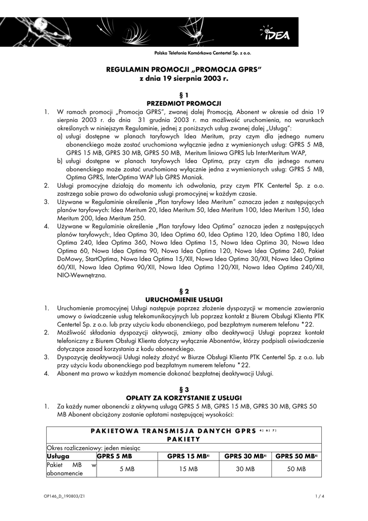 REGULAMIN PROMOCJI „PROMOCJA GPRS” z dnia 19 sierpnia 2003 r. 1. 2. 3. 4. 1. 2. 3. 4. 1. §1 PRZEDMIOT PROMOCJI W ramach promocji „Promocja GPRS”, zwanej dalej Promocją, Abonent w okresie od dnia 19 sierpnia 2003 r. do dnia 31 grudnia 2003 r. ma możliwość uruchomienia, na warunkach określonych w niniejszym Regulaminie, jednej z poniższych usług zwanej dalej „Usługą”: a) usługi dostępne w planach taryfowych Idea Meritum, przy czym dla jednego numeru abonenckiego może zostać uruchomiona wyłącznie jedna z wymienionych usług: GPRS 5 MB, GPRS 15 MB, GPRS 30 MB, GPRS 50 MB, Meritum liniowa GPRS lub InterMeritum WAP, b) usługi dostępne w planach taryfowych Idea Optima, przy czym dla jednego numeru abonenckiego może zostać uruchomiona wyłącznie jedna z wymienionych usług: GPRS 5 MB, Optima GPRS, InterOptima WAP lub GPRS Maniak. Usługi promocyjne działają do momentu ich odwołania, przy czym PTK Centertel Sp. z o.o. zastrzega sobie prawo do odwołania usługi promocyjnej w każdym czasie. Używane w Regulaminie określenie „Plan taryfowy Idea Meritum” oznacza jeden z następujących planów taryfowych: Idea Meritum 20, Idea Meritum 50, Idea Meritum 100, Idea Meritum 150, Idea Meritum 200, Idea Meritum 250. Używane w Regulaminie określenie „Plan taryfowy Idea Optima” oznacza jeden z następujących planów taryfowych:, Idea Optima 30, Idea Optima 60, Idea Optima 120, Idea Optima 180, Idea Optima 240, Idea Optima 360, Nowa Idea Optima 15, Nowa Idea Optima 30, Nowa Idea Optima 60, Nowa Idea Optima 90, Nowa Idea Optima 120, Nowa Idea Optima 240, Pakiet DoMowy, StartOptima, Nowa Idea Optima 15/XII, Nowa Idea Optima 30/XII, Nowa Idea Optima 60/XII, Nowa Idea Optima 90/XII, Nowa Idea Optima 120/XII, Nowa Idea Optima 240/XII, NIO-Wewnętrzna. §2 URUCHOMIENIE USŁUGI Uruchomienie promocyjnej Usługi następuje poprzez złożenie dyspozycji w momencie zawierania umowy o świadczenie usług telekomunikacyjnych lub poprzez kontakt z Biurem Obsługi Klienta PTK Centertel Sp. z o.o. lub przy użyciu kodu abonenckiego, pod bezpłatnym numerem telefonu *22. Możliwość składania dyspozycji aktywacji, zmiany albo deaktywacji Usługi poprzez kontakt telefoniczny z Biurem Obsługi Klienta dotyczy wyłącznie Abonentów, którzy podpisali oświadczenie dotyczące zasad korzystania z kodu abonenckiego. Dyspozycję deaktywacji Usługi należy złożyć w Biurze Obsługi Klienta PTK Centertel Sp. z o.o. lub przy użyciu kodu abonenckiego pod bezpłatnym numerem telefonu *22. Abonent ma prawo w każdym momencie dokonać bezpłatnej deaktywacji Usługi. §3 OPŁATY ZA KORZYSTANIE Z USŁUGI Za każdy numer abonencki z aktywną usługą GPRS 5 MB, GPRS 15 MB, GPRS 30 MB, GPRS 50 MB Abonent obciążony zostanie opłatami następującej wysokości: PAKIETOWA TRANSMISJA DANYCH GPRS 4) 6) 7) PAKIETY Okres rozliczeniowy: jeden miesiąc Usługa GPRS 5 MB GPRS 15 MB8) GPRS 30 MB8) GPRS 50 MB8) Pakiet MB w 5 MB 15 MB 30 MB 50 MB abonamencie OP146_D_190803/Z1 1/4 PTK Centertel Sp. z o. o. Abonament miesięczny 1) Opłata za dodatkowy 1 MB 2) 3) 24,00 zł (25,68 zł z 65,00 zł (69,55 zł z 120,00 zł (128,40 VAT) 5) VAT) 5) zł z VAT)5) 4,80 zł (5,14 zł z VAT)5) 4,33 zł (4,63 zł z VAT) 5) 190,00 zł (203,30 zł z VAT)5) 4,00 zł (4,28 zł z 3,80 zł (4,07 zł z VAT)5) VAT)5) 1) Abonament obejmuje opłatę za możliwość realizowania pakietowej transmisji danych oraz pakiet bezpłatnych megabajtów danych. 2) Opłata jest pobierana za ilość wysłanych i odebranych danych, a nie za czas połączenia. 3) Opłata jest pobierana za każdy rozpoczęty megabajt danych. 4) Opłata dotyczy dostępu do usługi WAP Idea w ramach sesji GPRS przy ustawieniach APN: wap.idea.pl, dostępu do Internetu w ramach sesji GPRS przy ustawieniach APN: www.idea.pl oraz dostępu do APNów firmowych. APN oznacza nazwę punktu dostępu do sieci GPRS. 5) Usługa jest objęta podatkiem VAT w wysokości 7%. Zwolnione od podatku VAT są usługi dostępu do sieci Internet świadczone na rzecz szkół, zakładów kształcenia nauczycieli, placówek oświatowych, szkół wyższych, wyższych szkół zawodowych i placówek naukowych Polskiej Akademii Nauk. 6) Minimalna jednostka taryfikacyjna wynosi 10 kB. Taryfikacja za wysyłanie i odbieranie danych w ramach sesji GPRS rozliczana jest oddzielnie. 7) Zmiana pakietu GPRS możliwa jest w dowolnym momencie, nie częściej jednak niż raz w ciągu danego okresu rozliczeniowego. Zmiana obowiązuje od następnego okresu rozliczeniowego. 8) Usługa dostępna jedynie w ofercie Idea Meritum. 2. Za każdy numer abonencki z aktywną usługą Optima GPRS lub Meritum liniowa GPRS Abonent obciążony zostanie opłatami następującej wysokości: PAKIETOWA TRANSMISJA DANYCH GPRS (Optima GPRS / Meritum GPRS) taryfa liniowa Okres rozliczeniowy: jeden miesiąc Opłata za Abonament Opłata za minutę Opłata za Usługa udostępnienie miesięczny połączenia zdarzenie Optima GPRS / Meritum liniowa 0,27zł (0,29 GPRS 1) zł z VAT) 2) 3) 1) 2) 3) Opłata dotyczy dostępu do usługi WAP Idea w ramach sesji GPRS przy ustawieniach APN: wap.idea.pl, dostępu do Internetu w ramach sesji GPRS przy ustawieniach APN: www.idea.pl oraz dostępu do APNów firmowych. APN oznacza nazwę punktu dostępu do sieci GPRS. Usługa jest objęta podatkiem VAT w wysokości 7%. Zwolnione od podatku VAT są usługi dostępu do sieci Internet świadczone na rzecz szkół, zakładów kształcenia nauczycieli, placówek oświatowych, szkół wyższych, wyższych szkół zawodowych i placówek naukowych Polskiej Akademii Nauk. Opłata jest pobierana za każde rozpoczęte 10 kB połączenia z WAP Idea lub każde rozpoczęte 50 kB połączenia z Internetem. Opłata za wysyłanie i odbieranie danych w ramach sesji GPRS naliczana jest oddzielnie. OP146_D_190803/Z1 2/4 PTK Centertel Sp. z o. o. 3. Za każdy numer abonencki z aktywną usługą InterMeritum WAP lub InterOptima WAP Abonent obciążony zostanie opł