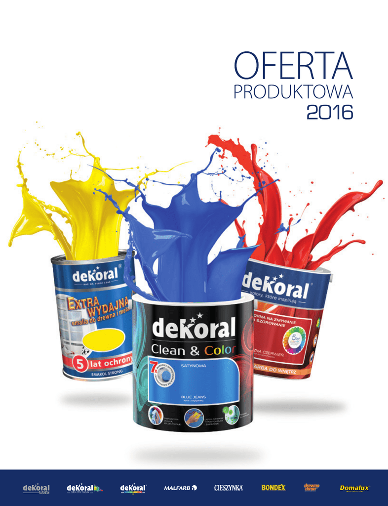 2016 Akrylowy lakier transparentny, 4 Power Paint Colour & Style, 5 Diamentowa Kolekcja, 6 Włoskie Impresje, 7 Clean & Color, 10 Akrylit W kolor, 11 Łazienka & Kuchnia, 12 Polinit akrylowa farba fasadowa, 13 Akrylit W śnieżnobiała, 14 Antyrefleksyjna farba akrylowa Polinak Plus, 15 Łazienka & Kuchnia, 16 Polinit biały akrylowa farba fasadowa, 17 Emakol Strong, 18 Akrylux emalia akrylowa, 19 Emalia antykorozyjna, 20 Chlorokauczuk Strong, 21 Fawinyl C, 22 Akrylit B, 23 Renostyl Plus, 24 Emalia luksusowa, 25 Emalia do kaloryferów, 26 Podkładowa farba gruntująca, 27 Grunt lateksowy, 27 Gruntomal, 29 Aquagrunt koncentrat, 30 Akrogrunt, 31 Podkład antykorozyjny, 32 Rozcieńczalniki, 33 Odporna na szorowanie farba lateksowa, 36 Odporna na szorowanie farba lateksowa satynowa, 37 Tester koloru, 38 Silikonowana farba do elewacji, 39 Emalia akrylowa do drewna i metalu, 40 Emalia alkidowa do drewna i metalu, 41 Pastel Color Baza systemu kolorowania, 42 Akryl Color Baza systemu kolorowania, 53 Pastel Color Baza systemu kolorowania, 46 Ultra Biała, 47 Extra Biała, 48 Akryl W Plus, 49 MF-42 Farba akrylowo-lateksowa wewnętrzna (baza), 50 Akryl Color, 51 Akryl Color Baza systemu kolorowania, 52 Winyl Z, 53 Akryl Z MF-41 (baza), 54 Fasadowa MF-21 (baza), 55 Farba silikatowo-silikonowa MF-31, 56 Farba podkładowa, 57 Reno Grunt, 58 Aktiv Grunt, 59 Grunt szczepny, 60 Lakier lamperyjny, 61 Tynk akrylowy Taurus Baranek MT-42, 63 Masa podkładowa pod tynk Taurus MT-45, 64 Tynk silikatowo-silikonowy Taurus Baranek MT-32, 64 Tynk silikonowy Taurus Baranek MT-22, 65 Tynk mozaikowy, 66 Impregnat Extra powłokotwórczy, 70 Impregnat Grunt, 71 Impregnat Express Ogród, 72 Lakierobejca Extra, 73 Lakierobejca 2w1, 74 Lakierobejca żelowa, 75 Pokost lniany, 76 Olej do drewna, 77 Lakier jachtowy, 78 Smart Paint, 82 Super Wall Dyroton 6, 83 Wood PreserverATC, 84 Wood Stain, 85 Strong Wood Protection, 86 Lazura Uniwersalna, 87 Satin Finish, 88 Super Wood Stain, 89 Extreme Oil, 90 Acrylic Enamel, 91 Primer, 92 Usuwacz uniwersalny, 93 Domalux Classic Silver, 96 Domalux Extra Hard, 97 Domalux Capon Extra, 98 Domalux Capon Szpachla, 99 Domalux Parkiet Ekspert (Bezpodkładowy), 100 Farba do podłóg Alkosol, 101 Domalux Szybkoschnący, 102 Domalux Bezzapachowy, 103 Domalux Alkilak, 104 Cieszynka plus, 108 Cieszynka standard, 109 Cieszynka emalia, 110 Perfect White, 114 DEKORAL FASHION DEKORAL DEKORAL COLOR SYSTEM www.dekoralfashion.pl |3 OFERTA STUDIO DEKORAL CIESZYNKA DOMALUX BONDEX DREWNOCHRON MALFARB Akrylowy lakier transparentny, 4 Power Paint Colour & Style, 5 Diamentowa Kolekcja, 6 Włoskie Impresje, 7 DEKORAL FASHION DEKORAL DEKORAL COLOR SYSTEM Dzięki swoim właściwościom ochronnym lakier może być stosowany wszędzie tam, gdzie chcemy uzyskać łatwe do utrzymania w czystości, w pełni odporne na szorowanie powierzchnie. Szczególnie polecany jest do pomieszczeń intensywnie użytkowanych takich jak pokoje dziecięce, korytarze, klatka schodowa oraz do obiektów użyteczności publicznej, tj. szkoły, przedszkola, obiekty służby zdrowia. DREWNOCHRON Akrylowy lakier transparentny dekoracja i ochrona służy do osiągania oryginalnych efektów dekoracyjnych wewnątrz pomieszczeń na powierzchniach uprzednio pomalowanych odpornymi na szorowanie farbami marki Dekoral Fashion np. Colour & Style, Hypoalergiczna, szorowalna farba lateksowa. MALFARB AKRYLOWY LAKIER TRANSPARENTNY 10 DO METRÓW KWADRATOWYCH WYDAJNOŚĆ Z OPAK. 1 LITR Parametry techniczne Wydajność przy jednej warstwie w zależności od chłonności podłoża Wygląd powłoki Lepkość Brookfield RVT, 20±2°C BONDEX Gęstość, 20±0,5°C do 10 m2/l satynowy Nanoszenie drugiej warstwy 1,01÷1,04 g/cm3 1÷2 2 godziny po 2 godzinach Sposób nanoszenia Rekomendowane narzędzia marki Dekoral Gold DOMALUX Dostępne pojemności OFERTA STUDIO DEKORAL CIESZYNKA Polecany do malowania lamperii. Lakier doskonale spełnia też rolę dekoracyjną – wydobywa głębię i nasycenie koloru nadając satynowe wykończenie. Limit zawartości LZO wg Dyrektywy 2004/42/WE dla tego produktu (kat. A/e): 130 g/l. Produkt ten zawiera maks. 130 g/l VOC. www.dekoralfashion.pl S AT Y N O W Y P O ŁY S K wałek Wałek Microfibre, Wałek Microstar Rozcieńczalnik 4| ODPORNOŚĆ N A S Z O R O WA N I E 6000÷10000 mPas Liczba warstw Czas schnięcia powłoki, 23±2°C DOSKONAŁA woda 1l W Y D O B Y WA GŁĘBIĘ K O L O R U U Ł A T W I A UTRZYMANIE Ś C I A N W CZYSTOŚCI DEKORAL FASHION DEKORAL DO 30 METRÓW KWADRATOWYCH WYDAJNOŚĆ Z OPAK. 2,5 LITRA MALFARB Farba lateksowa przeznaczona do dekoracyjnego malowania ścian i sufitów wewnątrz pomieszczeń wykonanych z tynków cementowych, betonu, gipsu lub płyt gipsowo-kartonowych. Również do malowania przedmiotów z drewna, drewnopochodnych, stalowych, żeliwnych oraz kaloryferów. Zastosowanie wysokogatunkowych dyspersji umożliwia prawidłowe oddychanie ścian. DEKORAL COLOR SYSTEM POWER PAINT COLOUR & STYLE Parametry techniczne Wydajność przy jednej warstwie w zależności od chłonności podłoża i intensywności koloru do 12 m2/l matowa Lepkość Brookfield RVT, 20±2°C DREWNOCHRON Wygląd powłoki ODPORNA NA ZABRUDZENIA 12000÷25000 mPas 1,27÷1,41 g/cm3 Gęstość, 20±0,5°C Zawartość części stałych co najmniej 45% wagi Odporność na szorowanie wg PN-EN 13300 klasa 1 Liczba warstw PRZYJAZNA DLA ALERGIKÓW 1÷2 2 godziny Nanoszenie drugiej warstwy po 4 godzinach Rekomendowane narzędzia Wałek Microfibre, Wałek Polyamide marki Dekoral Gold Magic Rozcieńczalnik woda ODPORNOŚĆ NA SZOROWANIE 2,5 l SUPER czystość bieli miękki welur lniany zaułek aksamitny dotyk chiński jedwab kwiat bawełny szlachetna glinka bezmiar przestrzeni szczotkowana stal antracytowa struktura pachnąca orchidea zapach orientu ogród japoński powiew luksusu czysta forma naturalny piaskowiec światła neonów elektryzujący oranż wysokie obcasy geometryczna lekkość trawa morska lodowe mohito harmonijna zieleń szklana t