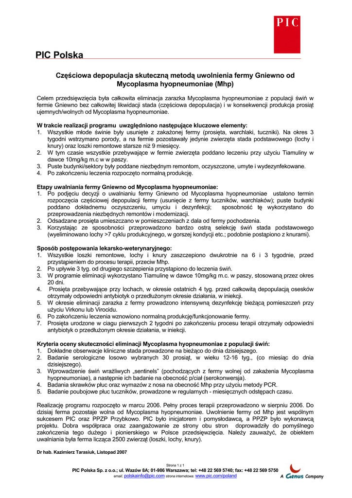 PIC Polska Częściowa depopulacja skuteczną metodą uwolnienia fermy Gniewno od Mycoplasma hyopneumoniae (Mhp) Celem przedsięwzięcia była całkowita eliminacja zarazka Mycoplasma hyopneumoniae z populacji świń w fermie Gniewno bez całkowitej likwidacji stada (częściowa depopulacja) i w konsekwencji produkcja prosiąt ujemnych/wolnych od Mycoplasma hyopneumoniae. W trakcie realizacji programu uwzględniono następujące kluczowe elementy: 1. Wszystkie młode świnie były usunięte z zakażonej fermy (prosięta, warchlaki, tuczniki). Na okres 3 tygodni wstrzymano porody, a na fermie pozostawały jedynie zwierzęta stada podstawowego (lochy i knury) oraz loszki remontowe starsze niż 9 miesięcy. 2. W tym czasie wszystkie przebywające w fermie zwierzęta poddano leczeniu przy użyciu Tiamuliny w dawce 10mg/kg m.c w w paszy. 3. Puste budynki/sektory były poddane niezbędnym remontom, oczyszczone, umyte i wydezynfekowane. 4. Po zakończeniu leczenia rozpoczęto normalną produkcję. Etapy uwalniania fermy Gniewno od Mycoplasma hyopneumoniae: 1. Po podjęciu decyzji o uwalnianiu fermy Gniewno od Mycoplasma hyopneumoniae ustalono termin rozpoczęcia częściowej depopulacji fermy (usunięcie z fermy tuczników, warchlaków); puste budynki poddano dokładnemu oczyszczeniu, umyciu i dezynfekcji; sposobność tę wykorzystano do przeprowadzenia niezbędnych remontów i modernizacji. 2. Odsadzane prosięta umieszczano w pomieszczeniach z dala od fermy pochodzenia. 3. Korzystając ze sposobności przeprowadzono bardzo ostrą selekcję świń stada podstawowego (wyeliminowano lochy >7 cyklu produkcyjnego, w gorszej kondycji etc.; podobnie postąpiono z knurami). Sposób postępowania lekarsko-weterynaryjnego: 1. Wszystkie loszki remontowe, lochy i knury zaszczepiono dwukrotnie na 6 i 3 tygodnie, przed przystąpieniem do procesu terapii, przeciw Mhp. 2. Po upływie 3 tyg. od drugiego szczepienia przystąpiono do leczenia świń. 3. W programie eliminacji wykorzystano Tiamulinę w dawce 10mg/kg m.c. w paszy, stosowaną przez okres 20 dni. 4. Prosięta przebywające przy lochach, w okresie ostatnich 4 tyg. przed całkowitą depopulacją osesków otrzymały odpowiedni antybiotyk o przedłużonym okresie działania, w iniekcji. 5. W okresie eliminacji zarazka z fermy prowadzono intensywną dezynfekcję bieżącą pomieszczeń przy użyciu Virkonu lub Virocidu. 6. Po zakończeniu leczenia wznowiono normalną produkcję/funkcjonowanie fermy. 7. Prosięta urodzone w ciagu pierwszych 2 tygodni po zakończeniu procesu terapii otrzymały odpowiedni antybiotyk o przedłużonym okresie działania, w iniekcji. Kryteria oceny skuteczności eliminacji Mycoplasma hyopneumoniae z populacji świń: 1. Dokładne obserwacje kliniczne stada prowadzone na bieżąco do dnia dzisiejszego. 2. Badanie serologiczne losowo wybranych 30 prosiąt, w wieku 12-16 tyg., (co miesiąc do dnia dzisiejszego). 3. Wprowadzenie świń wrażliwych „sentinels” (pochodzących z fermy wolnej od zakażenia Mycoplasma hyopneumoniae), a następnie ich badanie na obecność p/ciał (serokonwersja). 4. Badania skrawków płuc oraz wymazów z nosa na obecność Mhp przy użyciu metody PCR. 5. Badanie poubojowe płuc tuczników, prowadzone w regularnych - miesięcznych odstępach czasu. Realizację programu rozpoczęto w marcu 2006. Pełny proces terapii przeprowadzono w sierpniu 2006. Do dzisiaj ferma pozostaje wolna od Mycoplasma hyopneumoniae. Uwolnienie fermy od Mhp jest wspólnym sukcesem PIC oraz PPZP Przybkowo. PIC było inicjatorem i pomysłodawcą, a PPZP było wykonawcą projektu. Dobra współpraca oraz zaangażowanie ze strony obu stron doprowadziły do pomyślnego zakończenia tego dużego i pionierskiego w Polsce przedsięwzięcia. Należy zauważyć, że obiektem uwalniania była ferma licząca 2500 zwierząt (loszki, lochy, knury). Dr hab. Kazimierz Tarasiuk, Listopad 2007 Strona 1 z 1 PIC Polska Sp. z o.o.; ul. Wazów 8A; 01-986 Warszawa; tel: +48 22 569 5740; fax: +48 22 569 5750 email: [email protected] strona internetowa: www.pic.com/poland