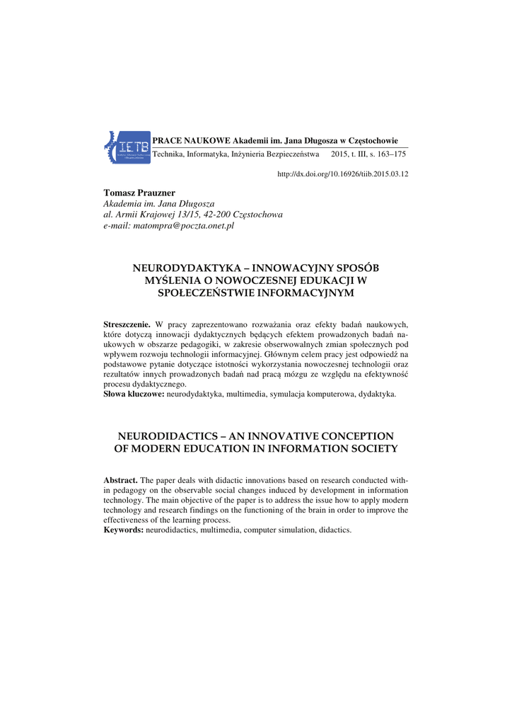 PRACE NAUKOWE Akademii im. Jana Długosza w Cz stochowie Technika, Informatyka, In ynieria Bezpiecze stwa 2015, t. III, I, s. 163–175 163 http://dx.doi.org/10.16926/tiib.2015.03. http://dx.doi.org/10.16926/tiib.2015.03.12 Tomasz Prauzner Akademia im. Jana Długosza al. Armii Krajowej 13/15, 42-200 42 Cz stochowa e-mail: mail: [email protected] NEURODYDAKTYKA – INNOWACYJNY SPOSÓB MY LENIA O NOWOCZESNEJ NOWOCZESN EDUKACJI W SPOŁECZE STWIE INFORMACYJNYM Streszczenie. W pracy zaprezentowano rozwa ania oraz efekty bada naukowych, naukowych które dotycz innowacji dydaktycznych b d cych efektem prowadzonych bada naukowych w obszarze pedagogiki edagogiki, w zakresie obserwowalnych zmian społecznych pod wpływem rozwoju technologii informacyjnej. Głównym celem pracy jest odpowied na podstawowe pytanie dotycz ce istotno ci wykorzystania nowoczesnej technologii oraz rezultatów innych prowadzonych bada ba nad prac mózgu ze wzgl du na efektywno procesu dydaktycznego. Słowa kluczowe: neurodydaktyka, multimedia, symulacja komputerowa, dydaktyka. dydaktyka NEURODIDACTICS – AN INNOVATIVE CONCEPTION TION OF MODERN EDUCATION IN IN INFORMATION SOCIETY SOCIET Abstract. The paper deals with didactic innovations based on research conducted conducted withwit in pedagogy on the observable social changes induced induced by development in information technology. The main objective of the paper is to address address the issue how to apply modern technology and research ch findings on the functioning of the brain in order order to improve the effectiveness of the learning process. Keywords: neurodidactics, multimedia, computer simulation, didactics. di 168 T. Prauzner Wst p Nikt z nas nie został nauczony chodzenia, my nauczyli my si chodzi . Ale nikt z nas nie nauczył si chodzi sam. Anonim Rozwa ania poruszanego tematu nale y rozpocz od stwierdzenia, i rozwój cywilizacji jest procesem niezwykle dynamicznym [14, 24]. Co wi cej, zachodz ce zmiany s niekiedy trudne do przewidzenia, a wi c w yciu nic nie jest stałe i trwałe, a jedynie płynne. Ta metamorfoza jest powszechnie uznawana za innowacyjno w naszych poczynaniach. Przykładem mo e by chocia by zmiana modelu wychowania i kształcenia, jak e odmiennego ni jeszcze dwadzie cia czy trzydzie ci lat temu. Obecny model wychowania1 oraz kształcenia jest przede wszystkim efektem zmieniaj cych si warunków bytowych społecze stwa oraz zacierania si granic kulturowych na wiecie [4, 8, 12, 18]. W tej ewolucji, najistotniejsz rol odgrywa rewolucja technologiczna, a dokładnie informatyczna. Cyfrowi tubylcy czy dzieci sieci – to coraz cz ciej pojawiaj ce si nowe okre lenia nowej subkultury pokolenia. Internet to obecnie najpot niejsze medium, a jeszcze do niedawna była nim prasa, telewizja czy radio. Interaktywno pracy w sieci informatycznej zdominowała wszelkie inne warto ci pozostałych mediów. Zaobserwowano, i pod wpływem Internetu u cyfrowych tubylców obserwuje si zmiany w pracy mózgu. Wykształciły si dwa gatunki człowieka: homo legens – człowiek czytaj cy, korzystaj cy z dobrodziejstw kultury opartej na no nikach tradycyjnych oraz człowiek sieci – homo irretitus. Homo irretitus jest otoczony sieci nowych technologii daj cych mu nowe znaczenie funkcjonalno ci w społecze stwie tzw. online [13]. W społecze stwie informacyjnym młody człowiek staje si aktywnym uczestnikiem dwóch wiatów: realnego – wspomaganego przez technologie informatyczne oraz wirtualnego – sztucznego, jednak dla osób online uznawalnego za ten najistotniejszy i warto ciowy. Model społecze stwa obywatelskiego, w którym funkcjonuje homo irretitus, opiera si na kilku regułach: − komunikacja i stosunki mi dzyludzkie s w ogromnym stopniu zdominowane przez nowe media; − media masowe tworz wirtualn rzeczywisto i kultur medialn ; − obieg informacji o ró nej skali odbywa si poprzez sie teleinformatyczn ; Wychowanie w uj ciu tematyki pracy nale y przede wszystkim interpretowa jako nowy model postawy młodego człowieka w stosunku do aktywno ci edukacyjnej, ze wzgl du na atrakcyjno komunikacyjn tzw. mass mediów. Neurodydaktyka… 169 − wszystkie formy aktywno ci ludzkiej (w tym poznawczej, najistotniejszej z punktu dydaktyki) s wspomagane przez formy medialno-teleinformatyczne; − narz dzia medialne i teleinformatyczne staj si wa nym elementem wpływaj cym na stan gospodarki i zatrudnienia. [32] Dyskusja Linda Gottfredson, ameryka ska psycholog, zauwa yła, e mamy obecnie do czynienia z tzw. przesuni ciem poznawczym. Klasyczna umiej tno np. czytania oraz pisania r cznego zaczyna zanika , a w to miejsce wchodz czynno ci operacyjne a mianowicie: szybko działania [27]. Przykładem skrajno ci tych zmian mo e by chocia by ostatnia zapowied Minny Harmanen z Narodowej Rady ds. Edukacji: „ [...] w Finlandii od jesieni 2016 roku zniesiona zostanie w szkołach nauka pisania odr cznego i kaligrafii, a zamiast nich wprowadzona zostanie technika maszynopisania. Jest ono bowiem coraz istotniejsze w codziennym yciu […]”. Konsekwencje tego typu zachowa s mi dzy innymi takie, i mamy drastyczny spadek znajomo ci j zyka, słów natomiast obecna forma prowadzonych zaj przez wykładowców czy nauczycieli jest mało interesuj ca a wr cz niezrozumiała dla młodzie y. Nicholas Carr [1, 2], znany z ksi ki Płytki umysł. Jak internet wpływa na nasz mózg zauwa ył, e pod wpływem Internetu co dziesi lat w krajach wysokorozwini tych inteligencja ro nie tylko o około trzy punkty w skali IQ i wykazuje tendencj spadkow . Według znanego ameryka skiego psychologa Raymonda Cattella, inteligencja ludzka składa si z dwóch składników: inteligencji płynnej (wrodzonej, genetycznej) oraz inteligencji skrystalizowanej (wyuczonej, opartej na zdobytej wiedzy i umiej tno ciach) [3]. Pomimo wi kszych nakładów finansowych na edukacj , wydaje si , i obecnie u człowieka potencjał intelektualny maleje [8]. Dlatego, bior c pod uwag konsekwencje ci głej pracy w Internecie, nauczyciel